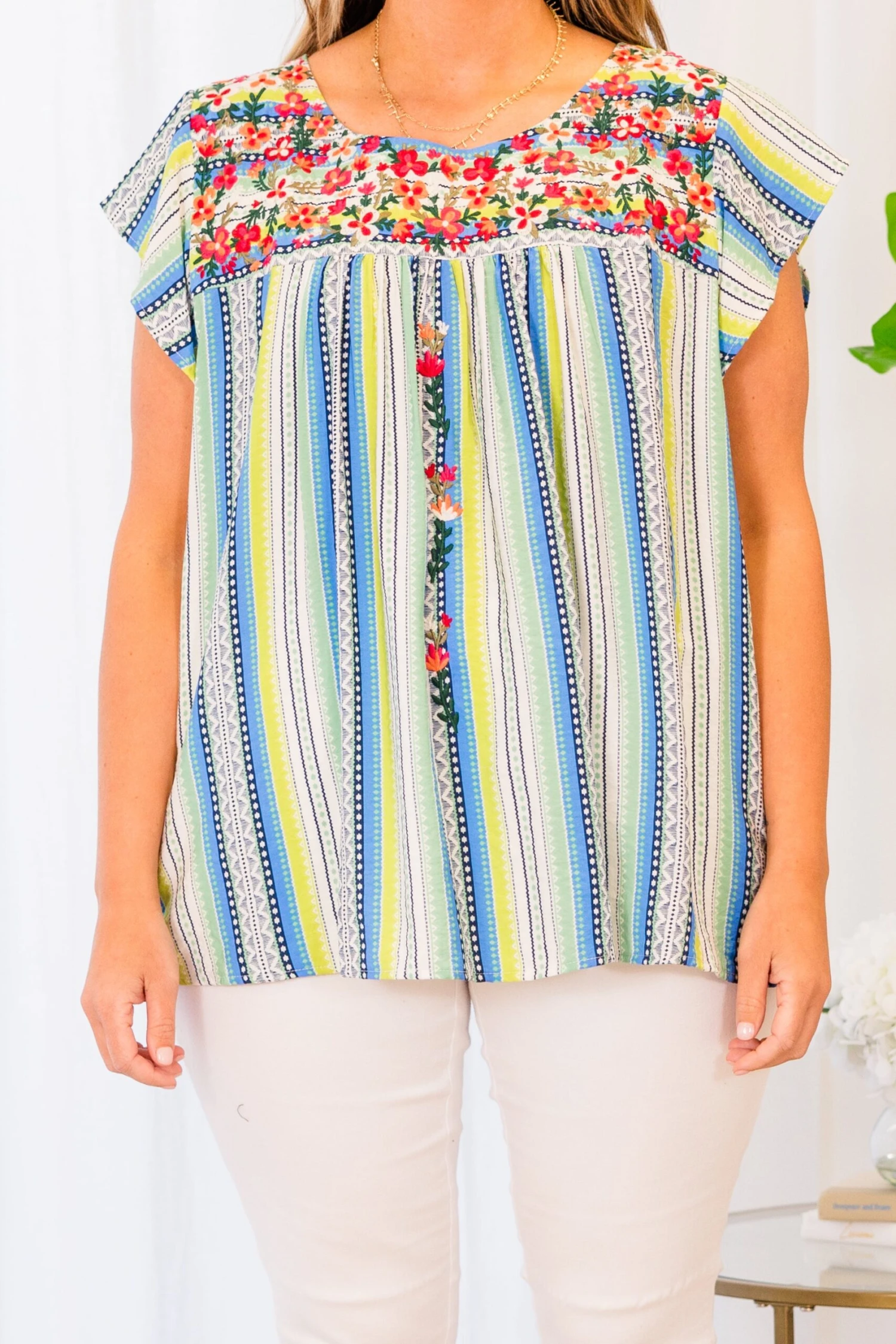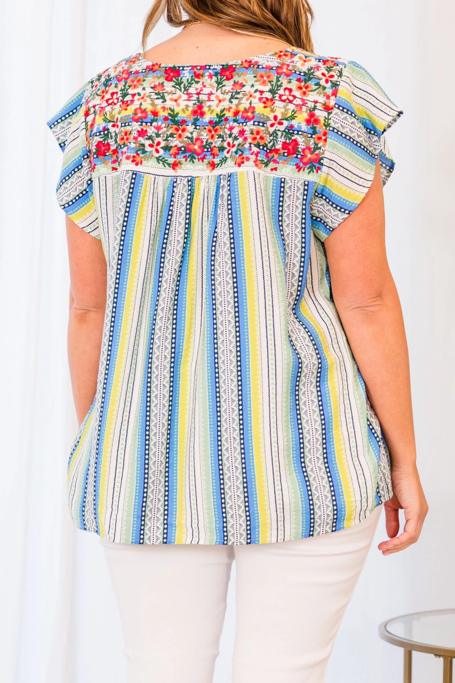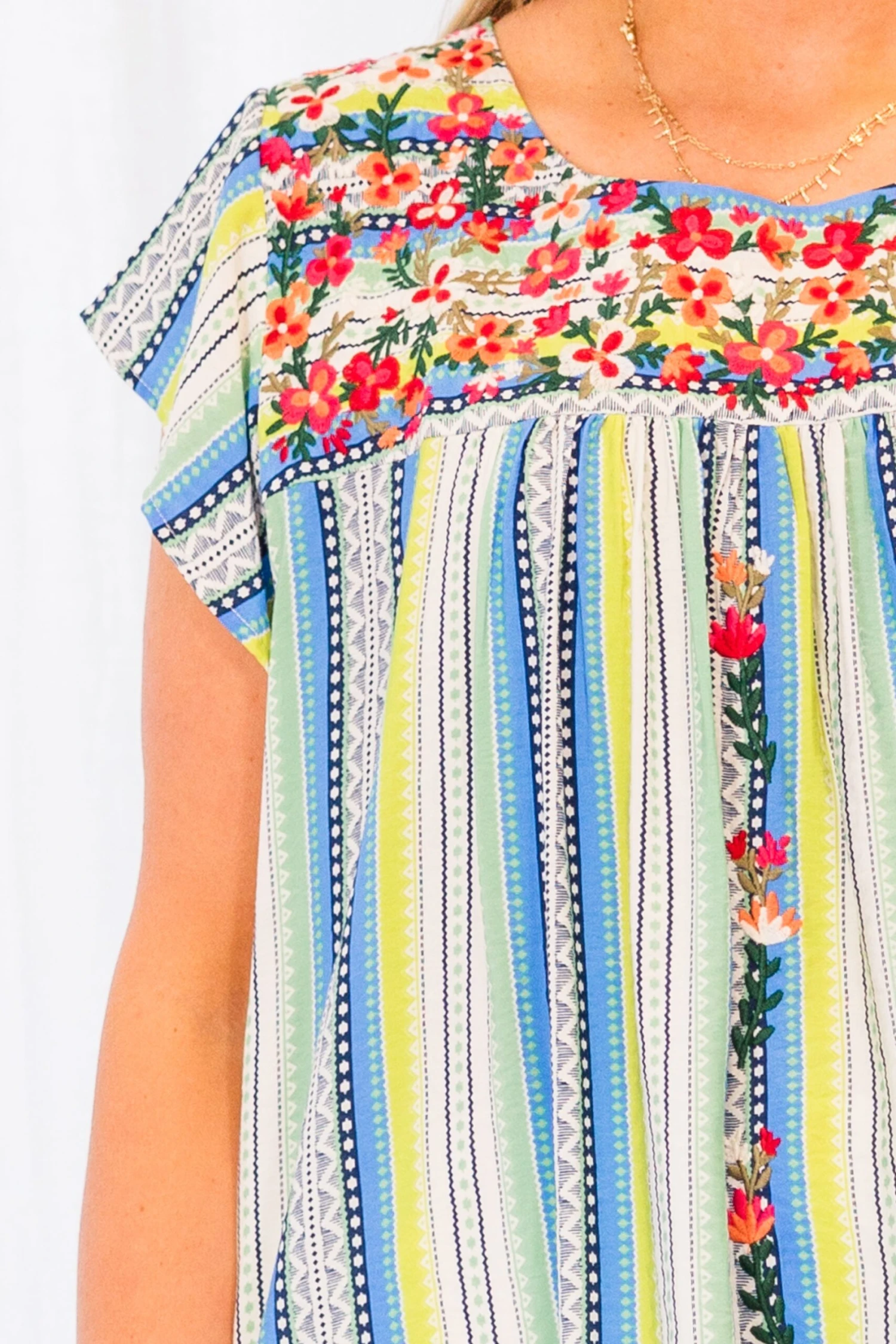 Embrace your unique style in this playful top! With lovely teal multi color and charming details like floral embroidery and a stripe pattern, you’ll stand out in any crowd! Embrace your individuality with this FAB top!