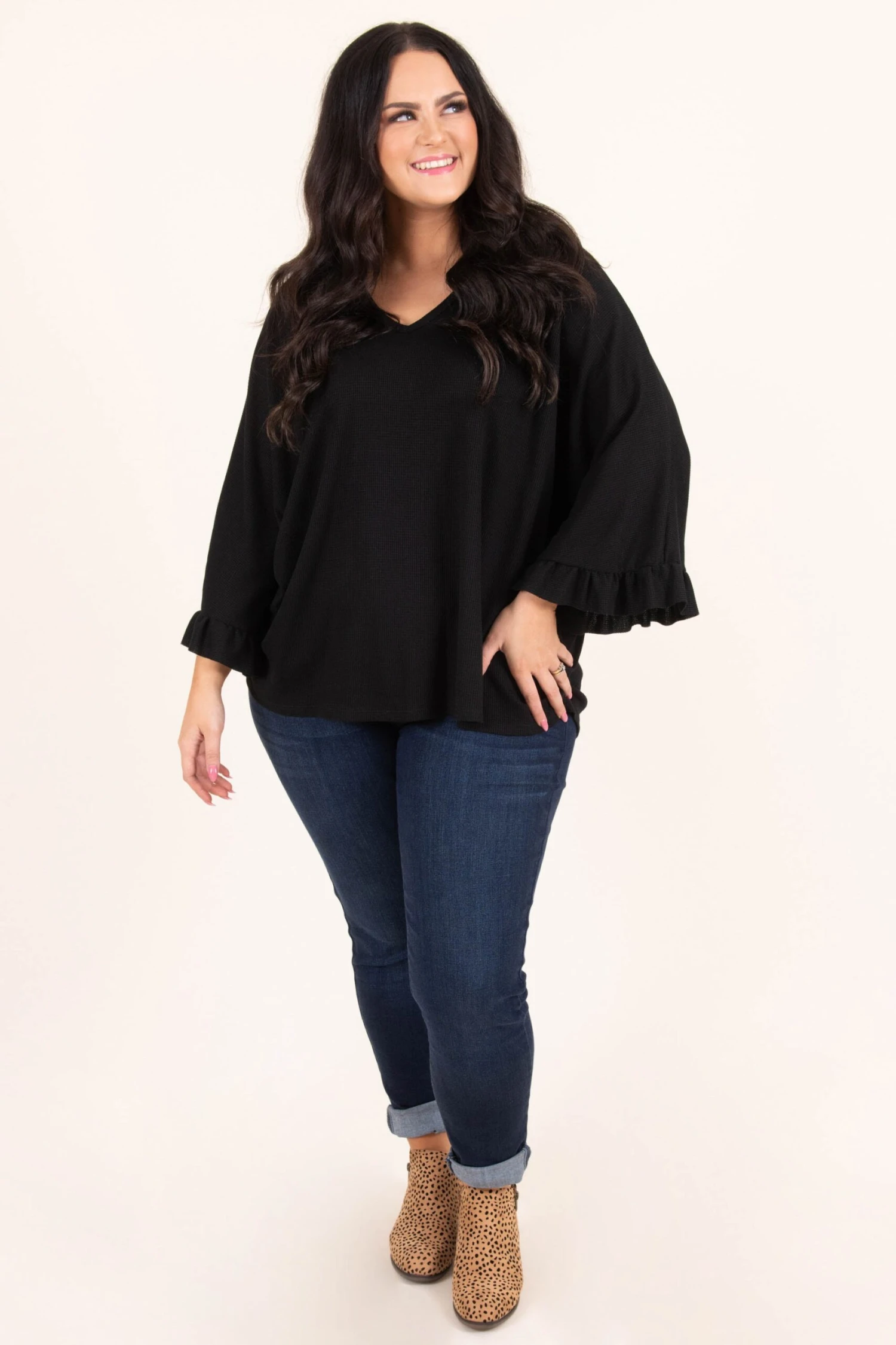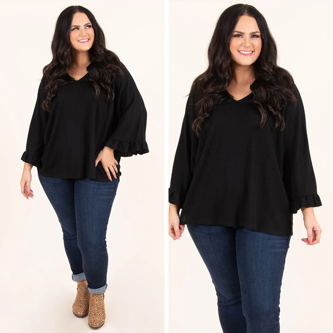 The possibilities are endless with this adorable top! This top has a neutral black color and lovely ruffles around the sleeves! The sweet neckline and flowy fit are just in time for the season! Simply style this top with some skinnies and cute accessories for a casual, chic look!