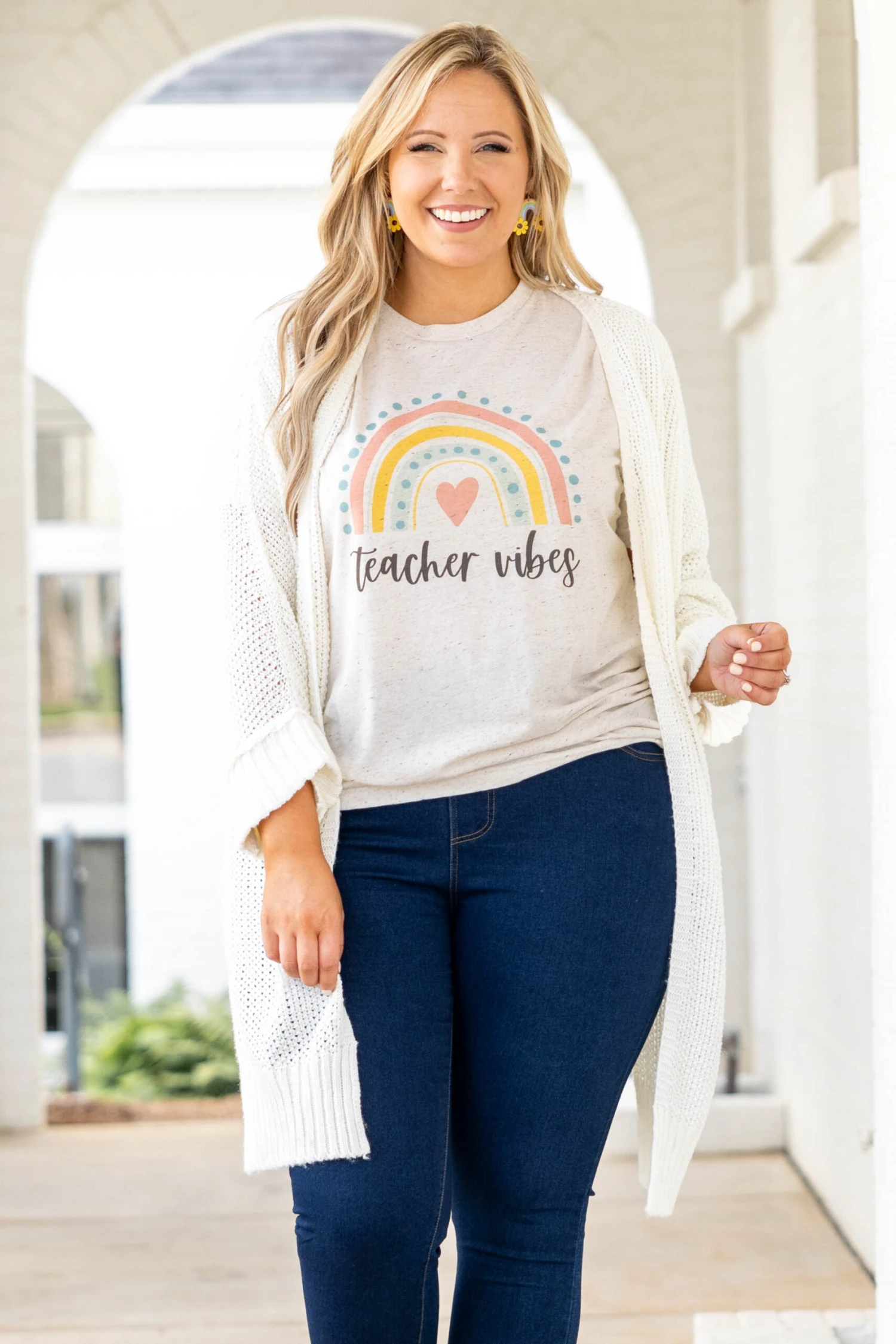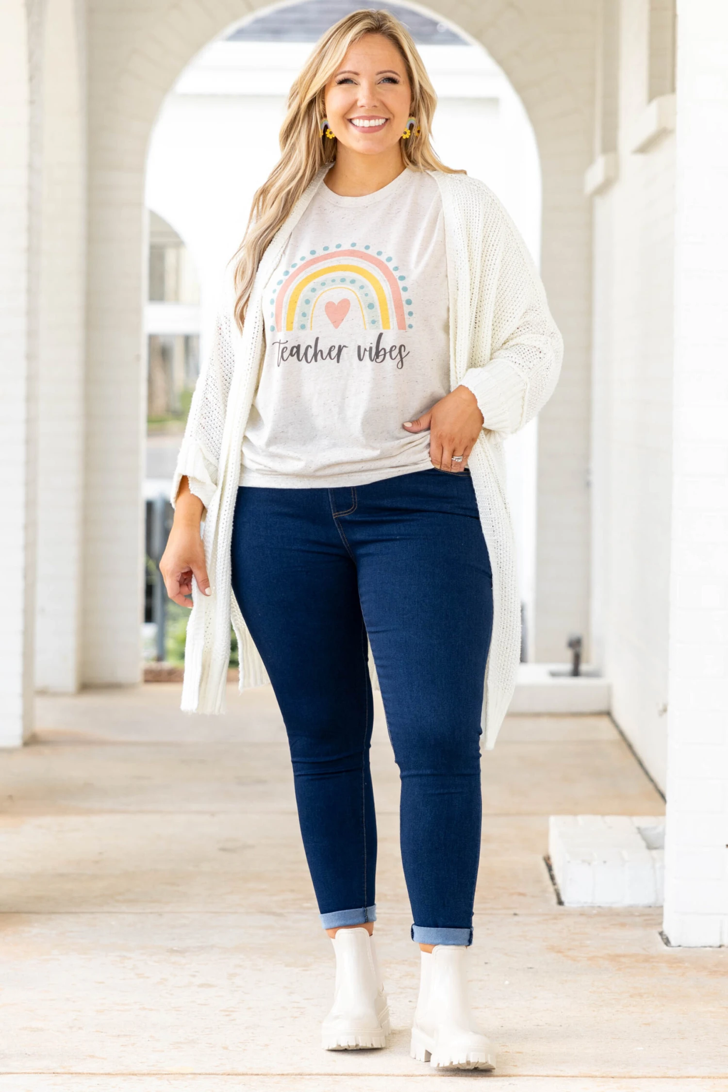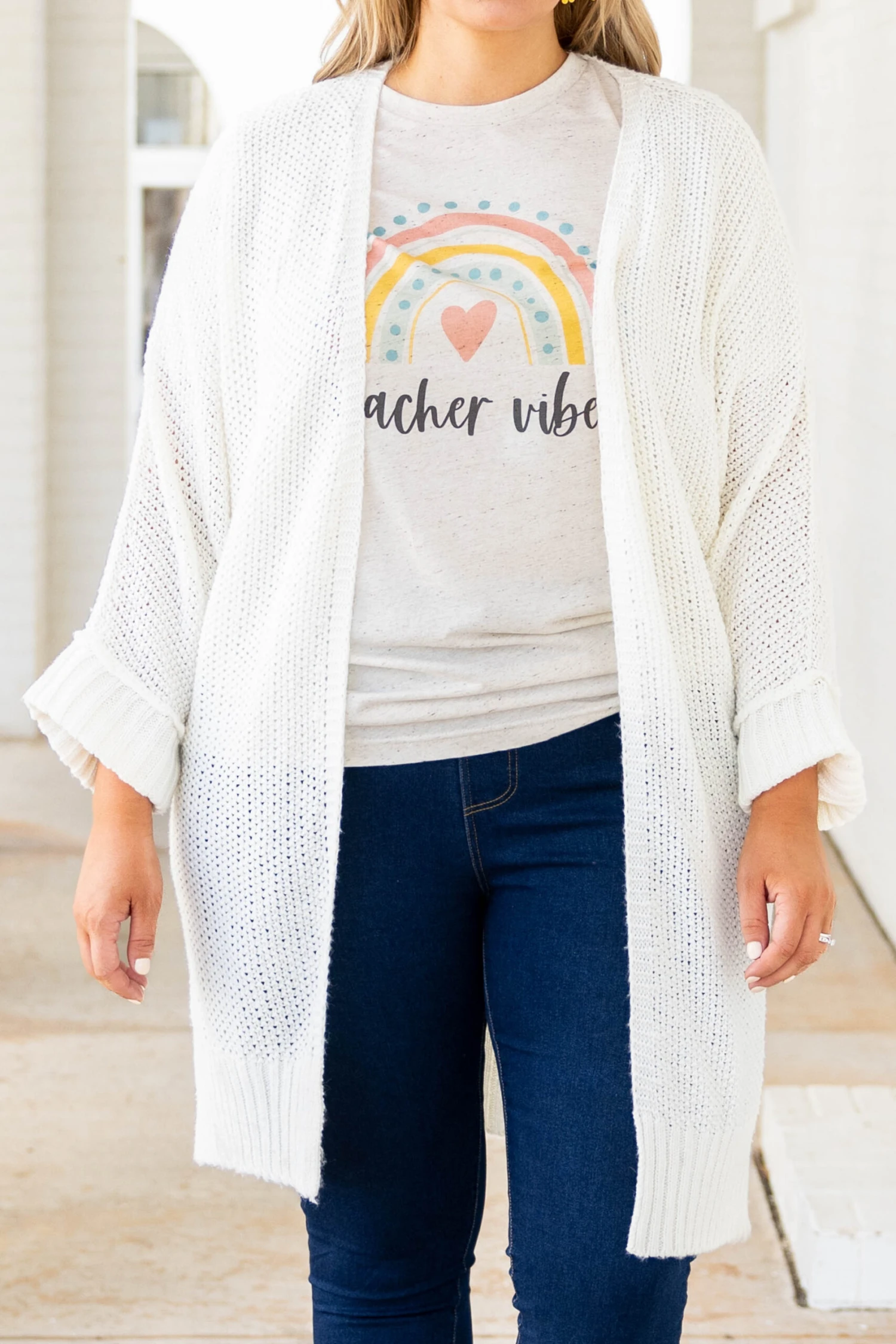 Life is even sweeter in this cardigan! The ivory color is easy to style over anything in your wardrobe. Style this like our girl, Kim, over a solid top and with jeans for a chic look!