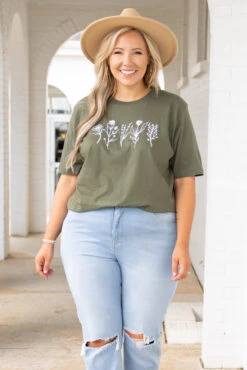 We love this blooming tee! This trendy tee has a simple graphic design with military green colors you can pair with everything in your wardrobe! It’s comfortable for all-day wear, has a flowy fit to flatter your figure, and is perfect for the season! Style this top with skinnies or shorts for a fun and flirty look!Â