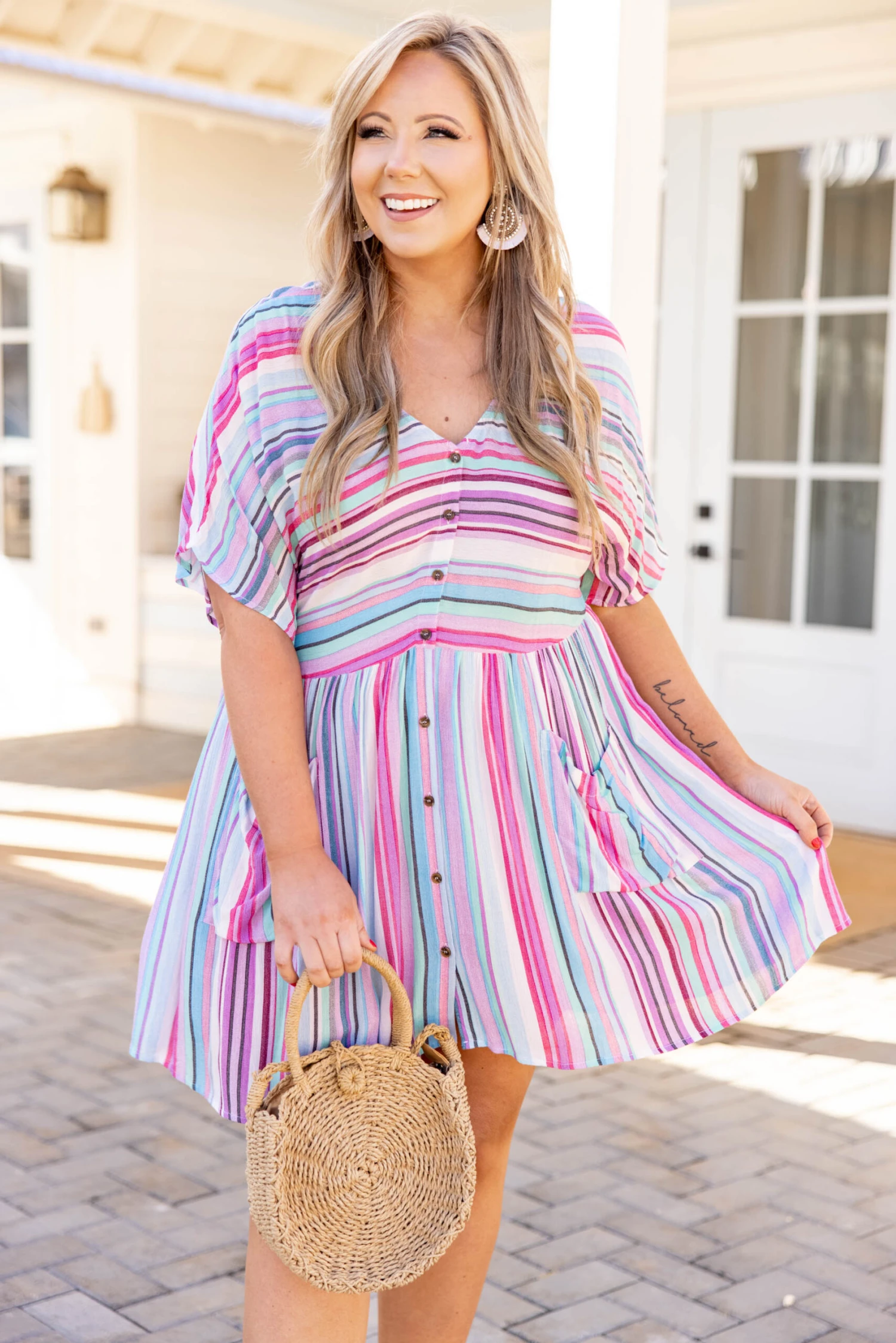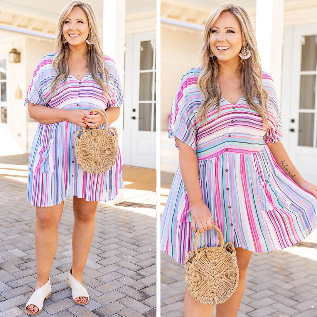 Wear this dress every other day – heck, wear it every day if you want! This beautiful striped dress is perfect for every occasion! It’s comfortable for all day wear and has a colorful pink pattern you can dress up or down! The baby-doll fit is incredibly flattering, and the flowy fabric is perfect for year-round wear! Style this dress with booties or flats for an effortlessly chic look!