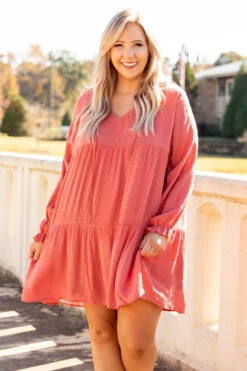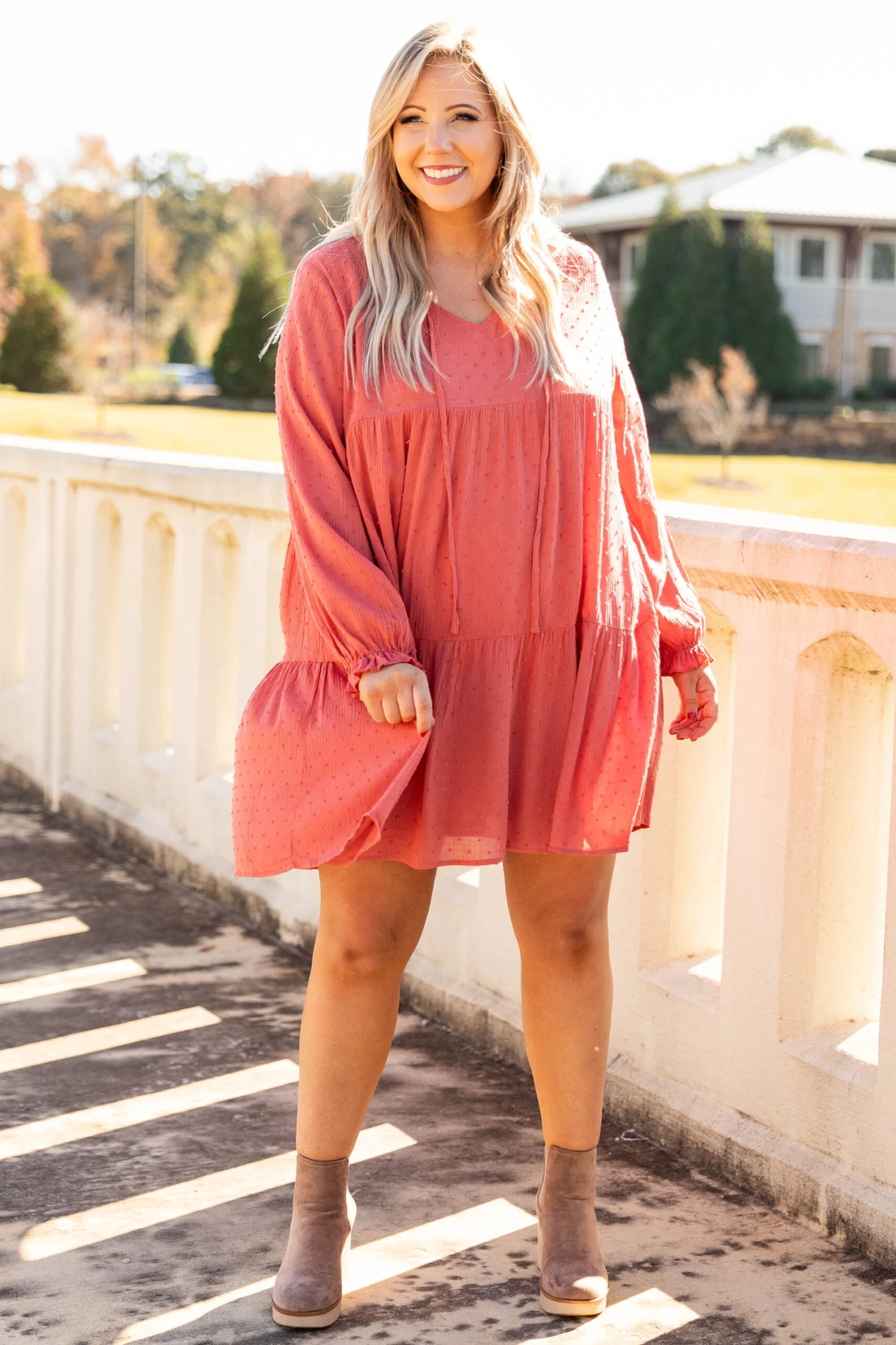 Everything is groovy in this fun new dress! It has a sweet rust color, textured swiss dots and a tie at the neckline. Style this babydoll dress with booties for a cool outfit!