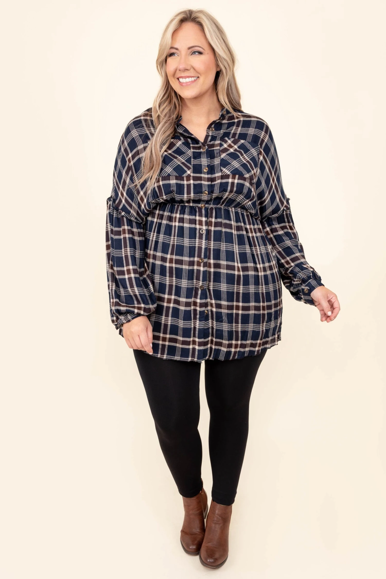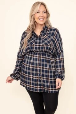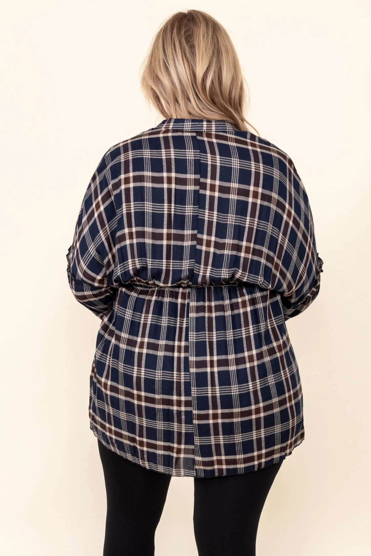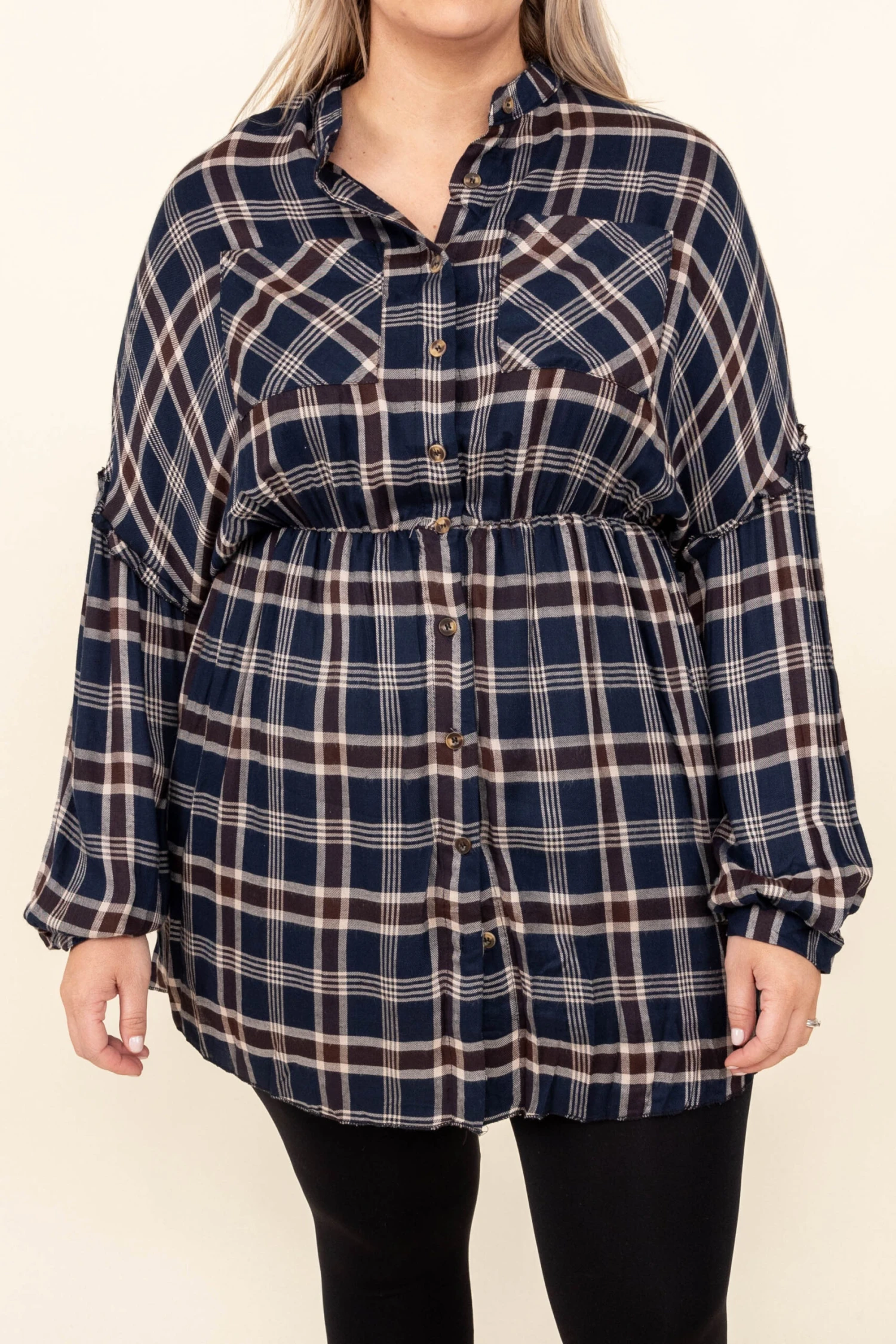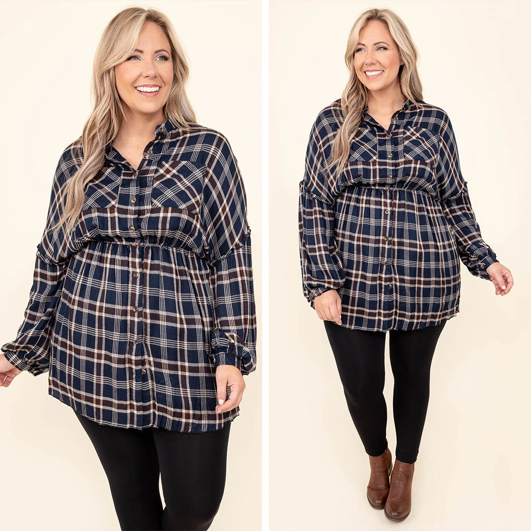 Experience the joy Fall brings through this gorgeous tunic! This top has a lovely navy color with a trendy plaid pattern that is just in time for the season! The comfy, flowy fit is perfect for a night out with the girls! Style this beauty with some cute accessories and booties for a classic chic look!