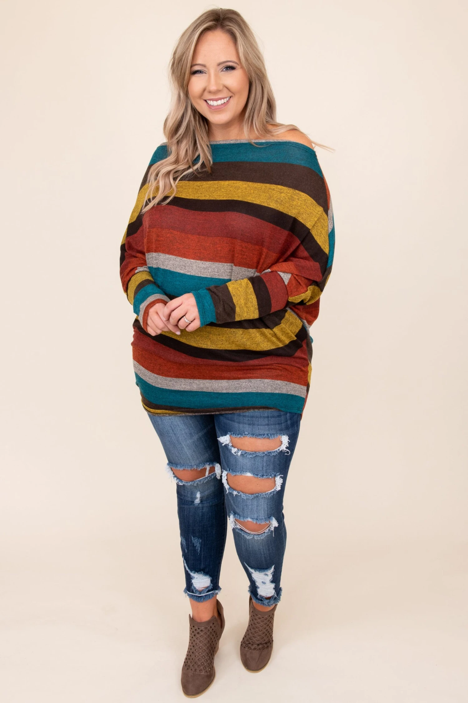 Embraces the season’s change in this top! It has a chic stripe pattern with neutral colors that are perfect for the season! It’s comfortable for all-day wear, has a figure-flattering fit, and features a soft fabric we adore! Style this top with skinnies and booties for an easy everyday outfit!Â