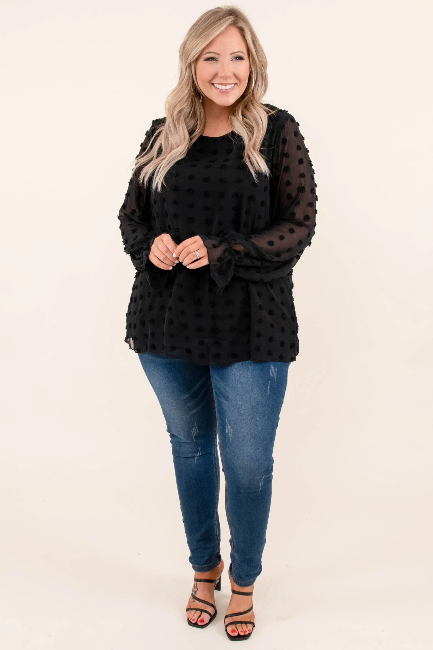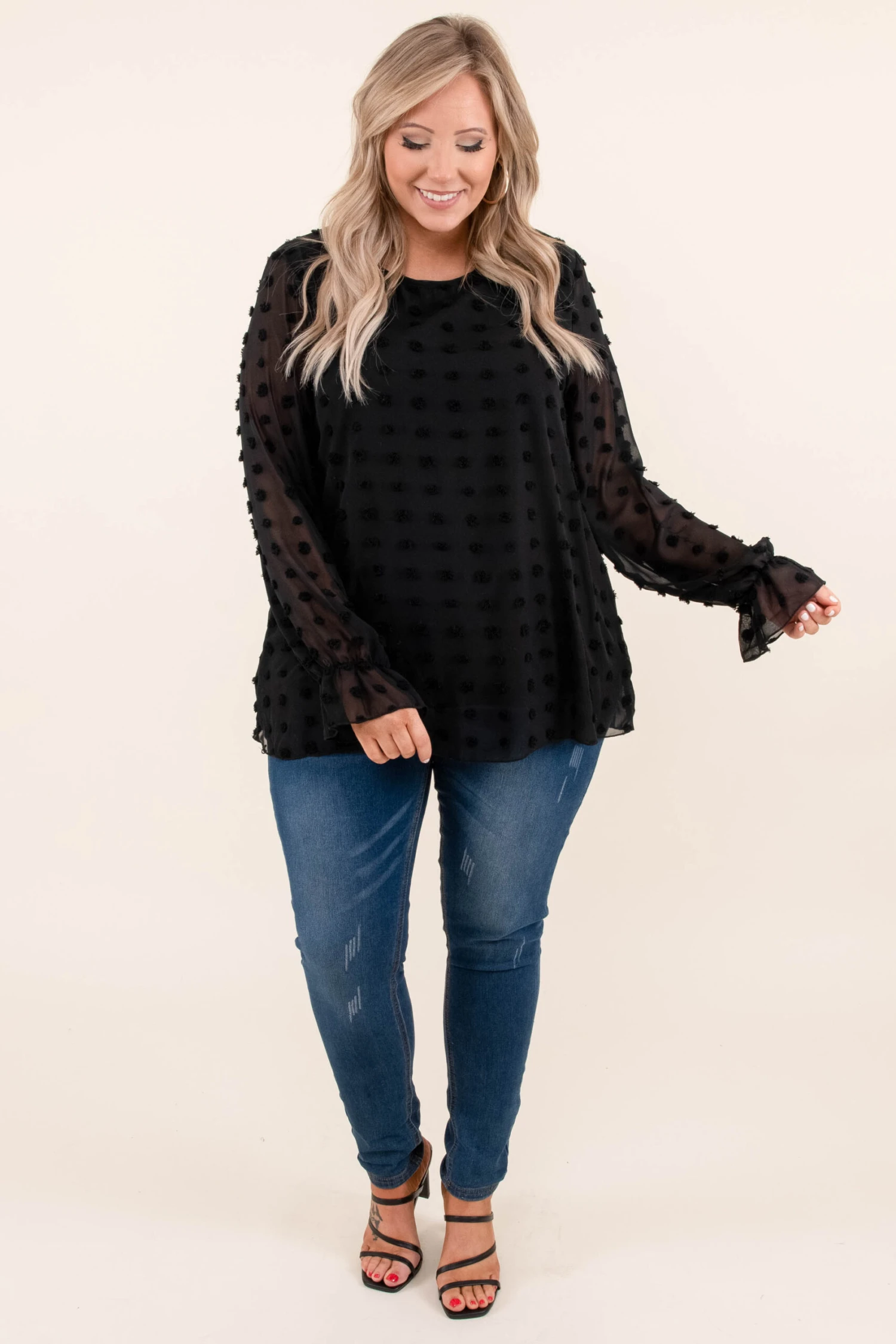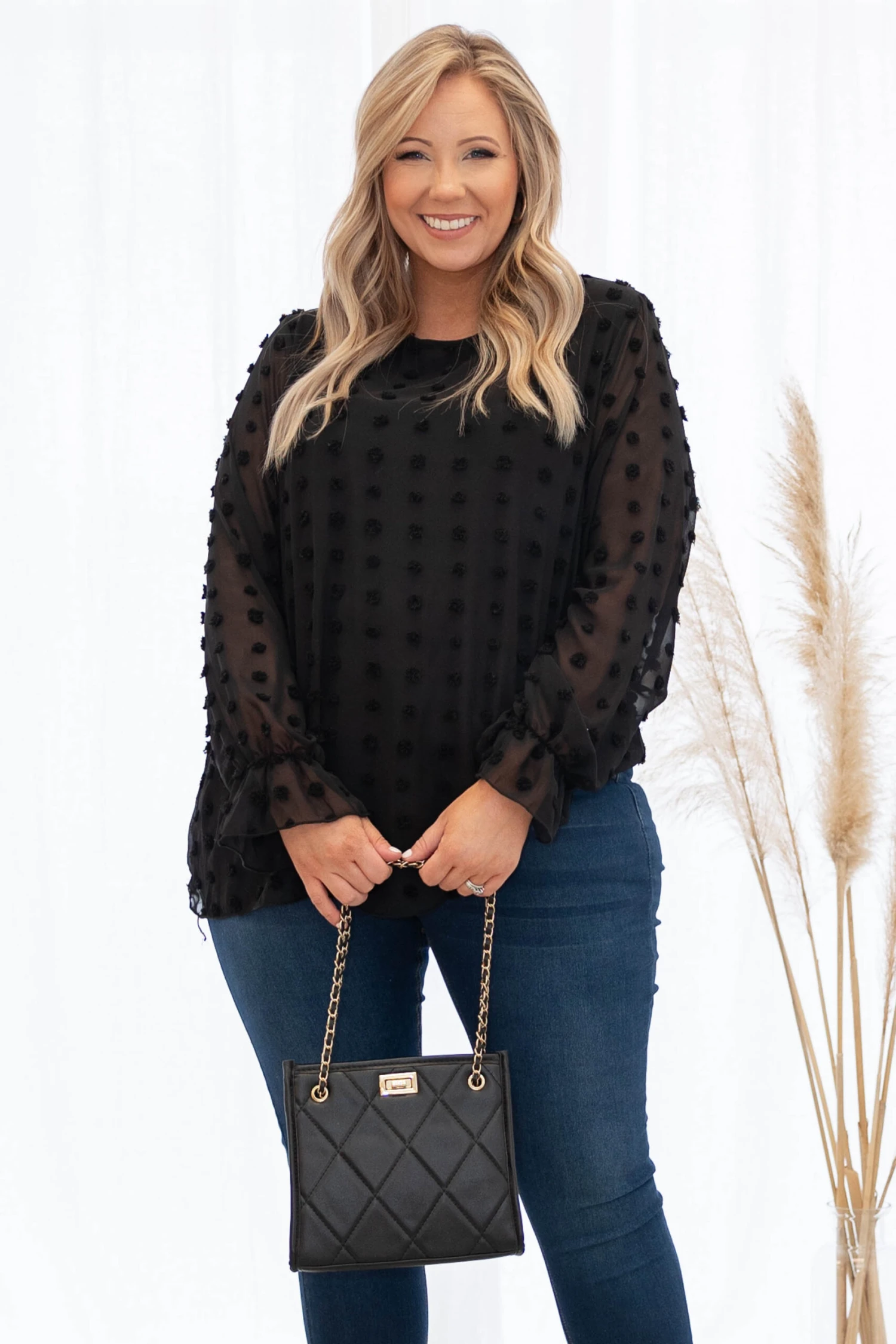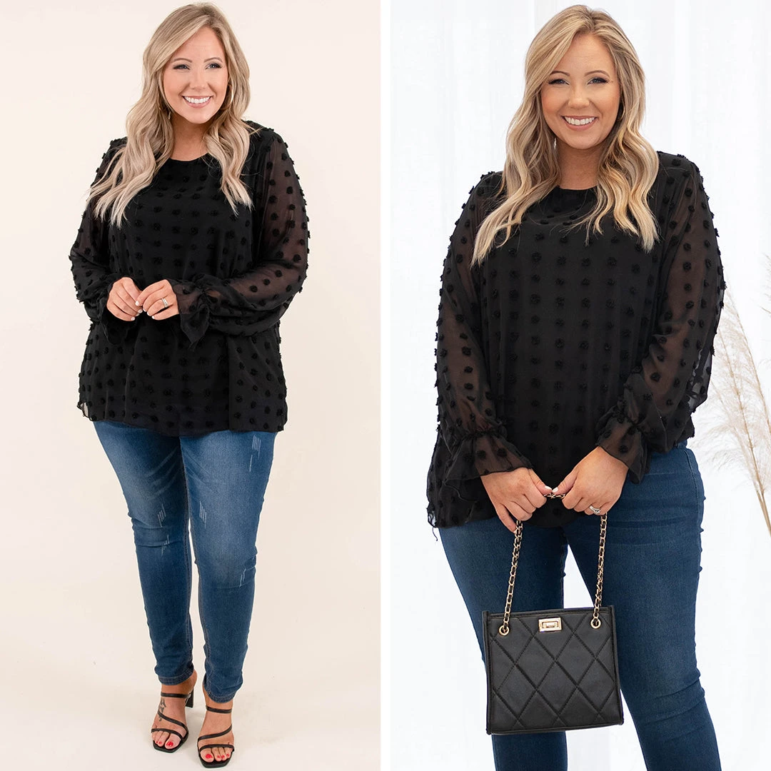 This is the perfect addition to your wardrobe this season! It has a classic black color, textured swiss dots and is so elegant. Pair this with jeans, booties and a chic bag for the best style!