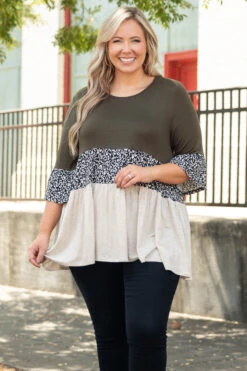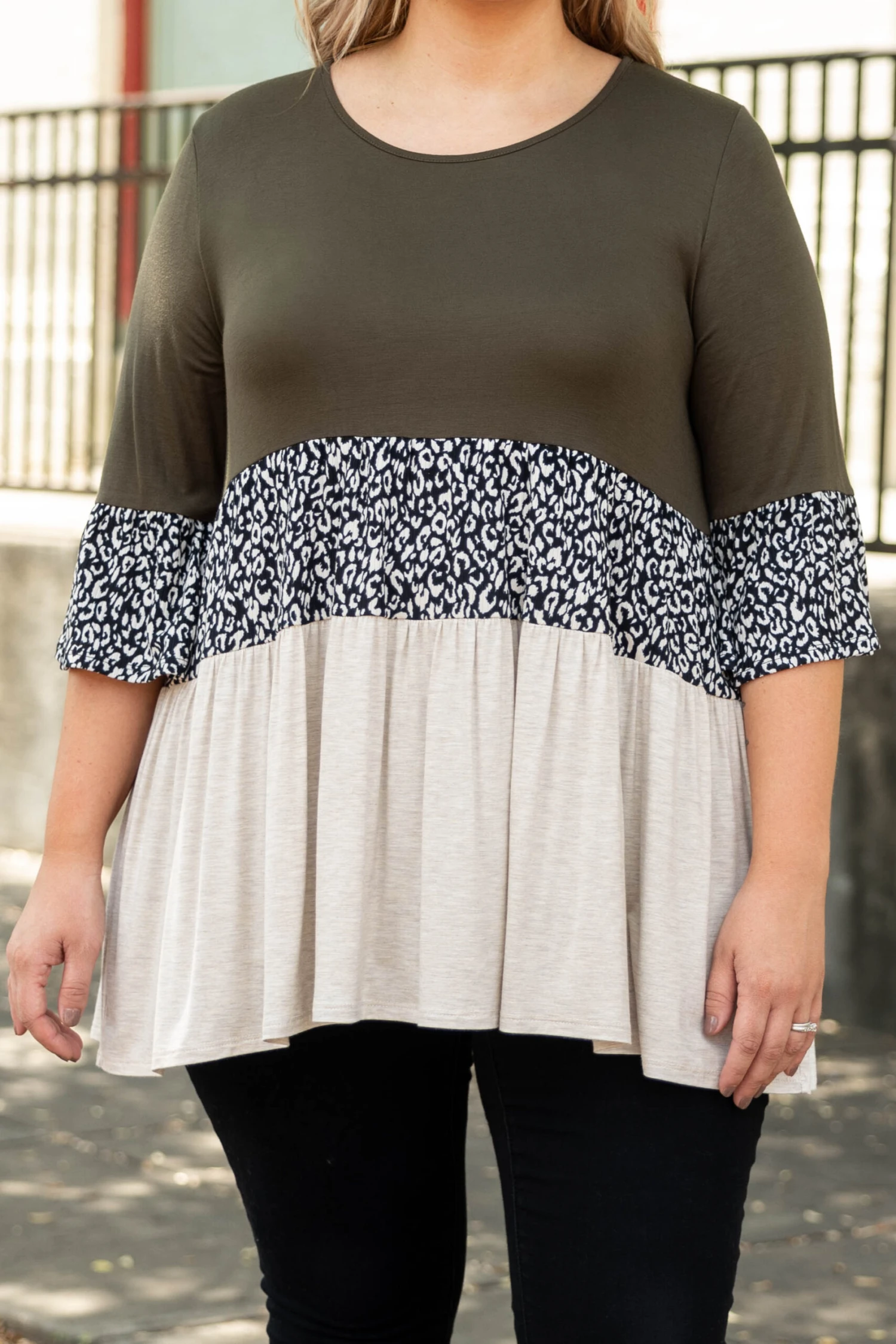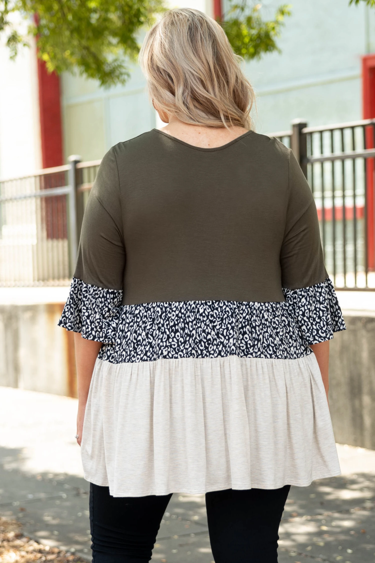 This top will definitely have you looking wildly fierce! The color blocking pattern with the leopard stripe is so cute! The olive color is so easy to match with your fave bottoms and the ruffle hem on the sleeves is so cute! Also, did we mention how soft the material is? Style this cutie with some comfy denim or leggings and a great pair of slides to look oh so stylish!