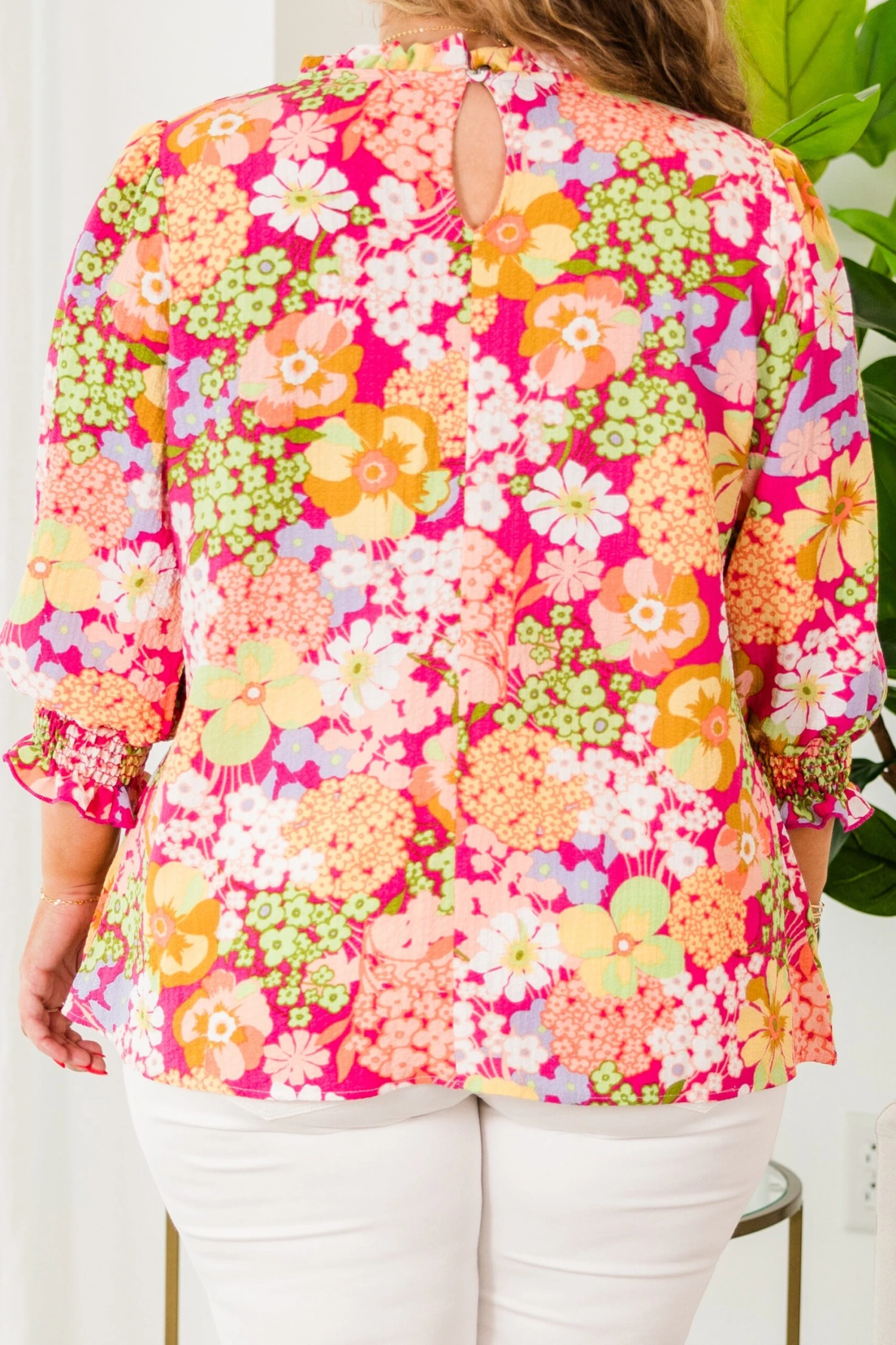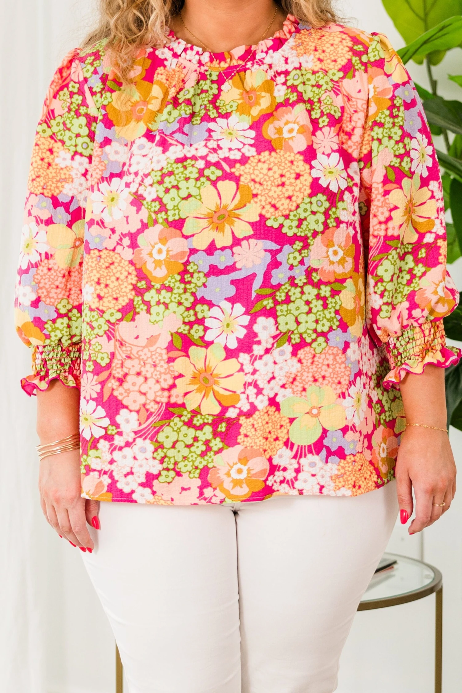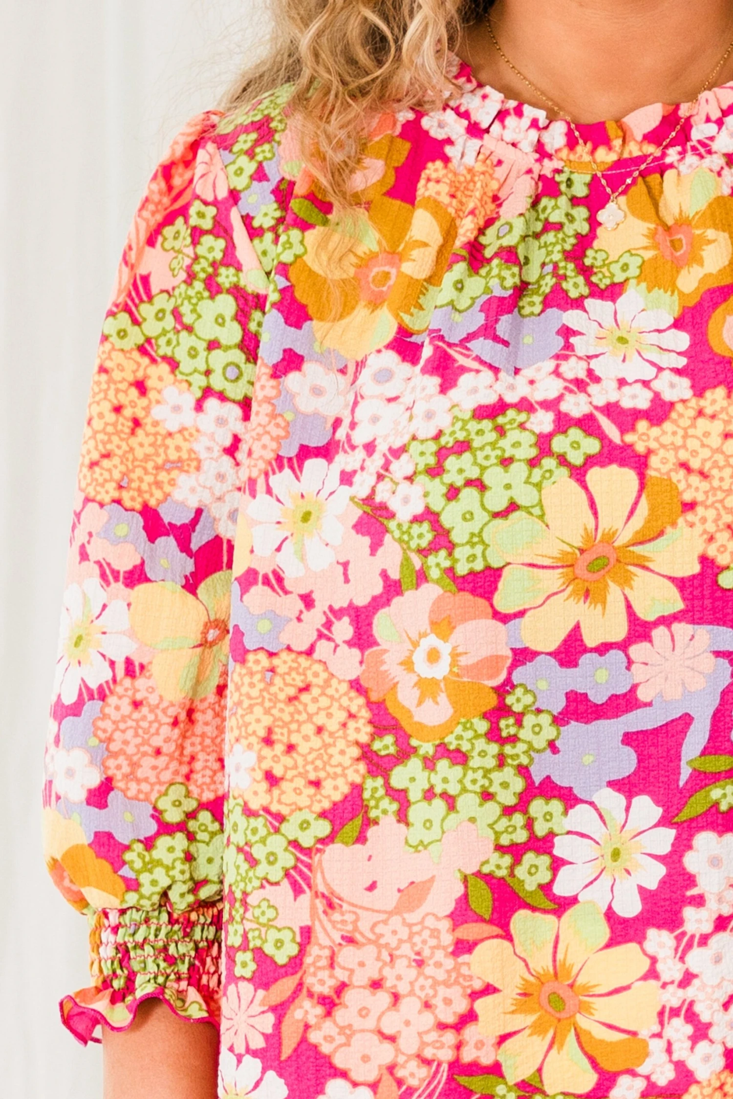 We simply adore this blouse! It features a ruffled neckline, smocking sleeve detail, and a bold fuchsia color with a beautiful floral pattern! The delicate design and vibrant color make it perfect for any occasion, adding a touch of elegance to your wardrobe!