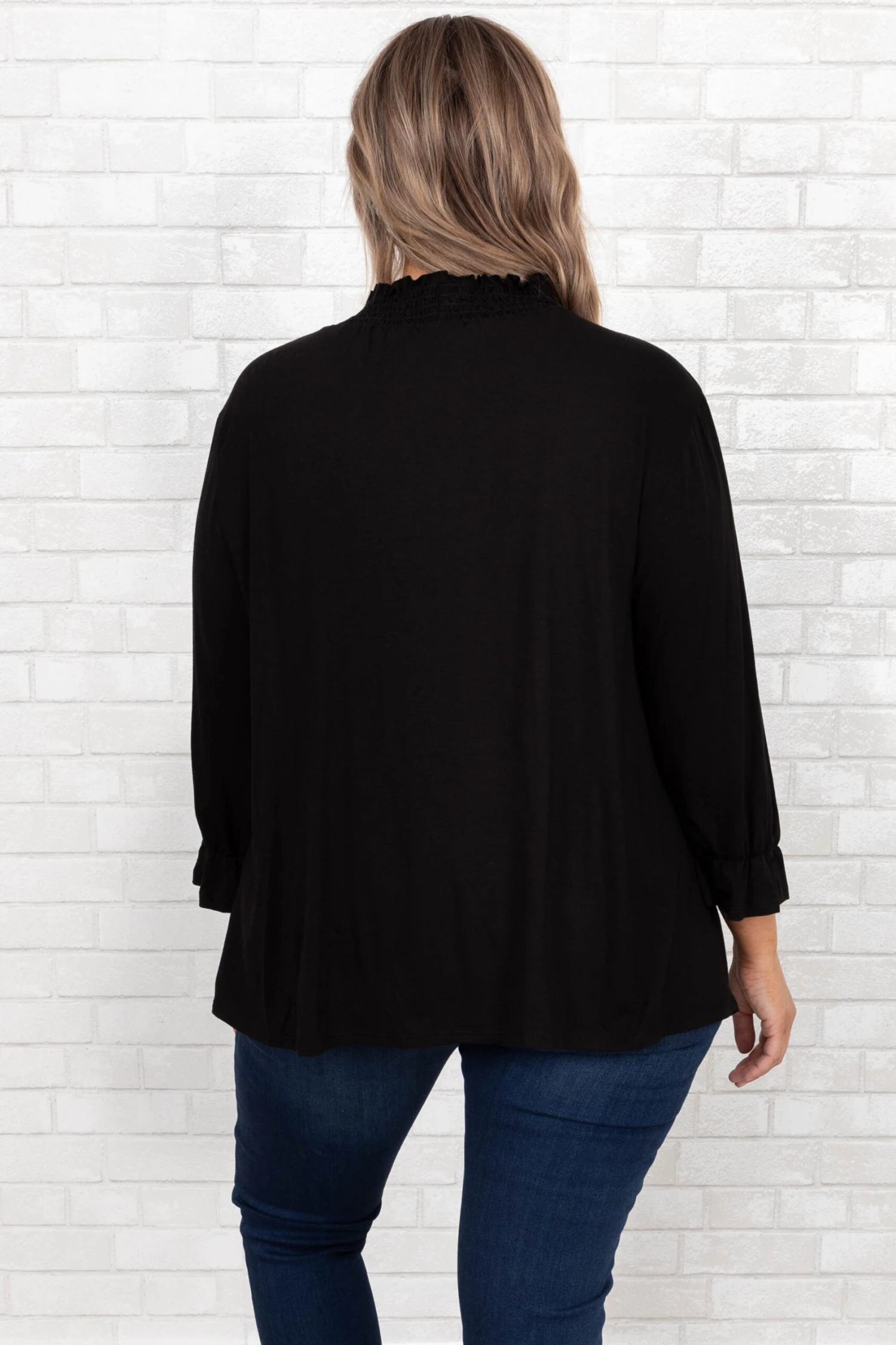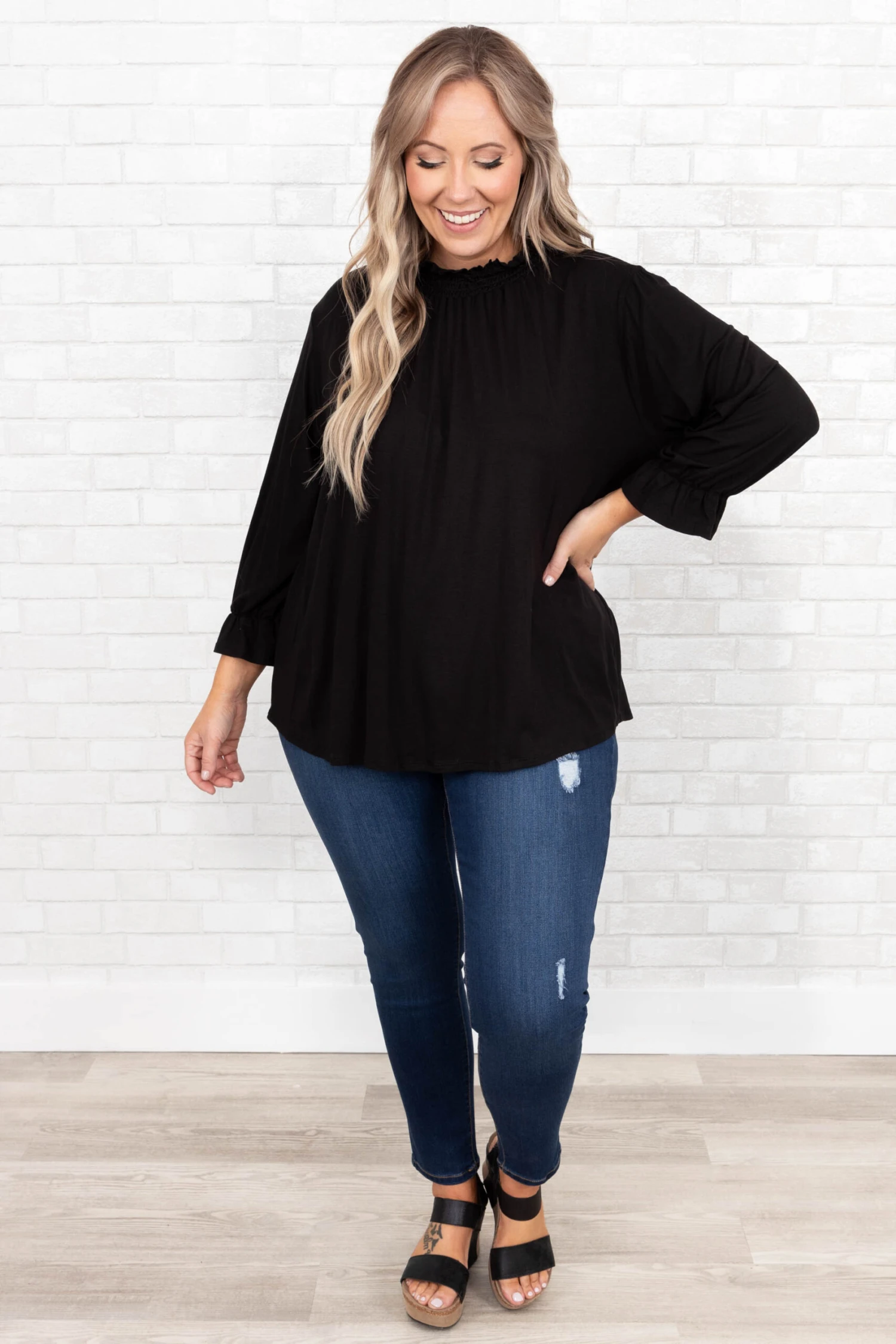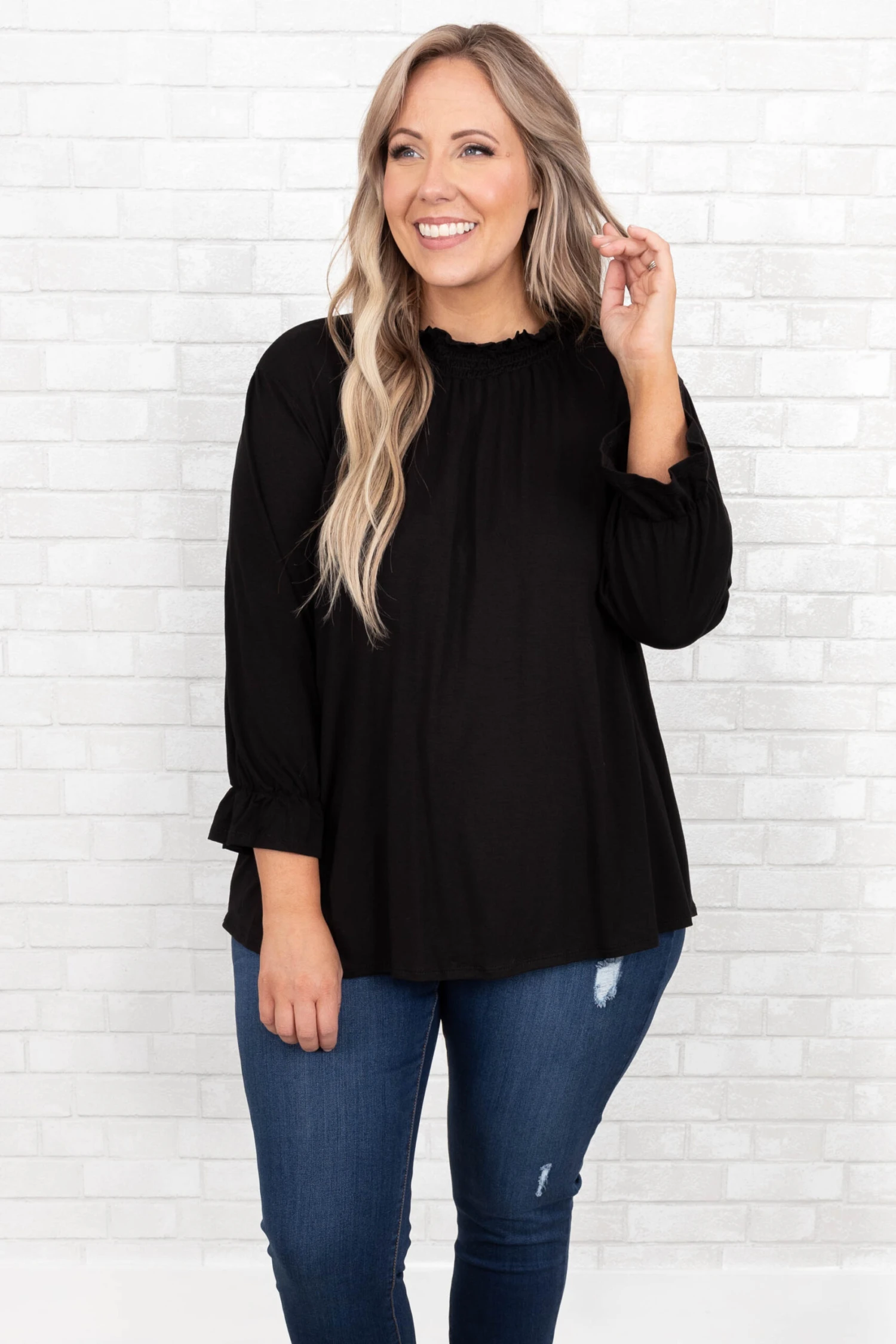 This gorgeous top makes us SO happy! The neutral black color and the trendy ruffled neckline is perfect for the season! The figure flattering, flowy fit is so sweet! Style this top with some cute accessories and wedges for a classy chic look!