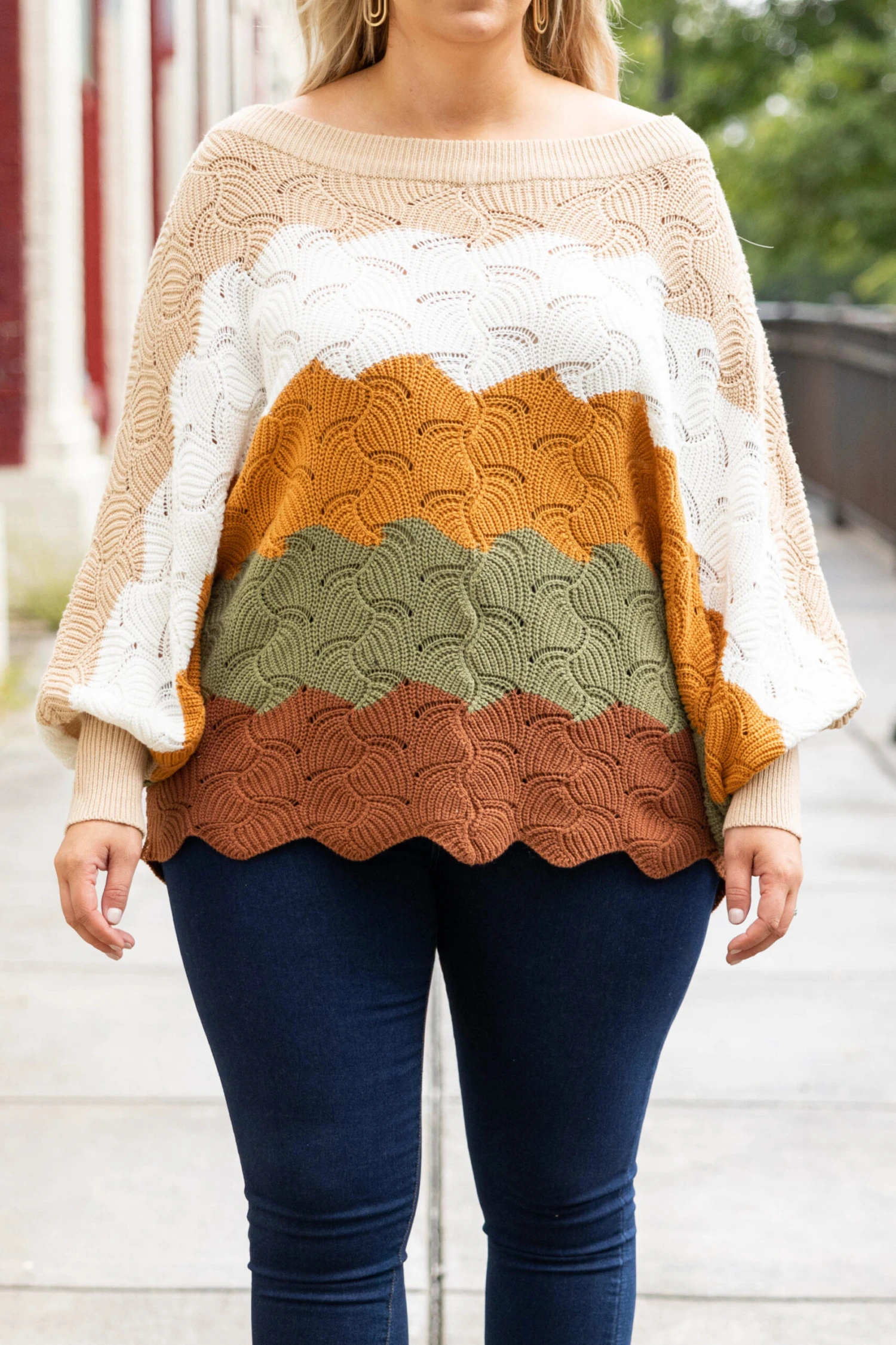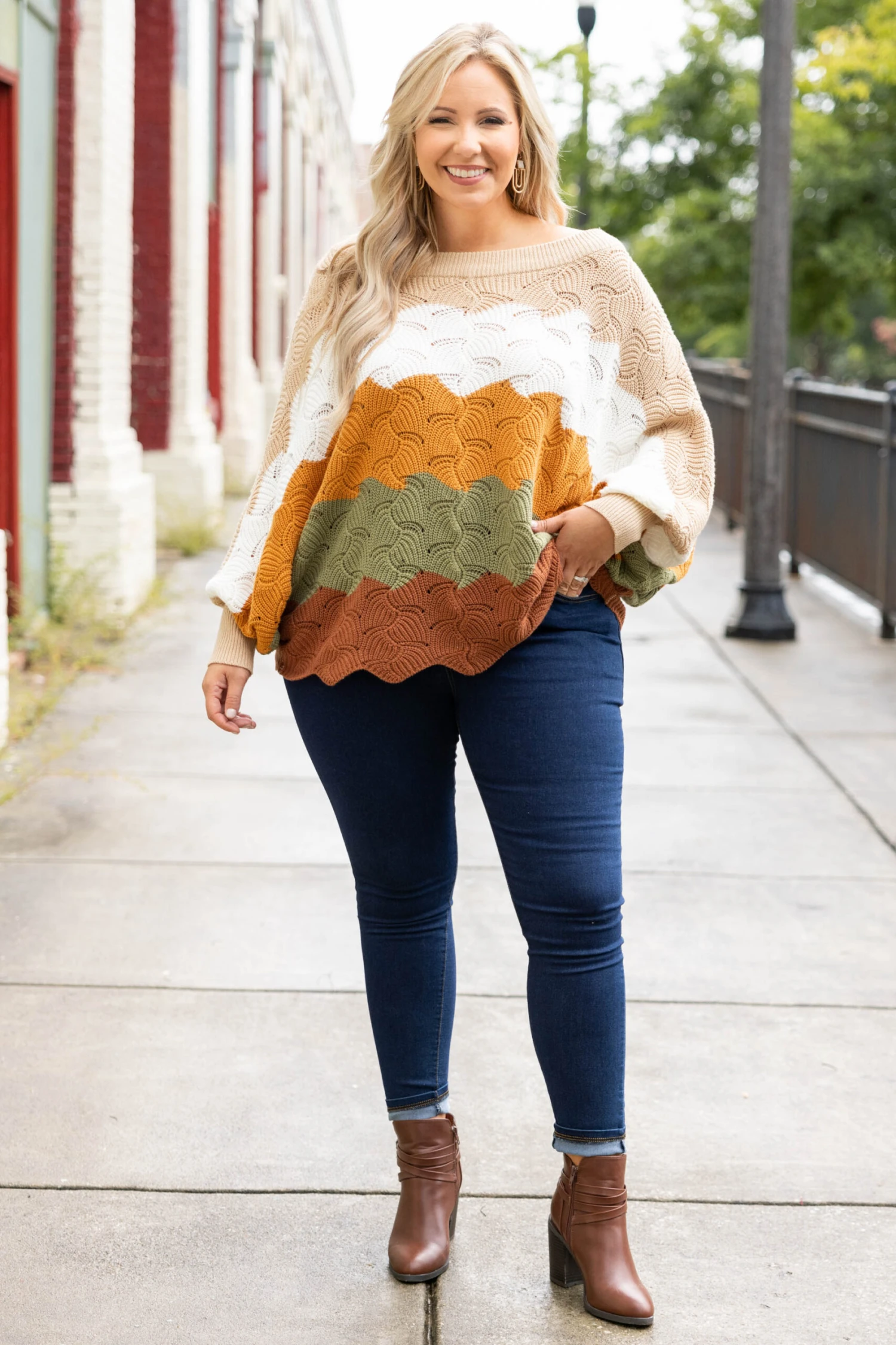 Fall in love with this adorable sweater! This sweater has a large knit fabric with a sweet scalloped design just in time for the season! It’s comfortable for all-day wear, has an over-sized fit to flatter your figure, and can even be worn off the shoulder! Not to mention how easy this piece is to style! Wear this sweater with skinnies and booties for an effortlessly chic look!Â