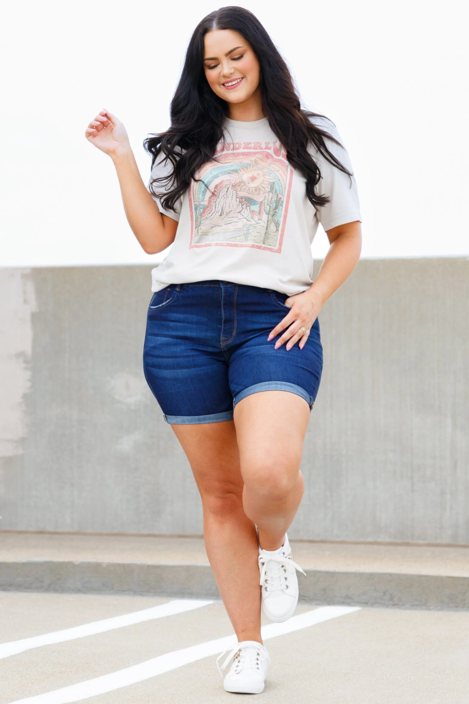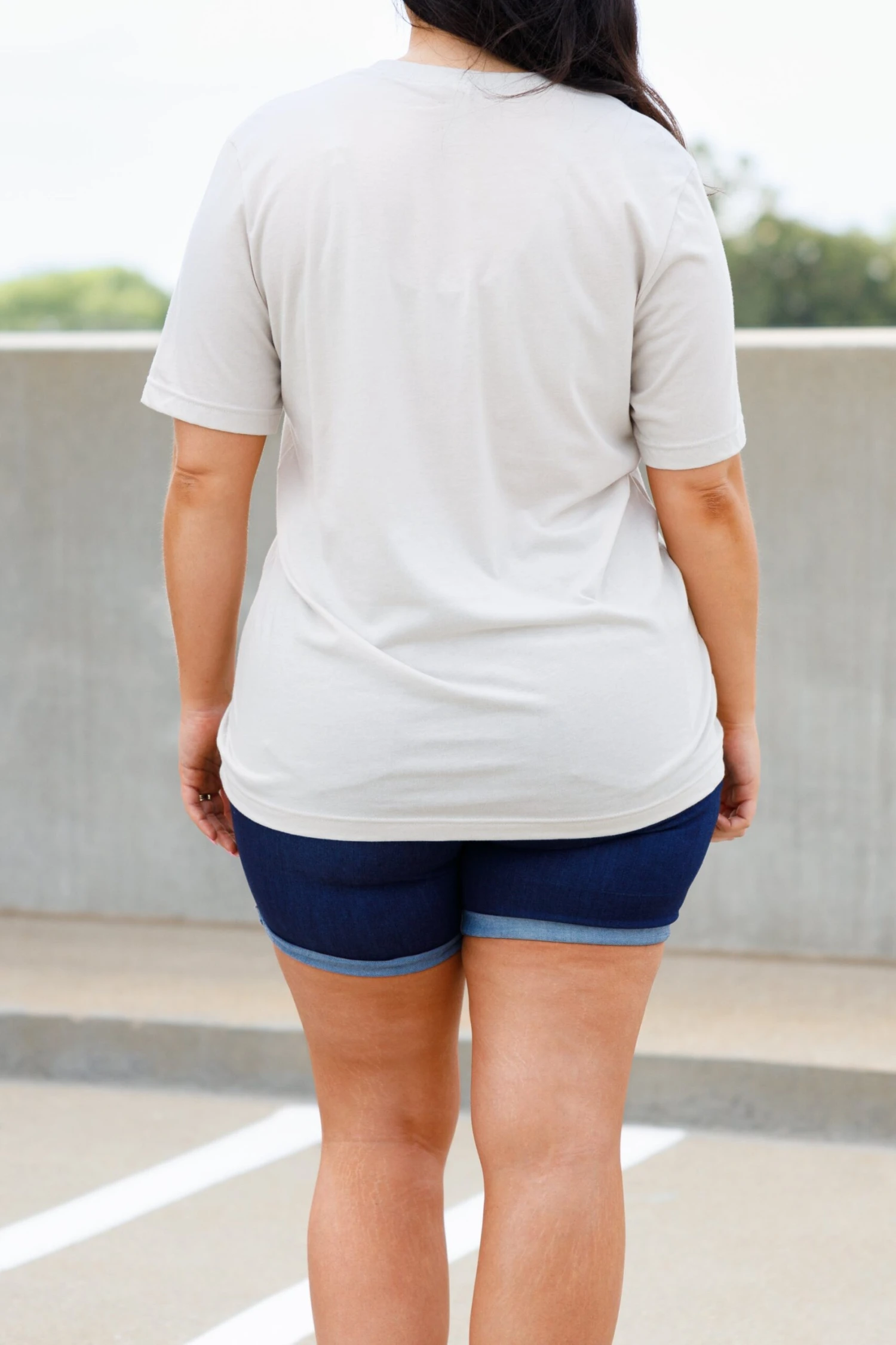 Enjoy some time under the sun in this cute! This tee has a heather dust color with a simple, cute graphic that is so chic! The classic t-shirt fit is great for all day wear! Pair this tee with skinnies or shorts for a classic chic look!