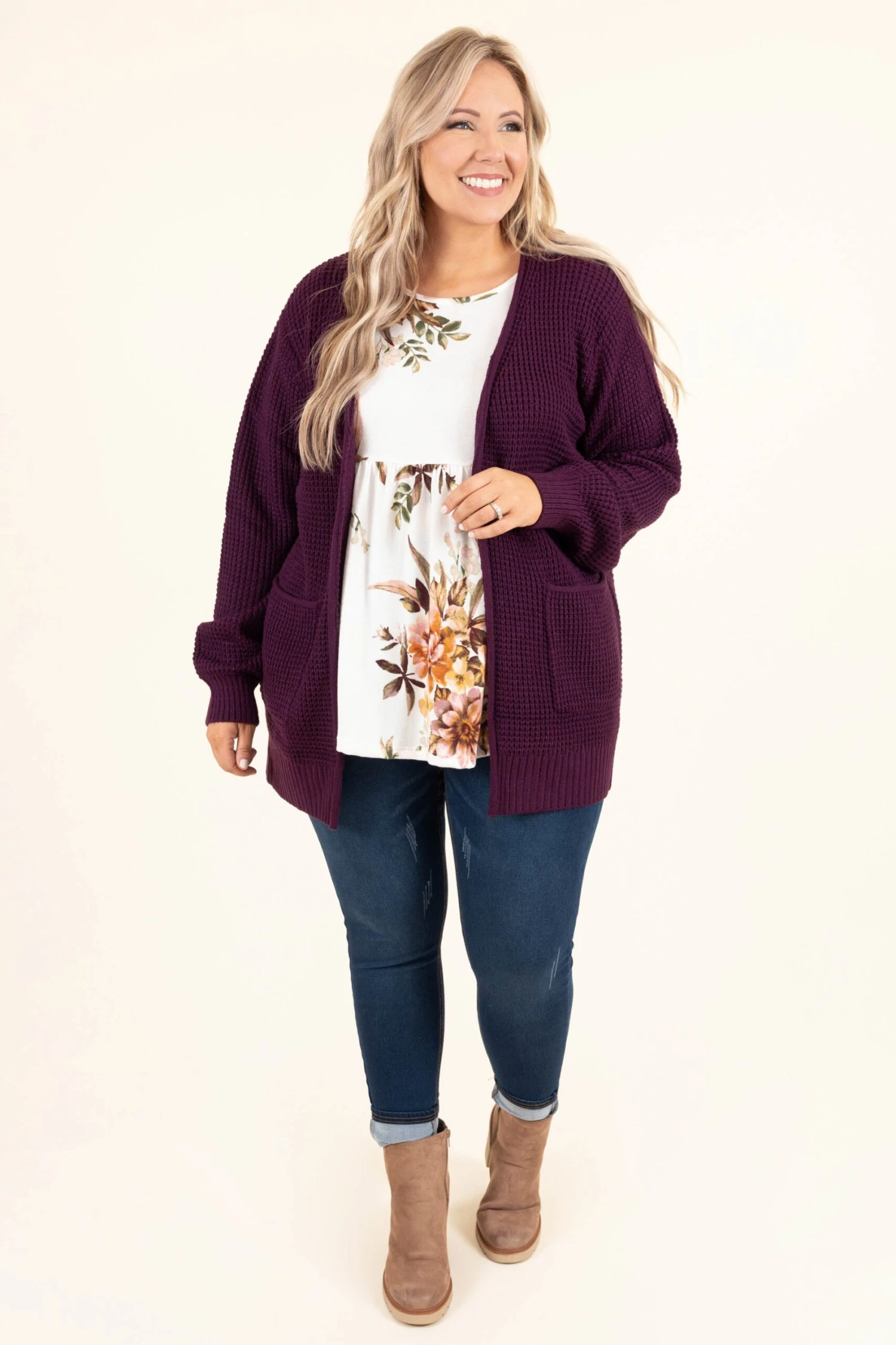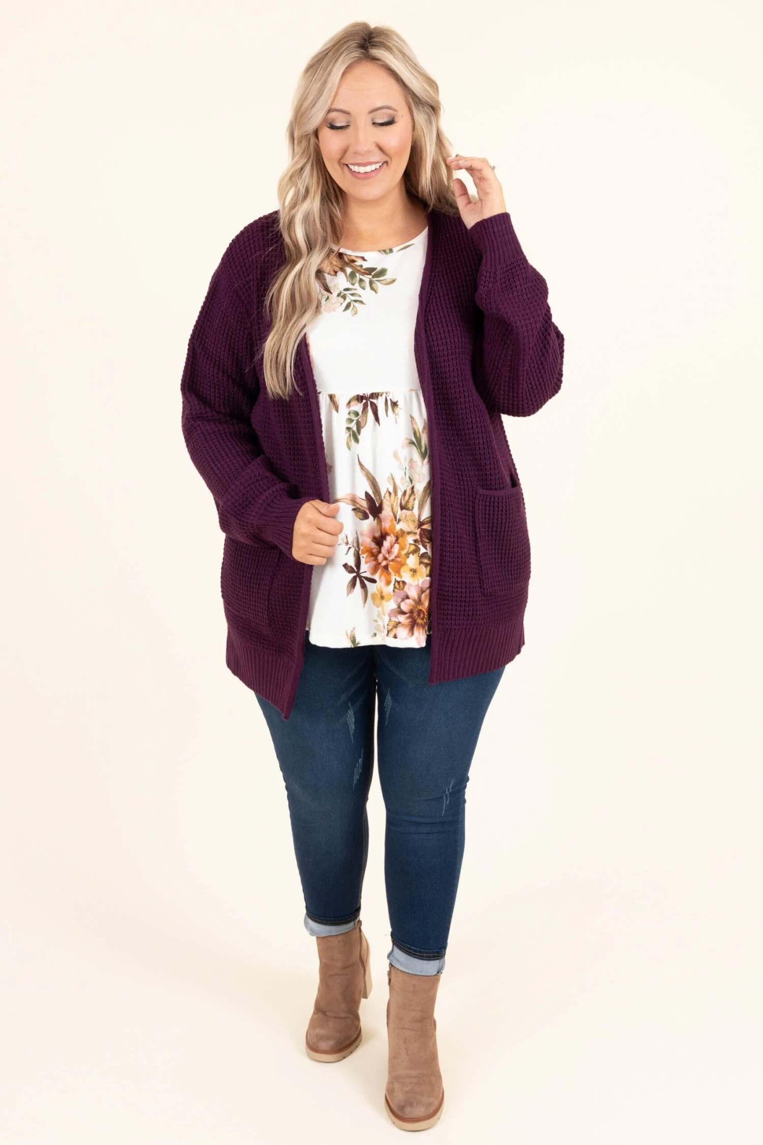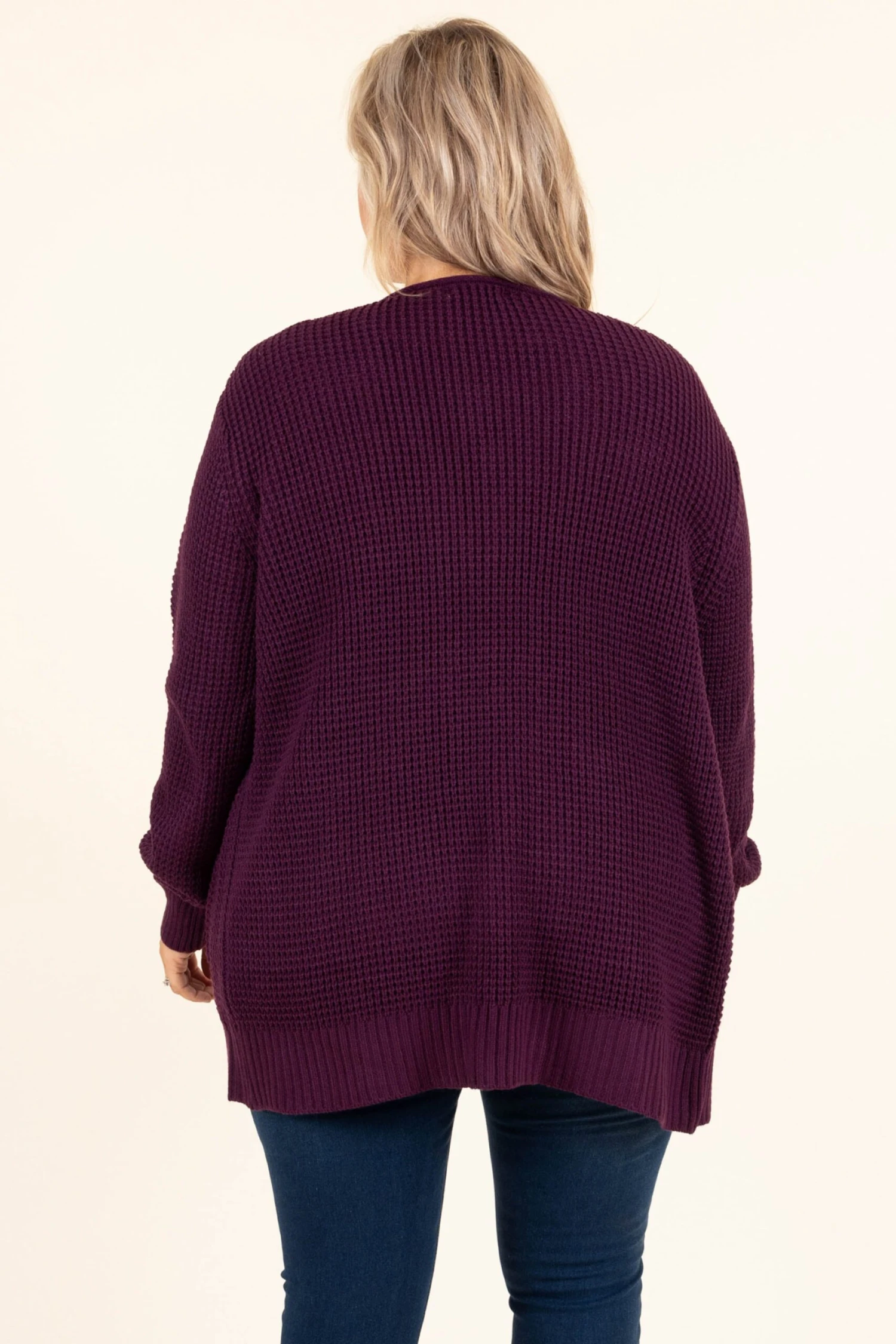 This is the cardigan you have been searching for! It has a dark plum color you can dress up or down and style with everything in your wardrobe! It’s comfortable for all-day wear, has a relaxed fit to flatter your figure, and is perfect for the season! Simply, style this cardigan with a solid or patterned top and skinnies for an effortlessly chic look!