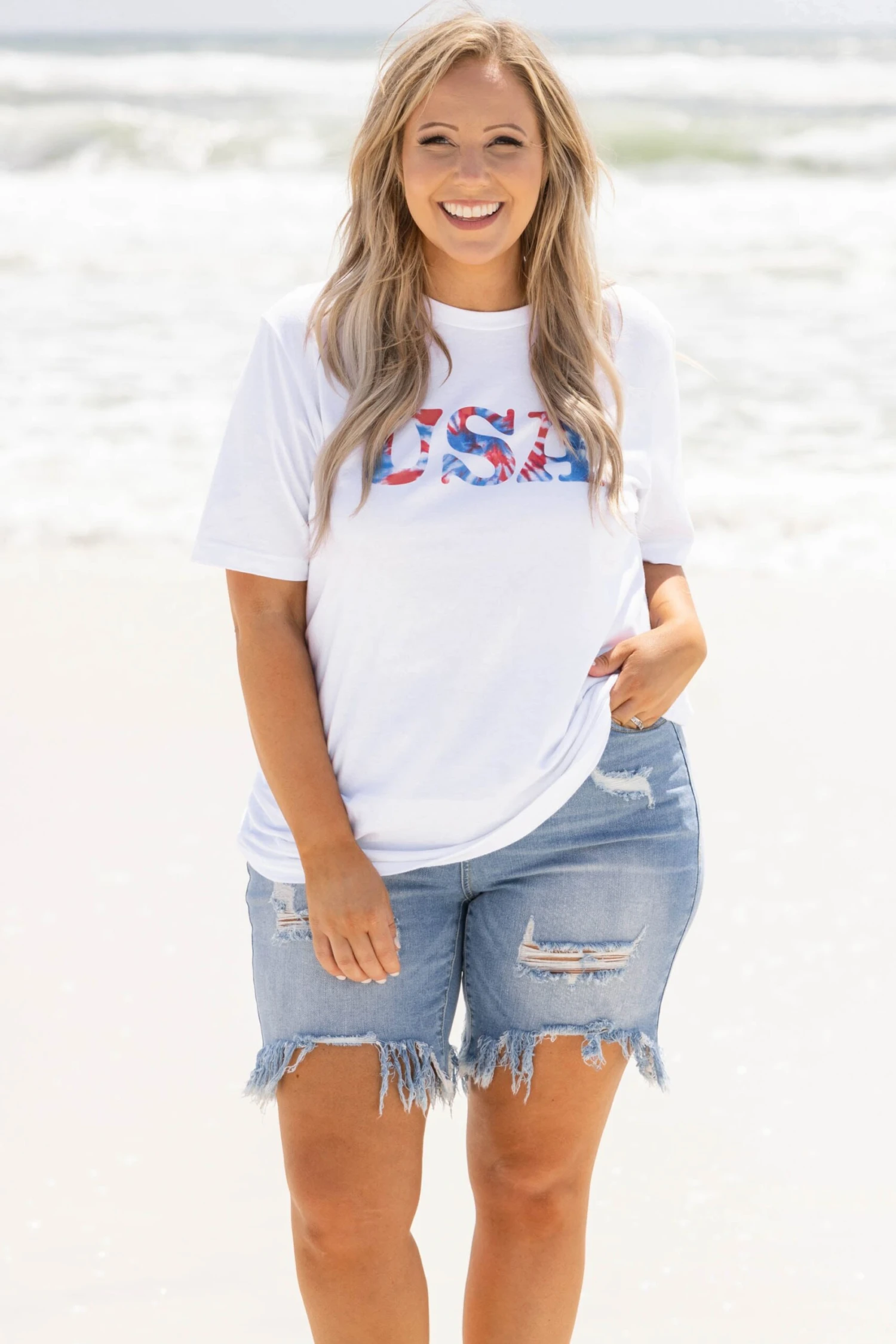 Watch some fireworks in this tee! The white color is so easy to pair with all of your fave bottoms and the USA graphic is so cute! Style this with jean shorts and sandals for a fun look this season!