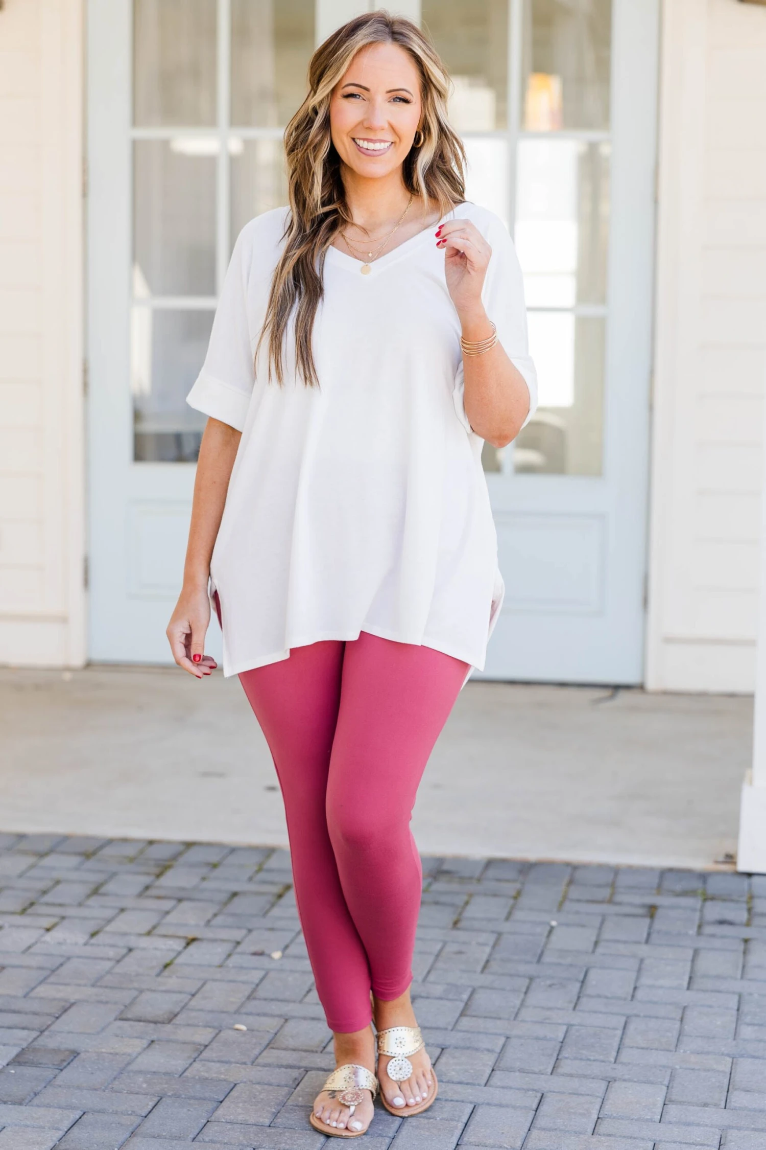 Always come in first in these leggings! The rose colored leggings have a comfy, stretchy fit and are a little high rise which makes them super flattering! Keep it casual with a chic top over them or throw a dress over them for a casual chic look!