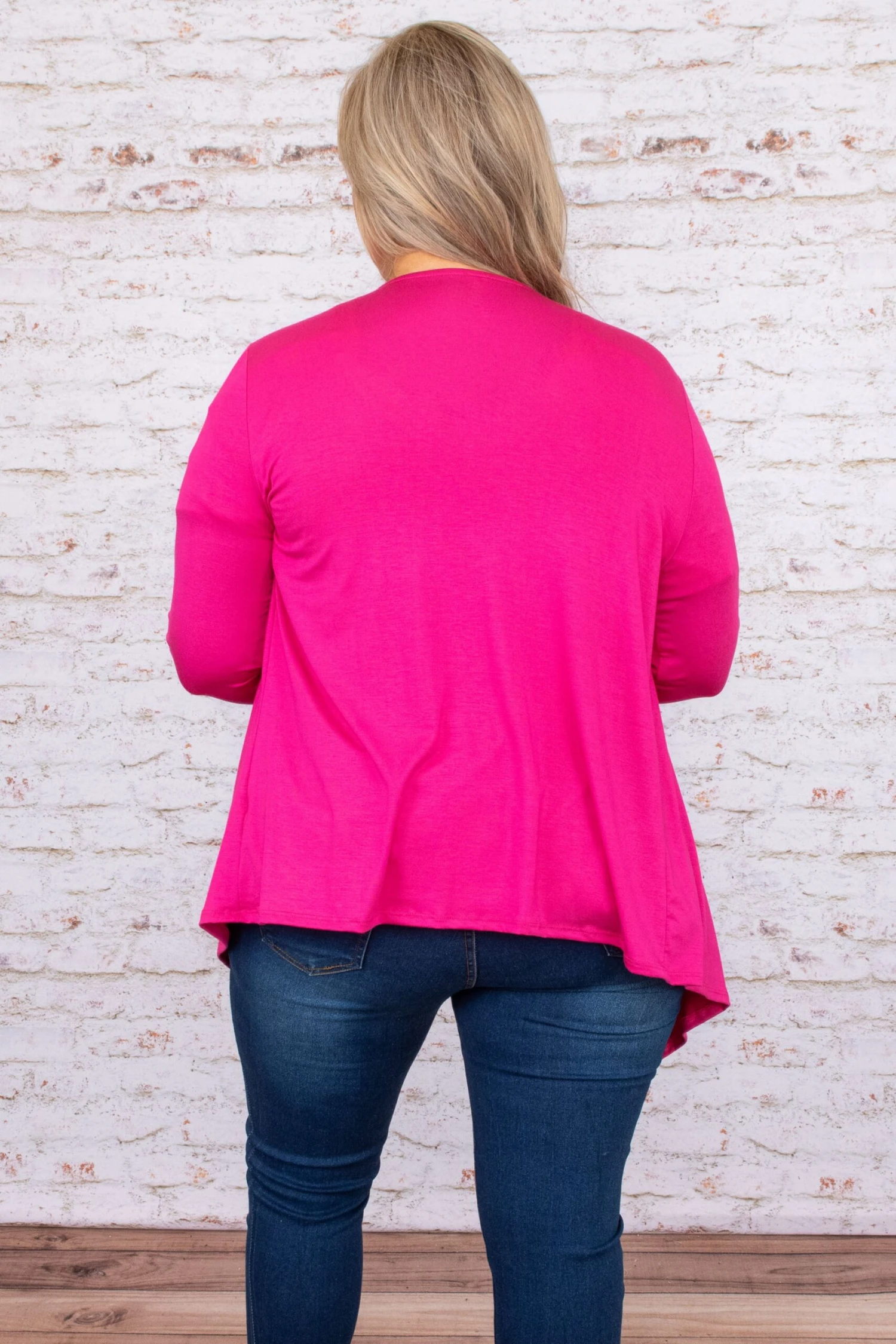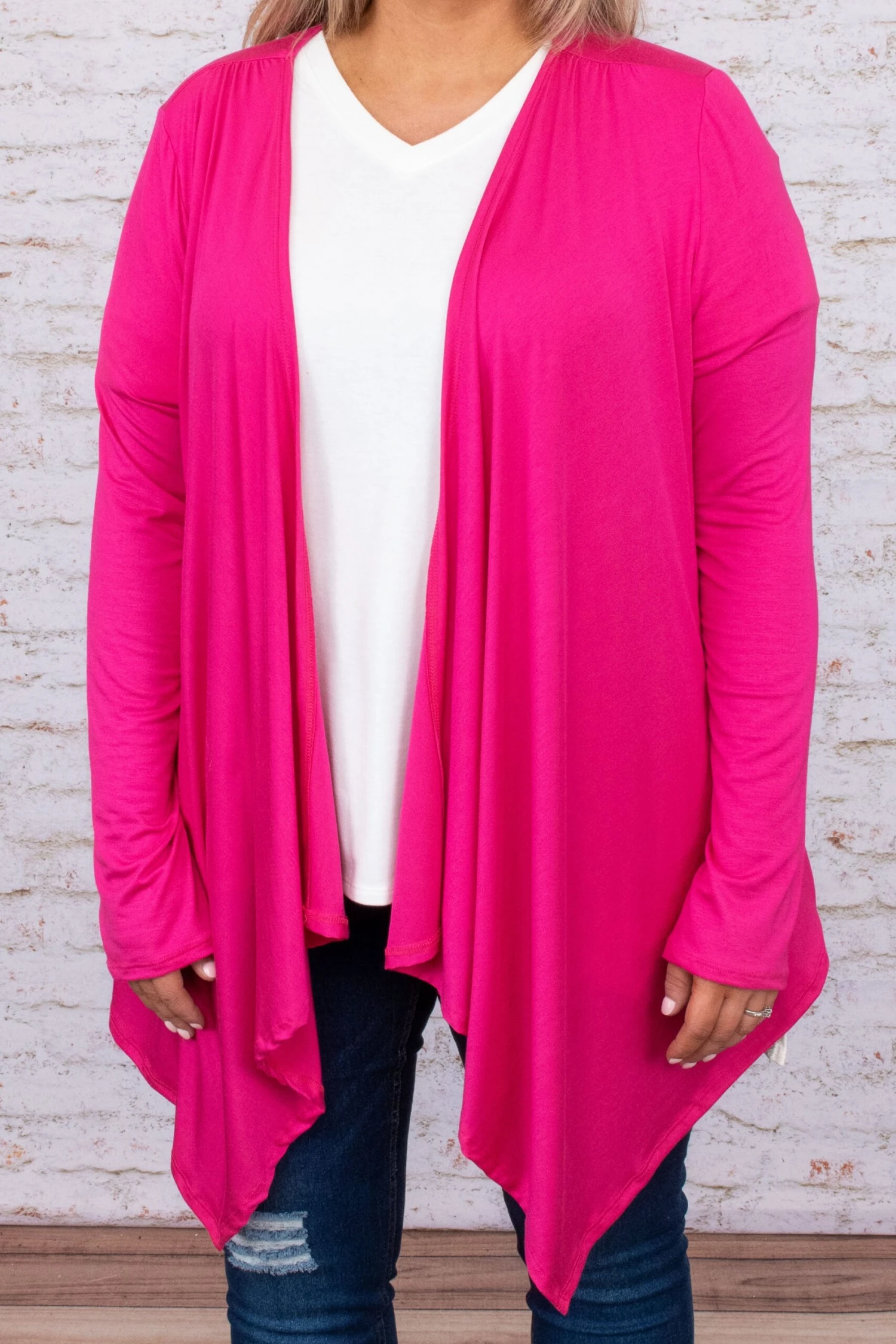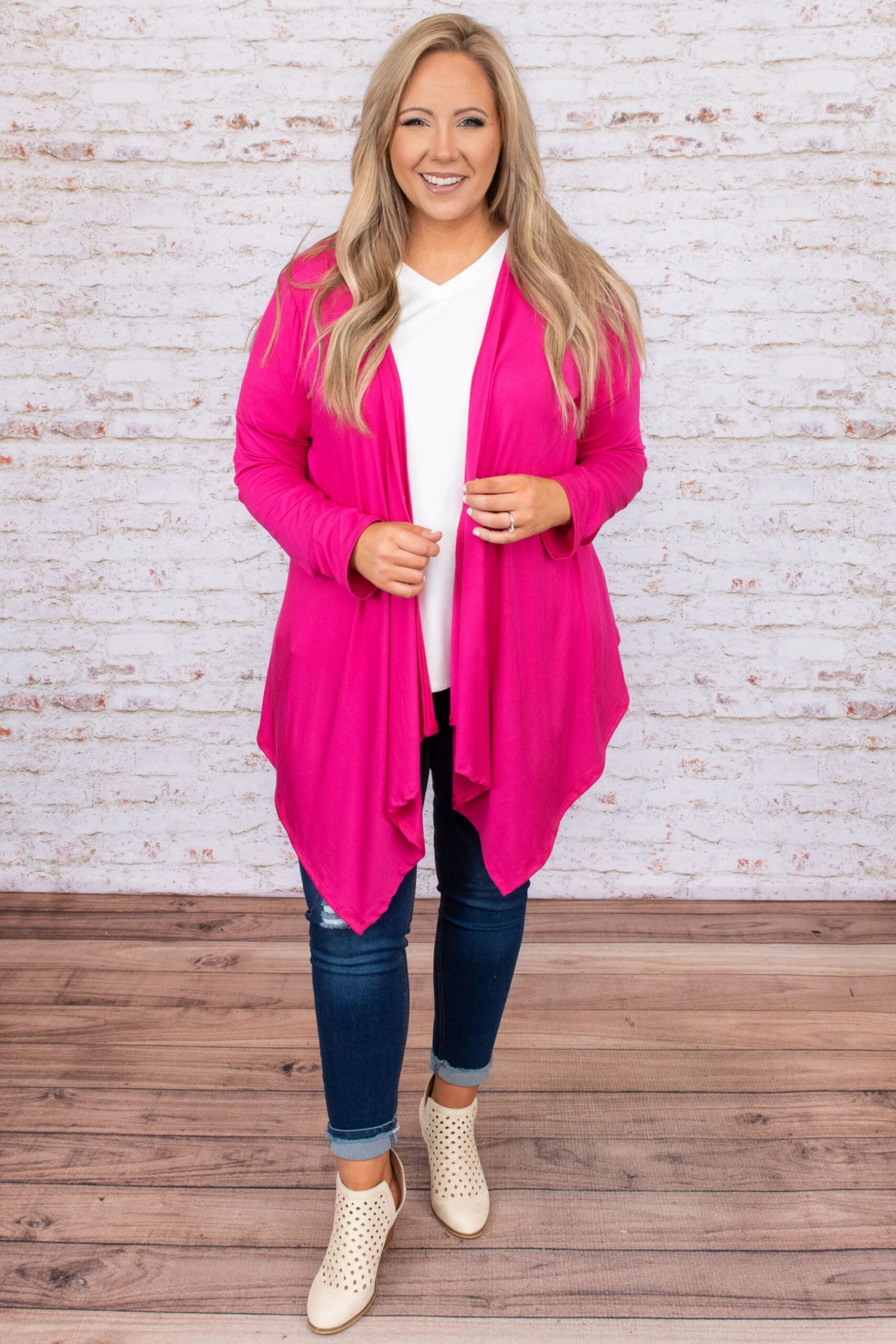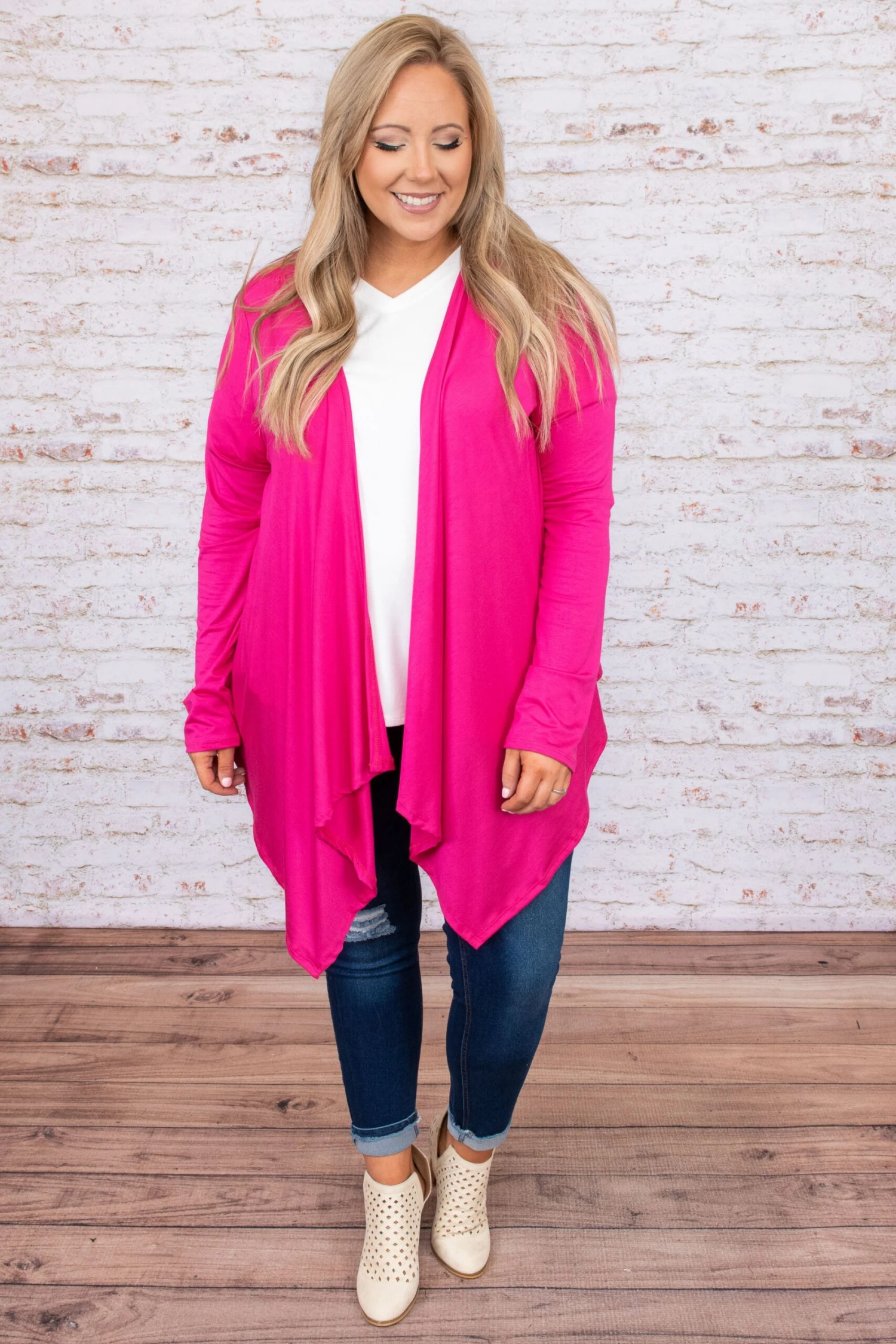 Show off your flirtatious style in this cardigan! It has a bold fuchsia color you can dress up or down and style with everything in your wardrobe! It’s comfortable for all-day wear, has a relaxed fit to flatter your figure, and is perfect for the season! Simply, style this cardigan with a solid or patterned top and skinnies for an effortlessly chic look!Â