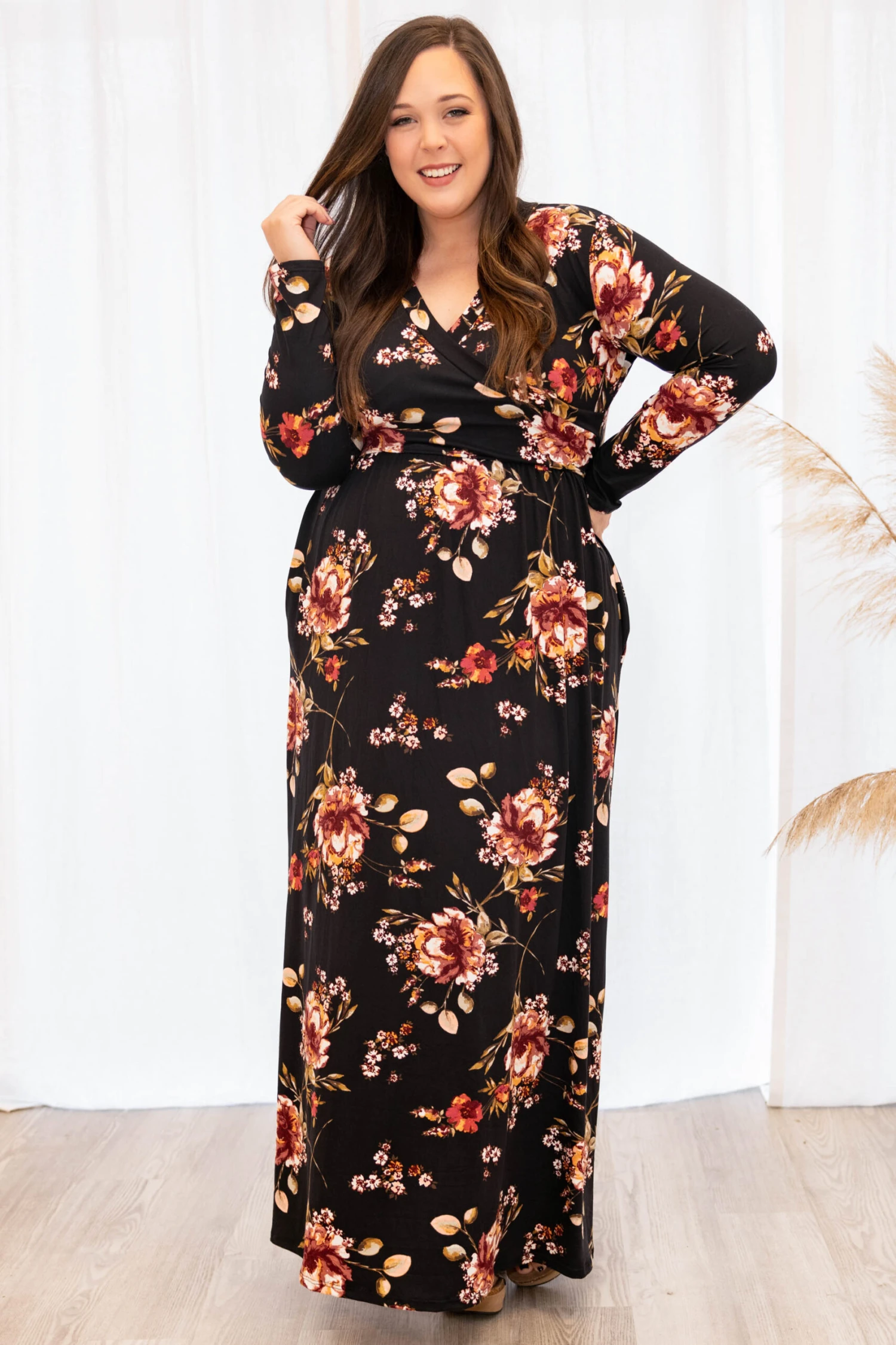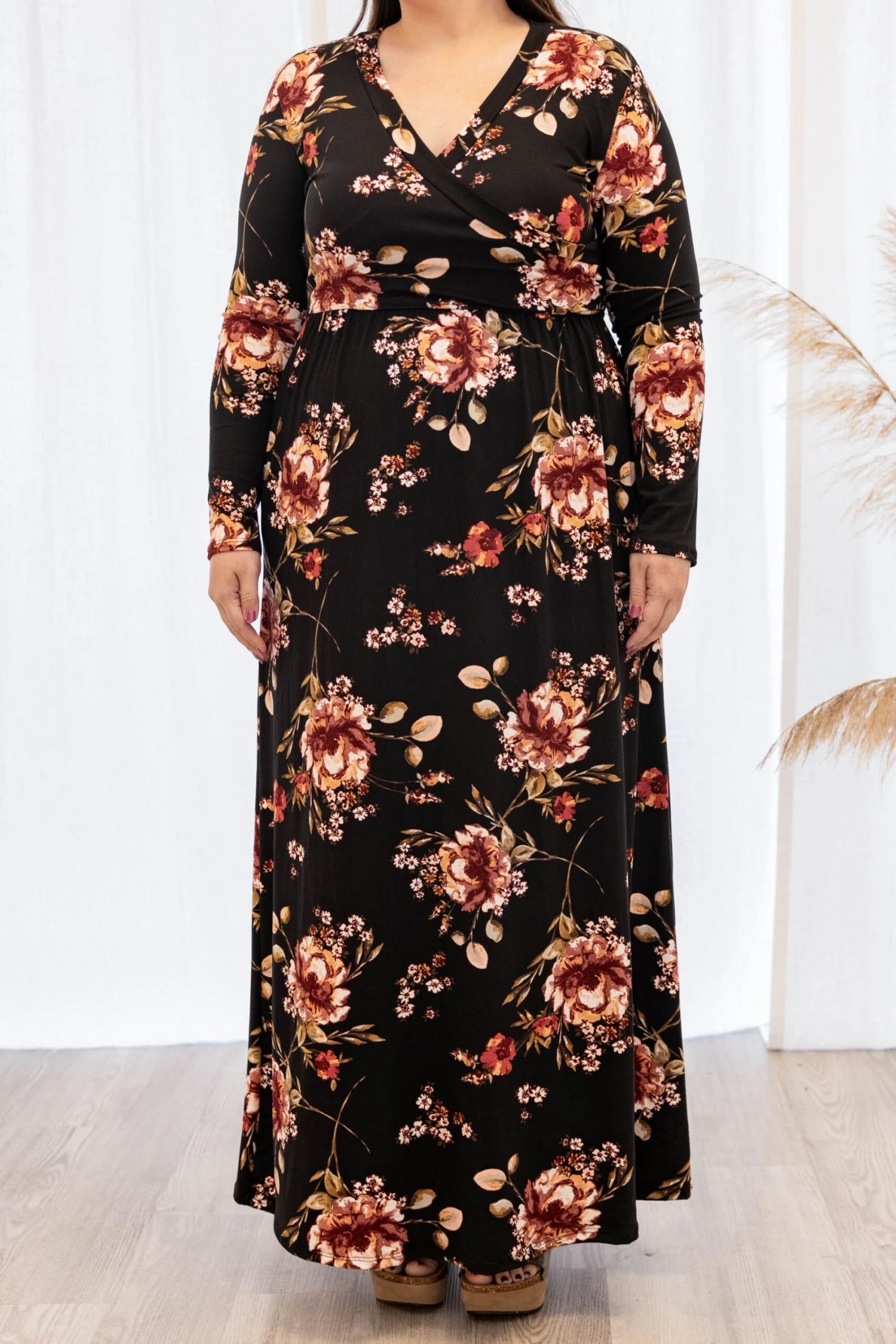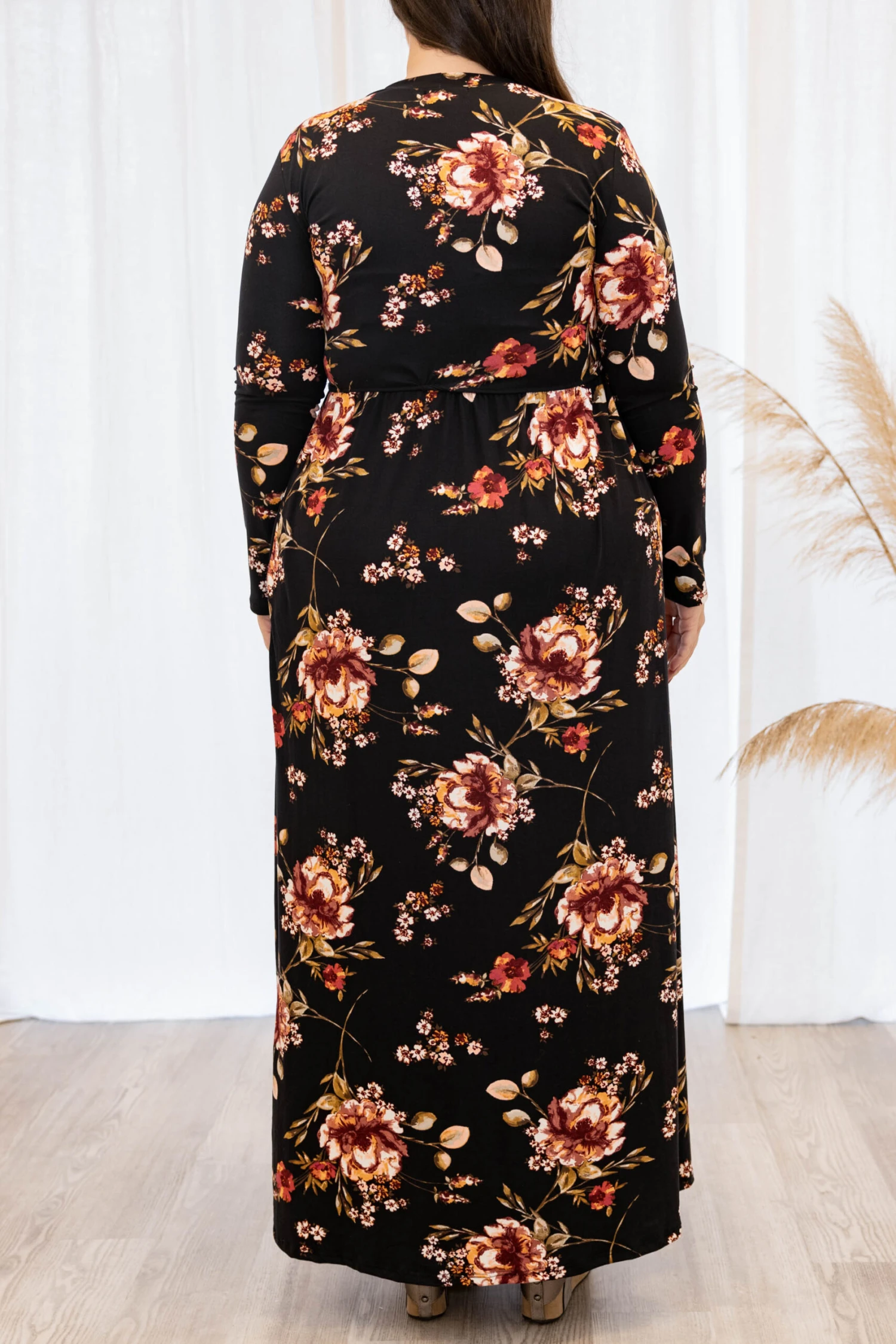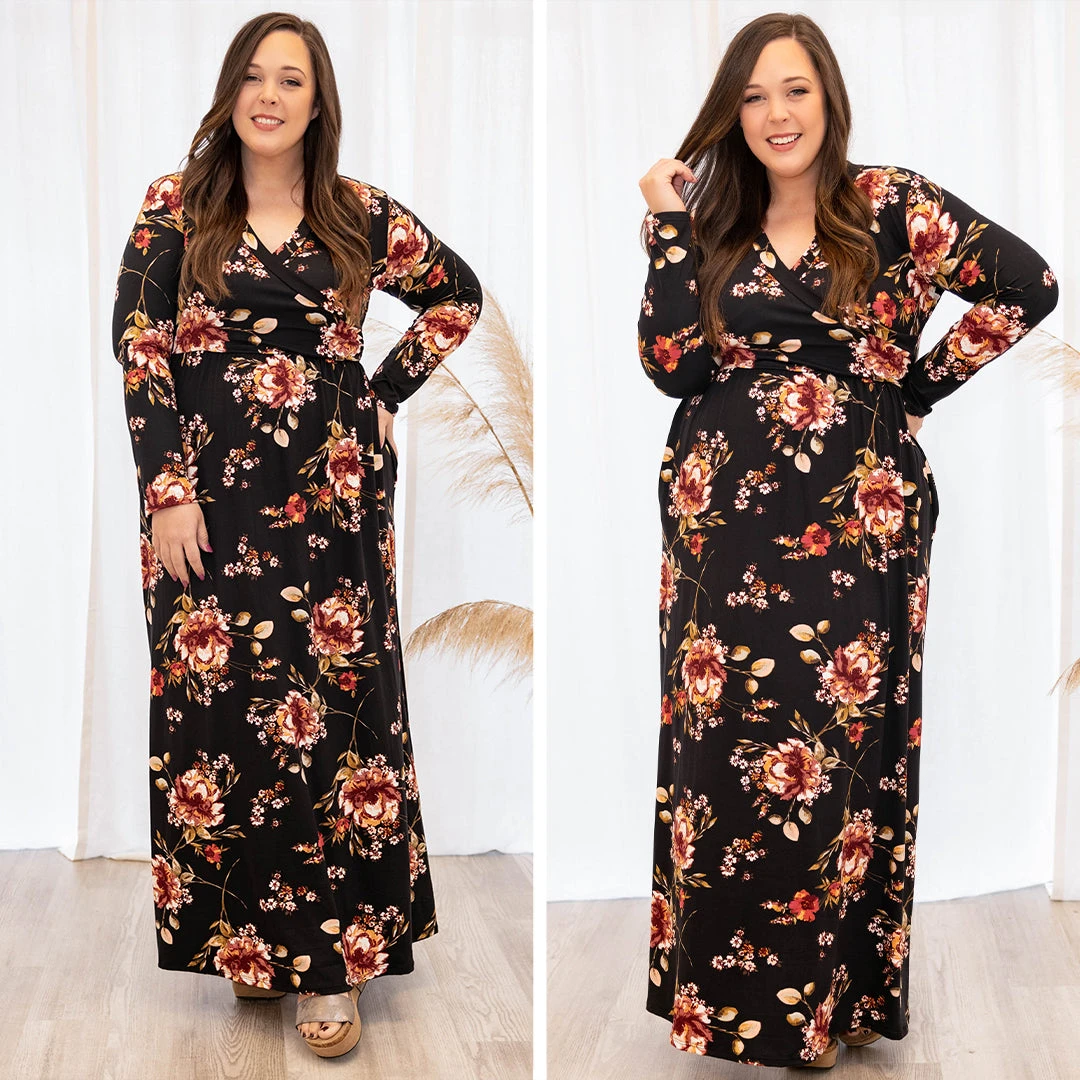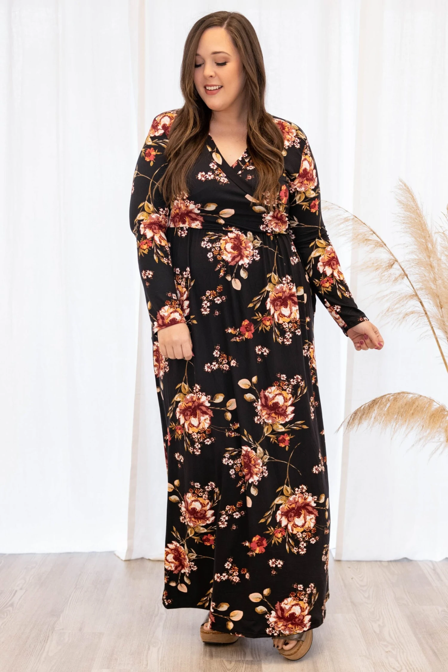 This dress is perfect for the Fall time!! It has a pretty floral pattern with neutral colors you can style for every occasion! It’s comfortable for all-day wear, has a flowy maxi dress fit! Simply, pair this dress with wedges or booties for your next event!