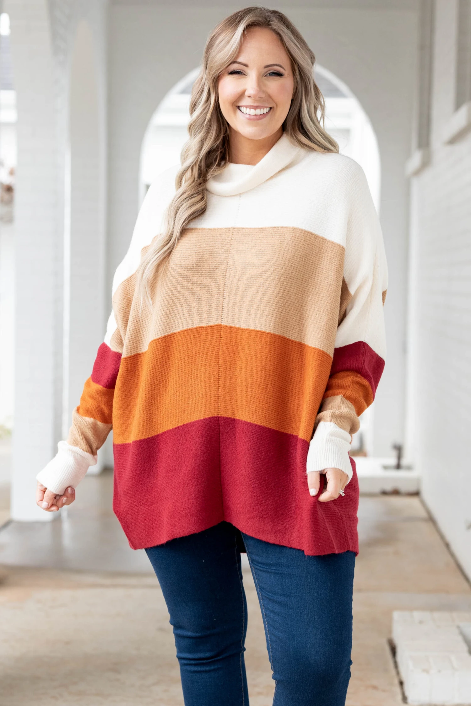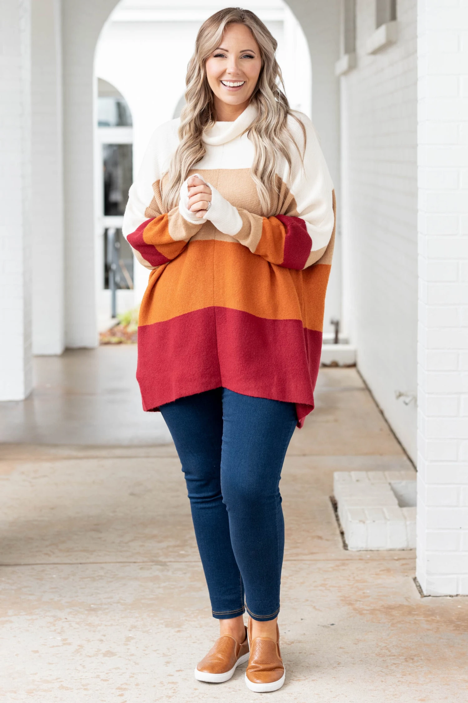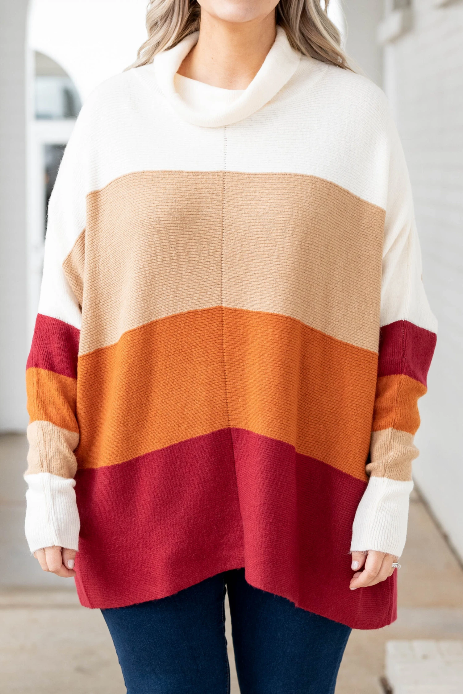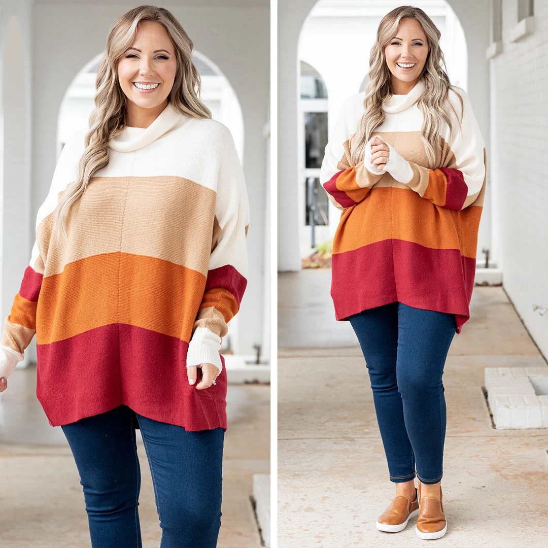 Fly above the rest with this showstopper! This sweater has a lovely crimson color with a sweet colorblock design that is just in time for the season! The high neckline and cozy fit is perfect for keeping you warm throughout the season! Style this sweater with jeggings and sneakers for a comfy, casual look!