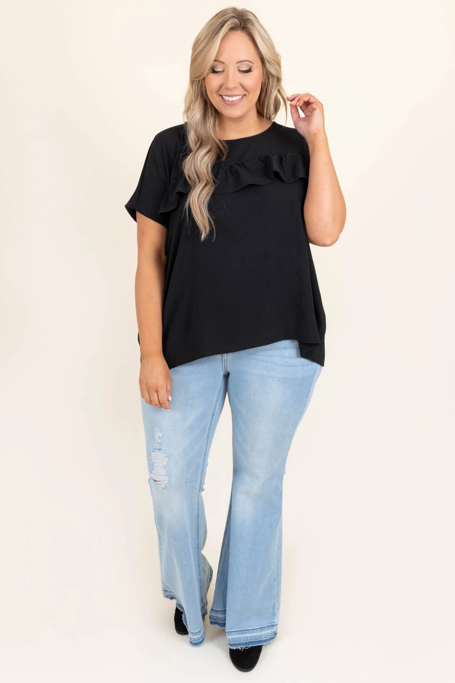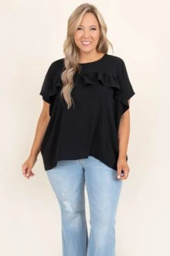 Grab a top that’s out of this world adorable! The bold black color and flowy style are figure flattering and just in time for the season! Style this top with some cute jeans and booties for an effortlessly, chic look!