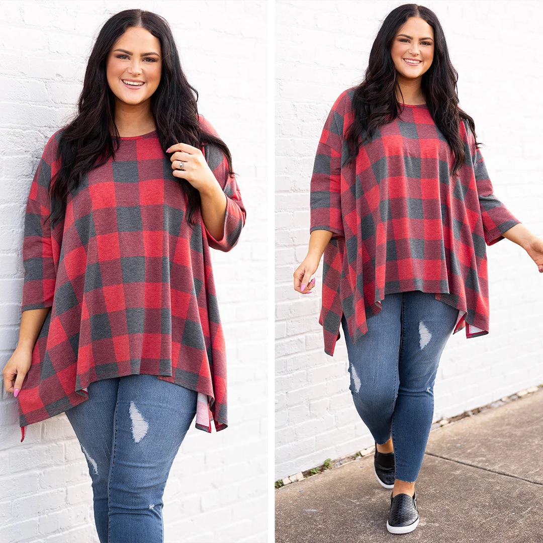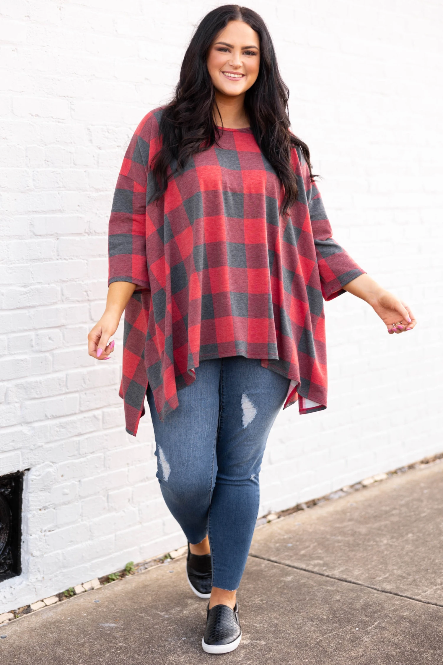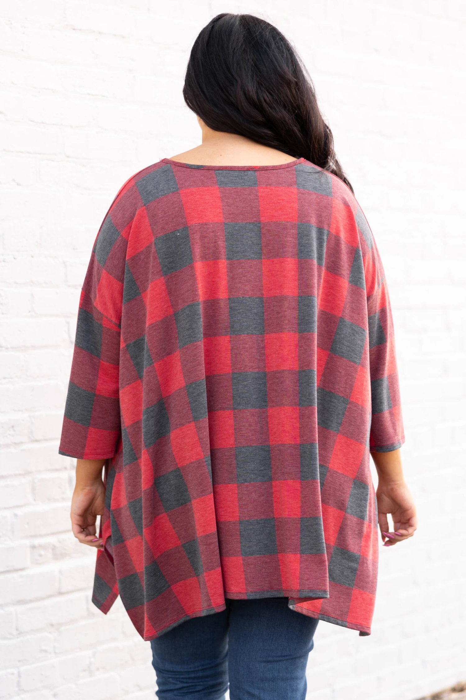 Free the inner you in this adorable top! This top has a bold red color with a trendy plaid pattern that is just in time for the season! The stretchy, figure flattering fit is great for all day wear! Style this top with some distressed skinnies or leggings for an easy everyday look!