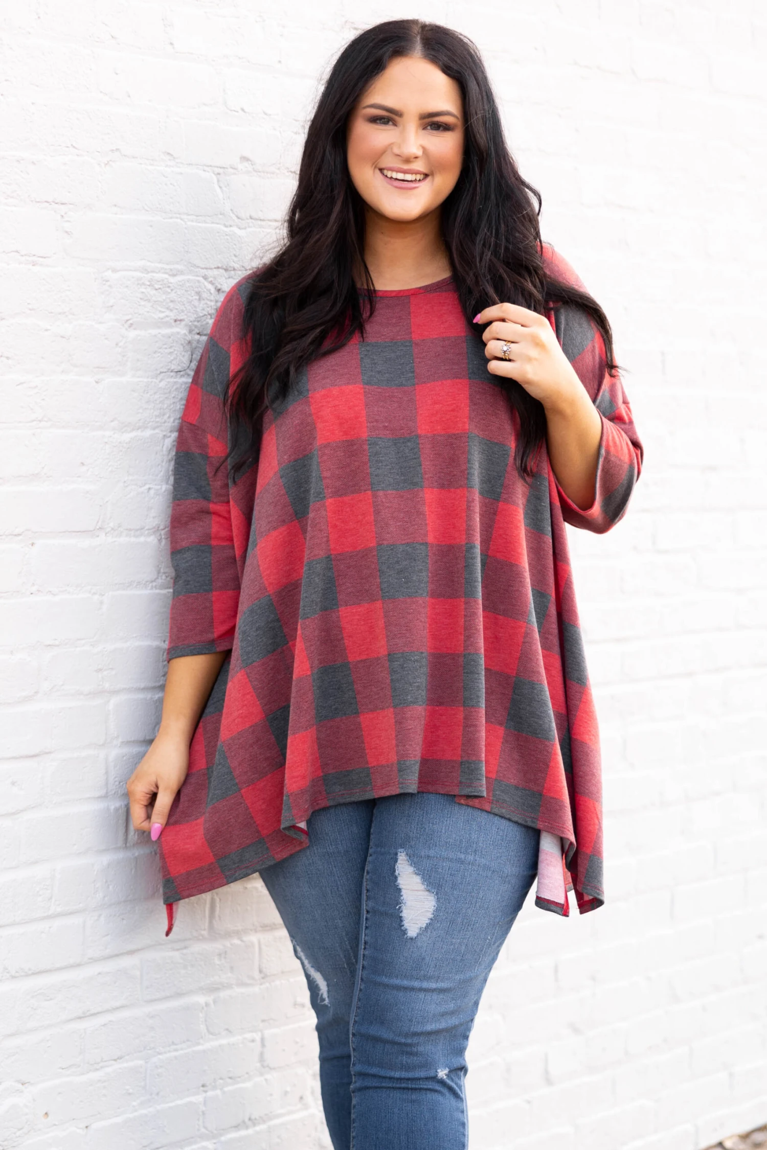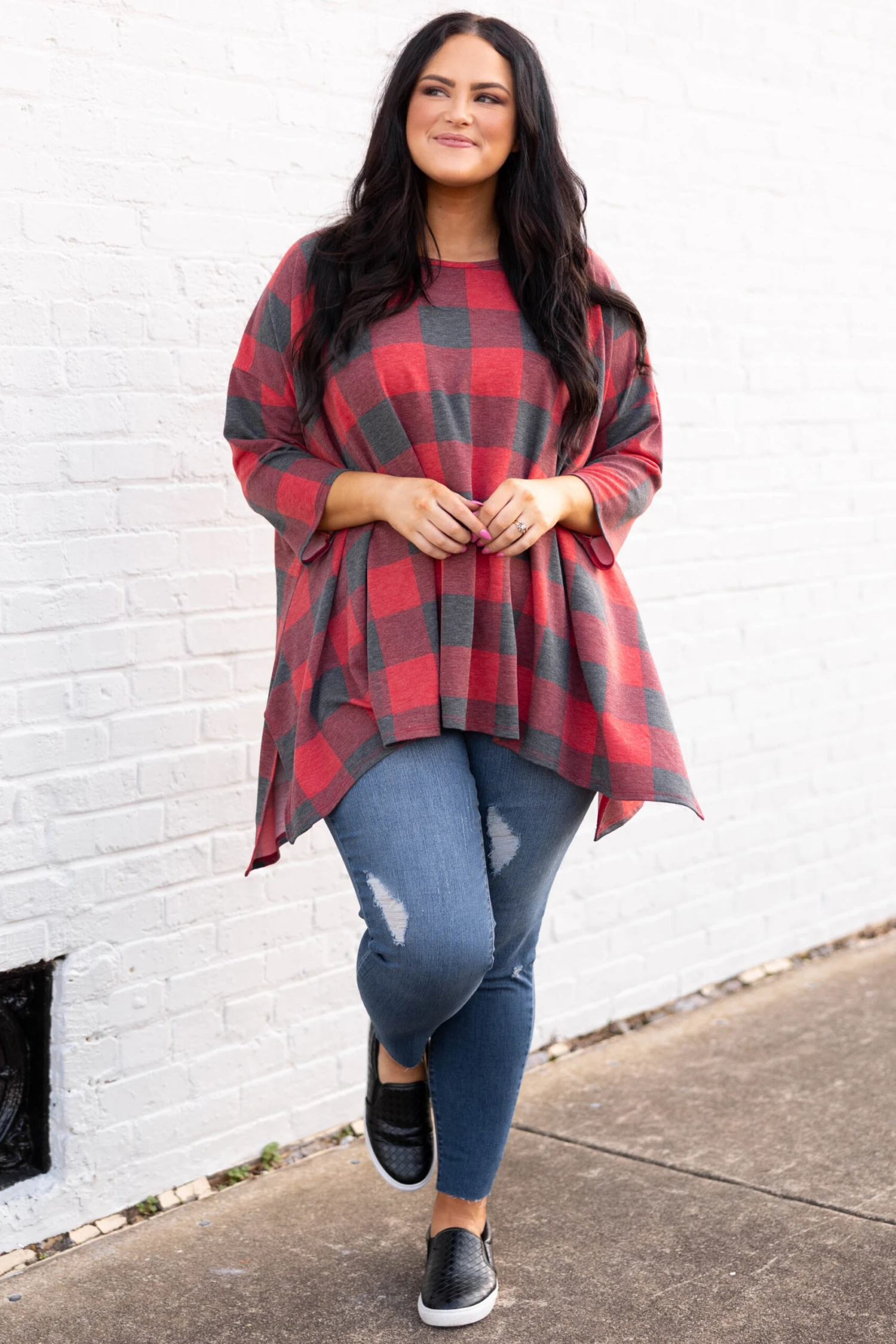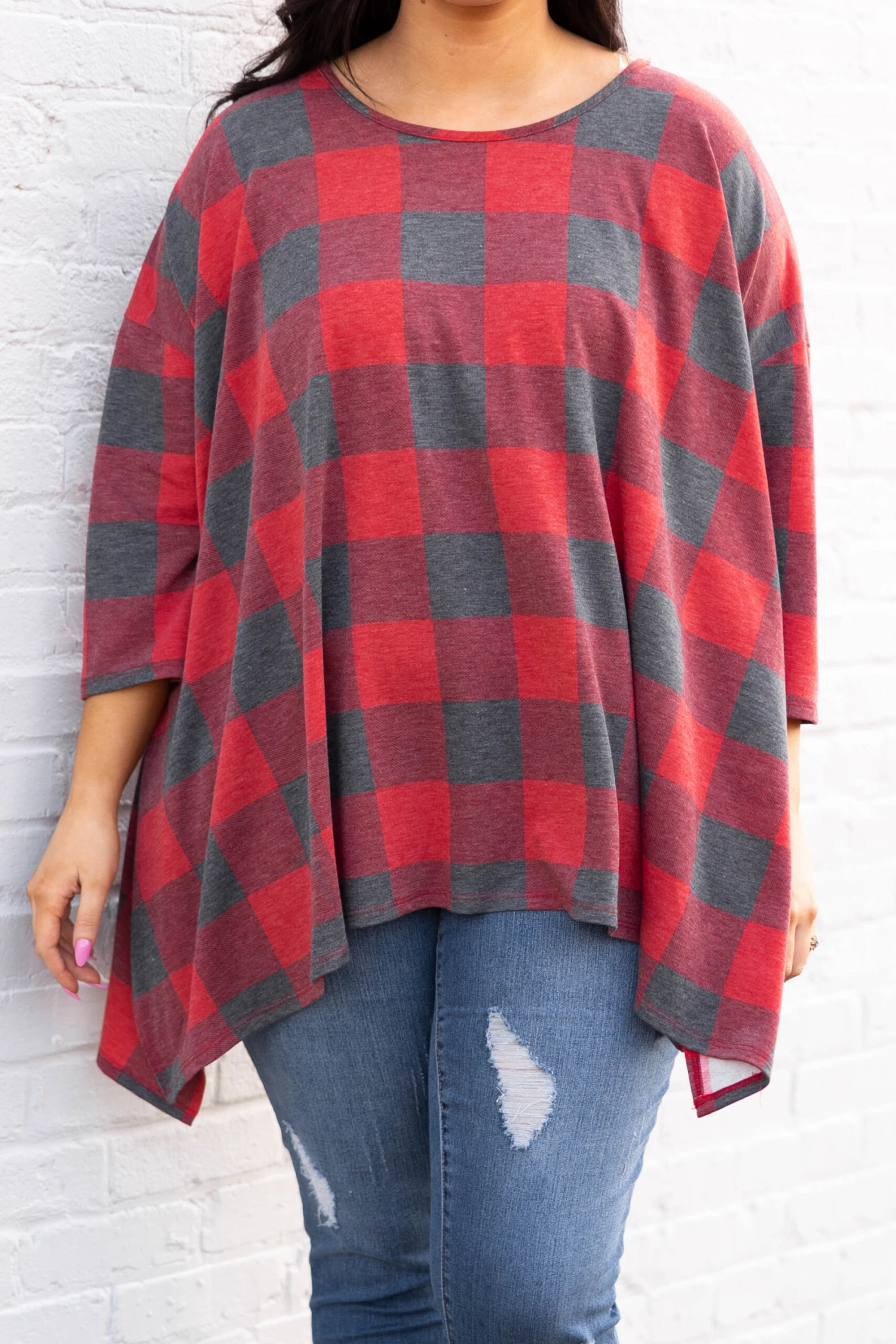 Free the inner you in this adorable top! This top has a bold red color with a trendy plaid pattern that is just in time for the season! The stretchy, figure flattering fit is great for all day wear! Style this top with some distressed skinnies or leggings for an easy everyday look!
