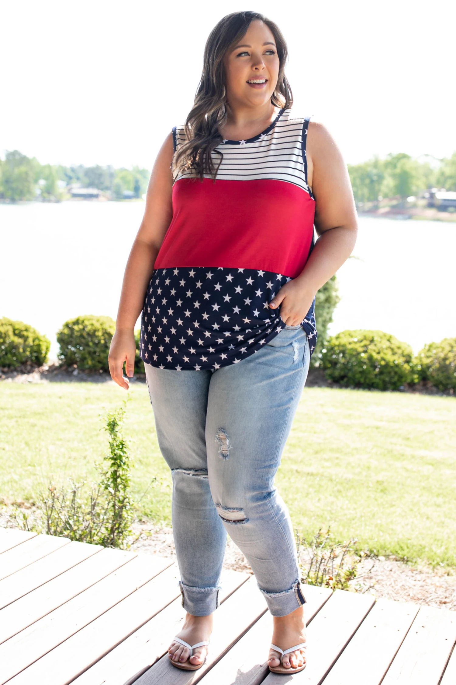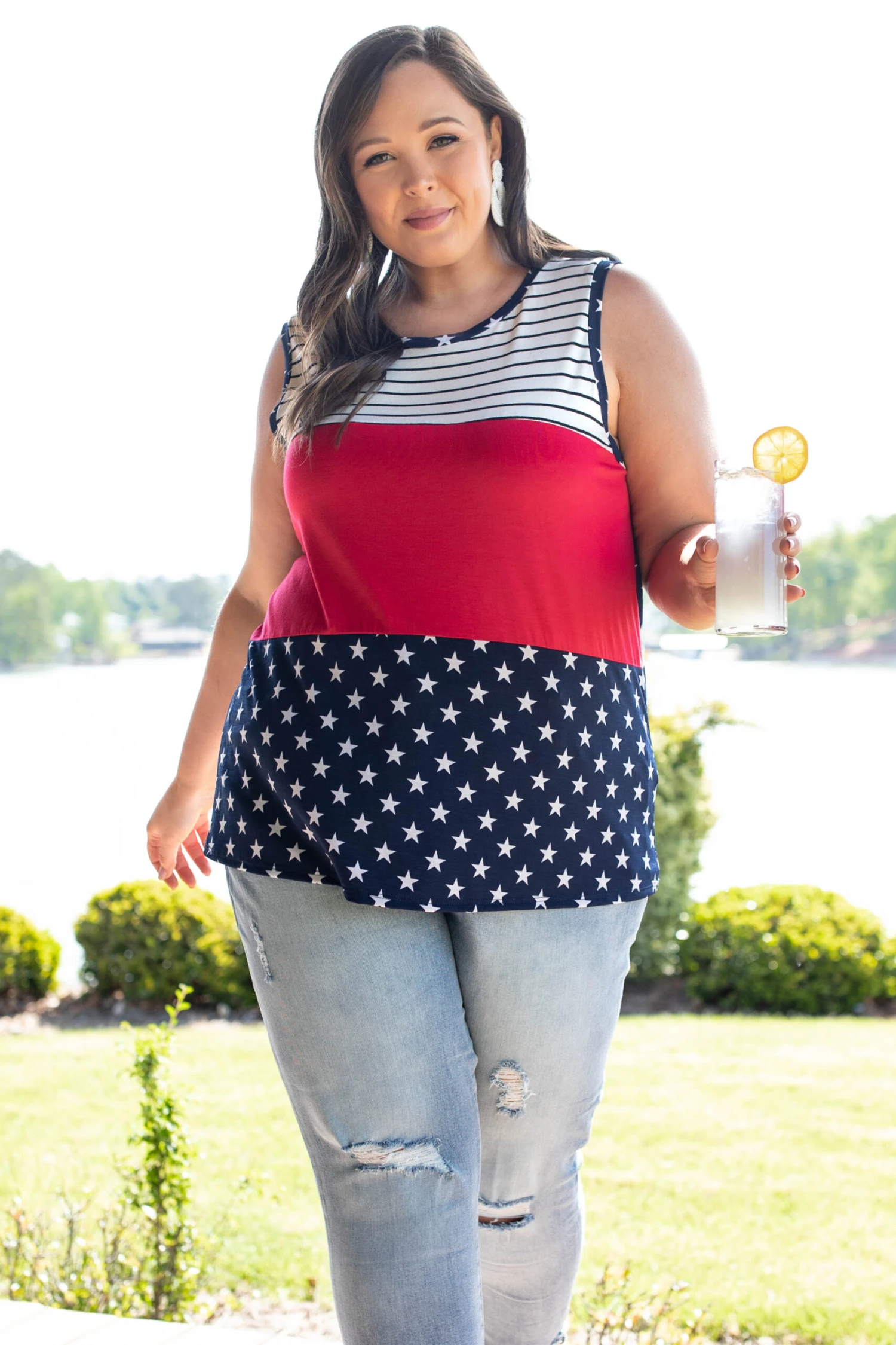 This tank was made for Summer! It has a trendy mix of stars and stripes with patriotic colors that are perfect for the season! It’s comfortable for all-day wear, has a figure-flattering fit, and can be styled with your favorite shoes and accessories! Style this tank with skinnies or shorts for an effortlessly chic look!