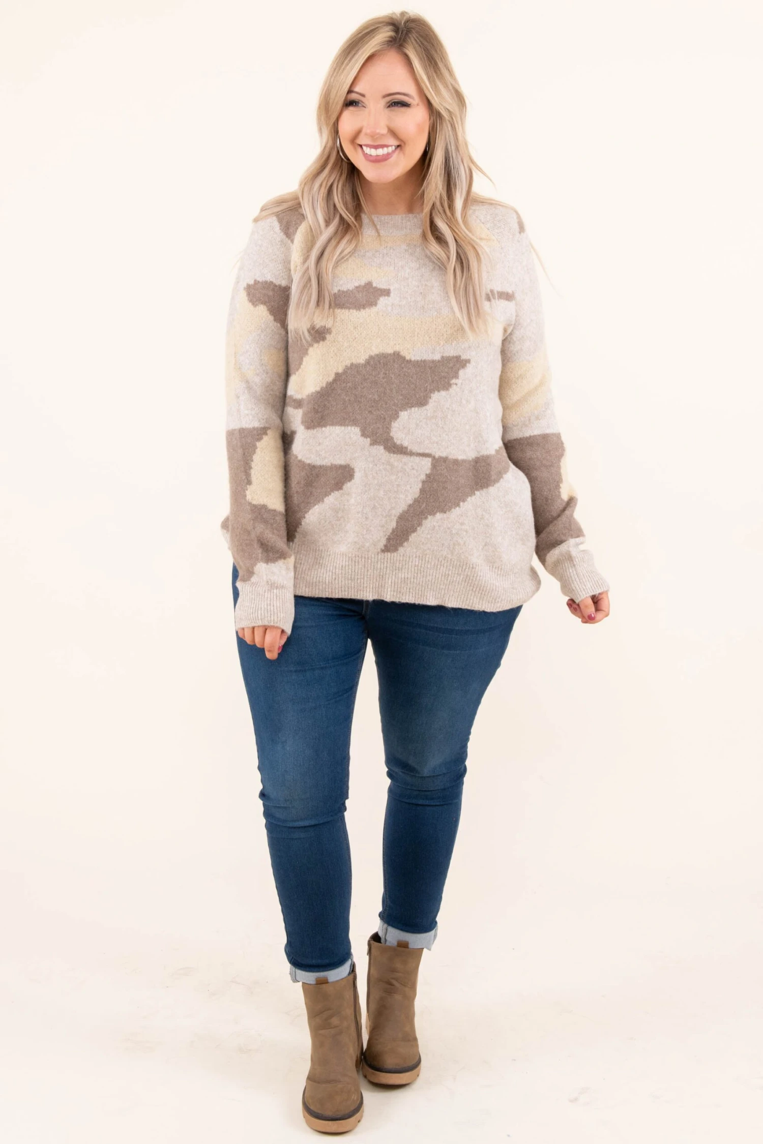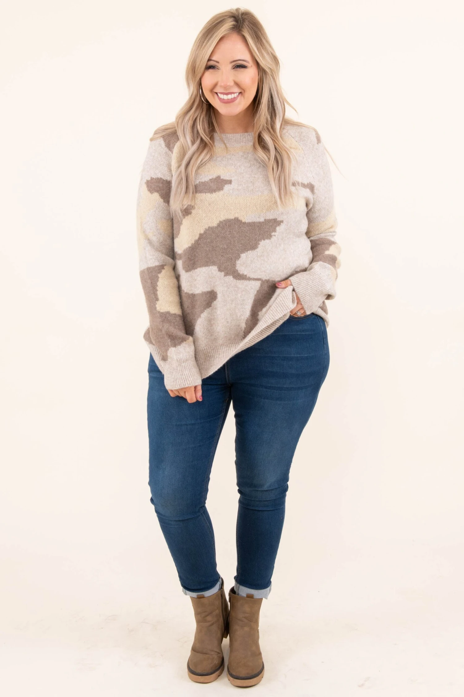 You can wear this sweater from dusk til dawn! This top has a trendy camo print pattern you can style with your favorite pieces! It’s comfortable for all-day wear and is super soft! Wear this sweater with skinnies for an effortlessly chic look!Â