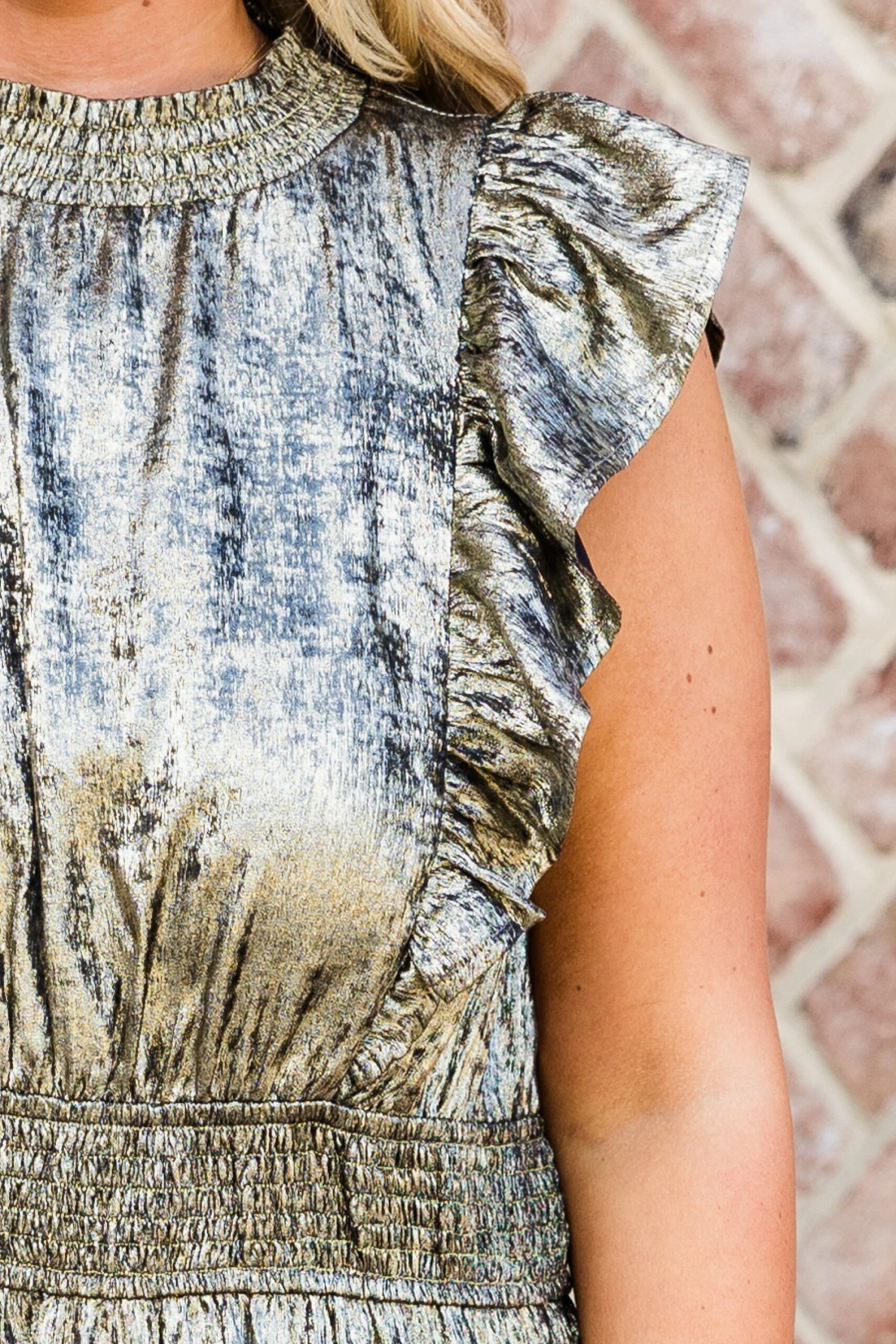 Indulge in luxury with this dress in gold! This stunning tiered maxi dress features a cinched waist detail, smocked neckline and ruffle shoulder accents! The short sleeves and shimmering gold metallic print add a touch of sophistication to this elegant piece! Feel enchanted in this exclusive and tasteful dress!