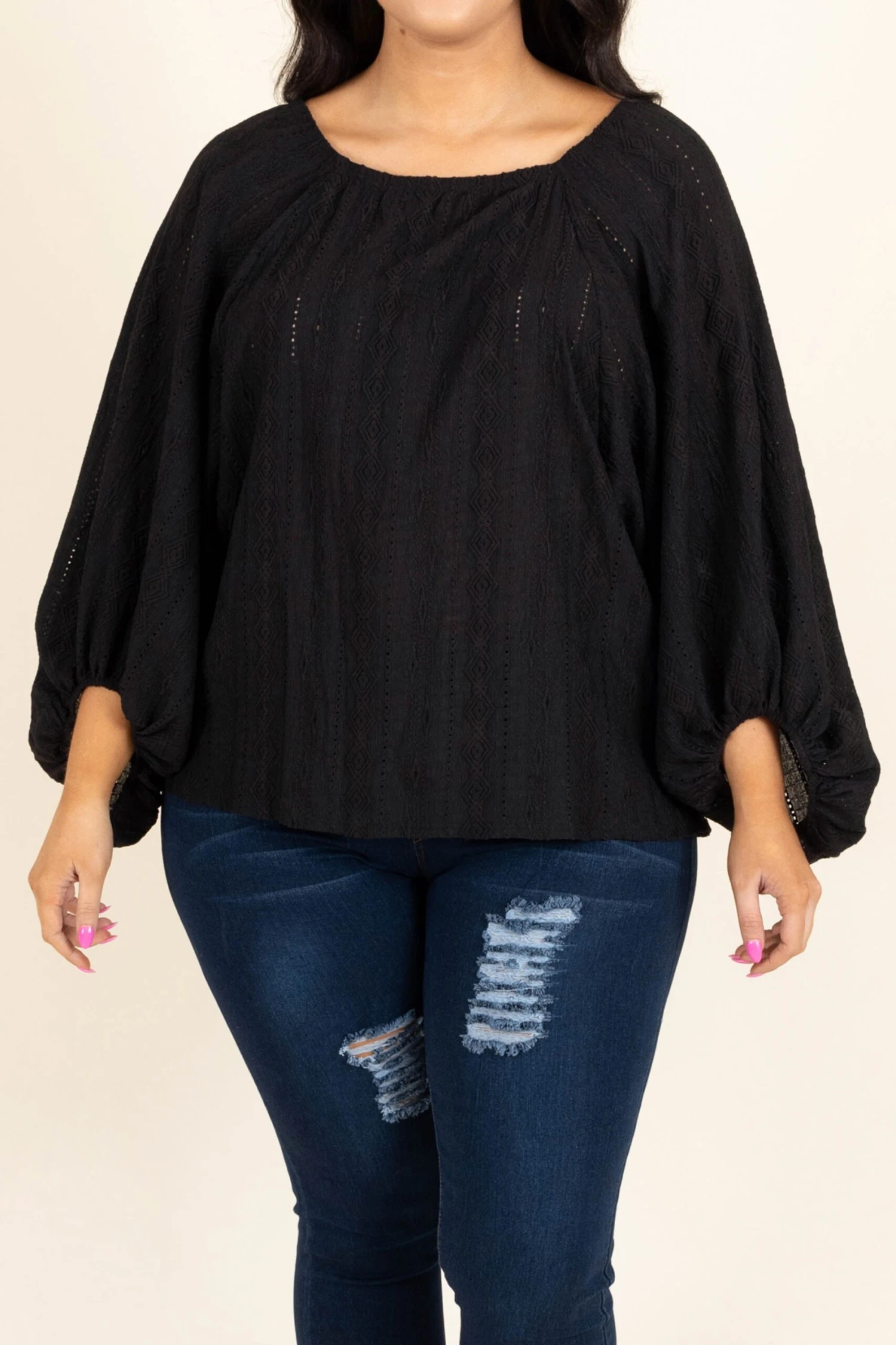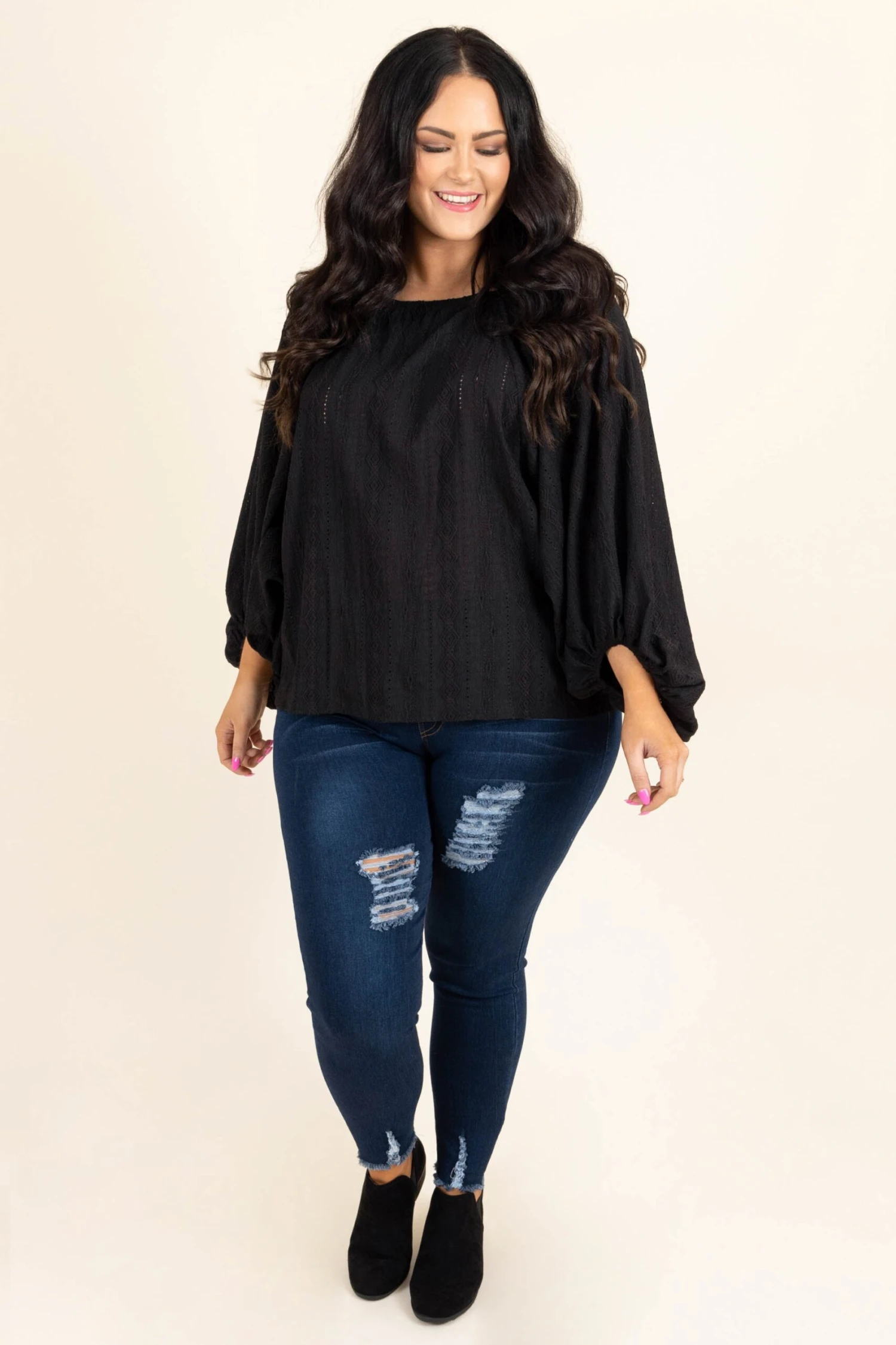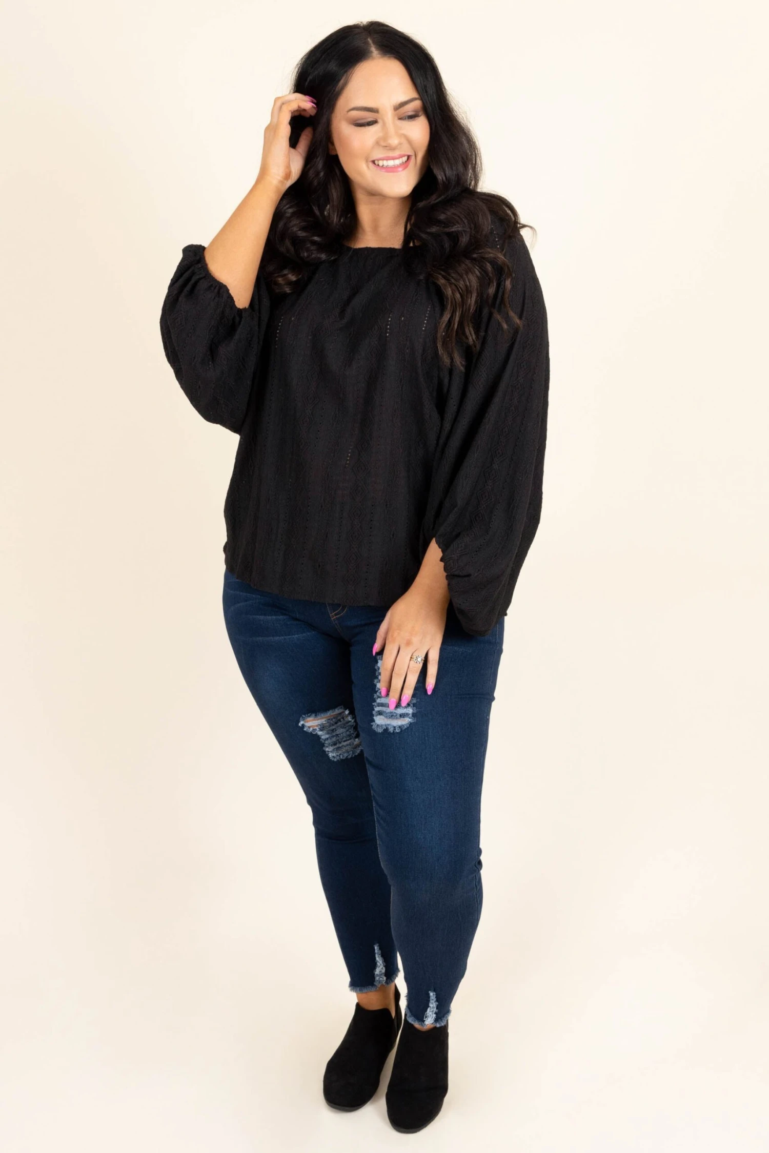 You won’t want to stay at home in this beautiful top! The bold black color and textured pattern are so chic! This top is so comfy you’ll feel like you’re right at home this season! Style this flowy beauty with some cute accessories and skinnies for a classic, trendy look!