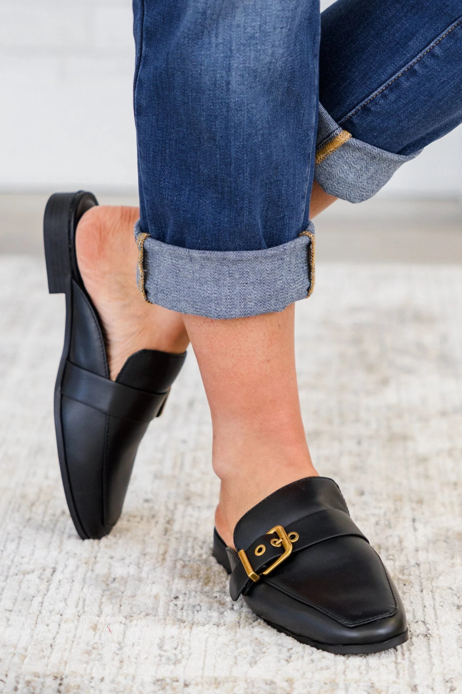 Elevate your everyday style with these mules! Made from sleek black faux leather, these slip-on shoes feature a rusted gold buckle and a square-toe design! Perfect for adding a touch of elegance to any outfit!