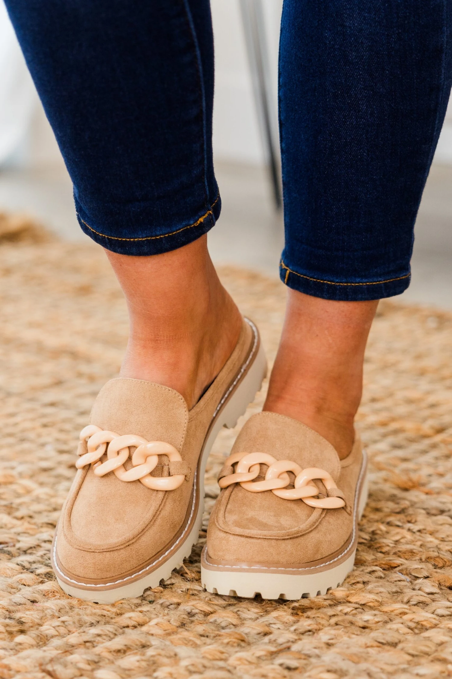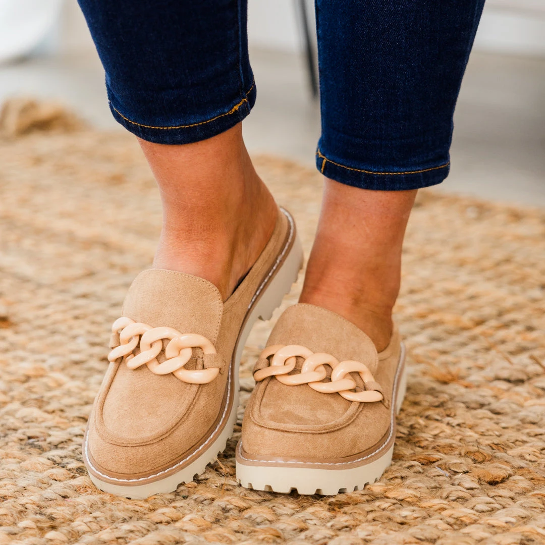 Get ready to step into fall with our Glitter And Gold Mules! These taupe shoes are the perfect slip on and go option, with a chunky chain detail that adds a touch of glamour! Stay on trend and comfortable with these must-have mules!