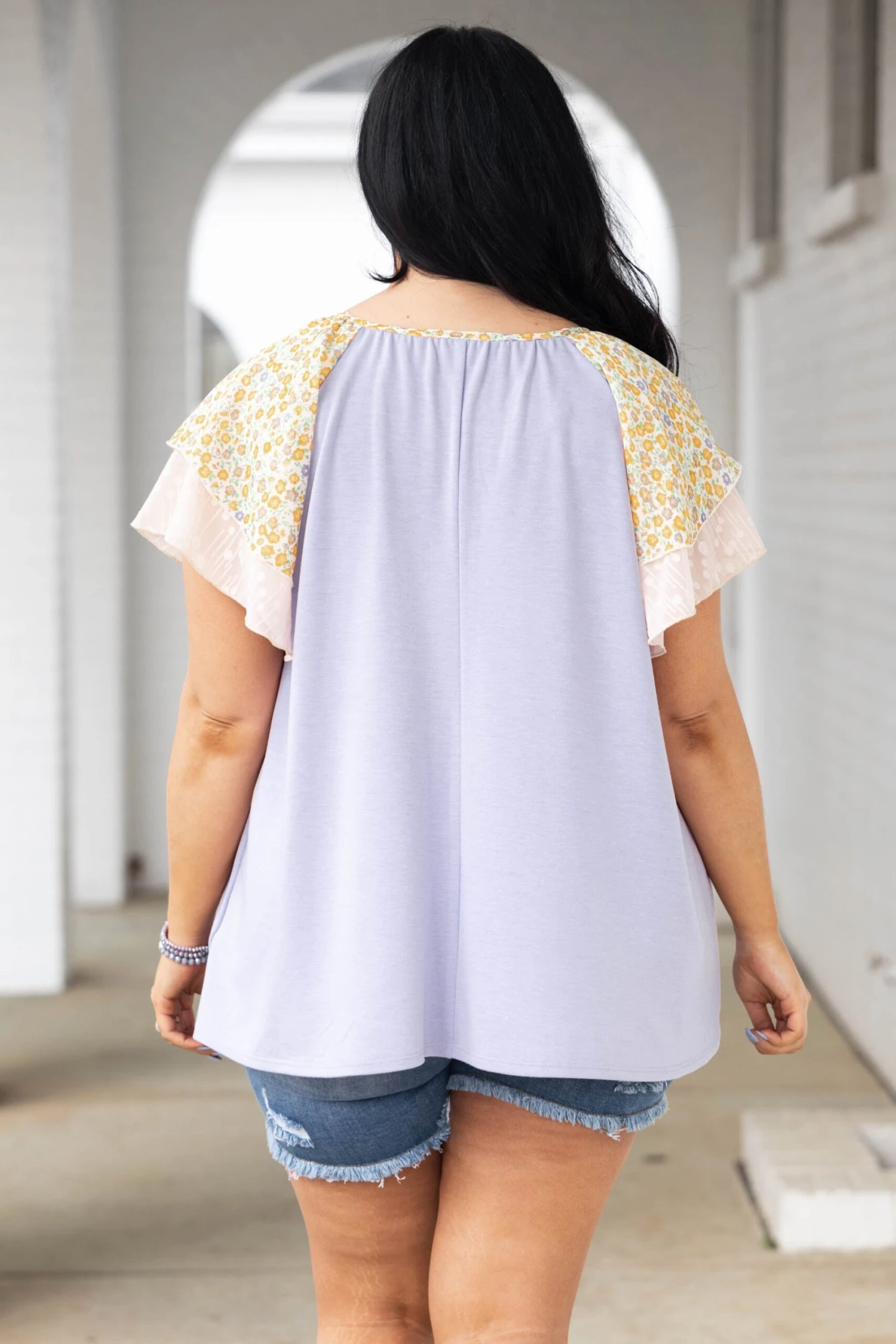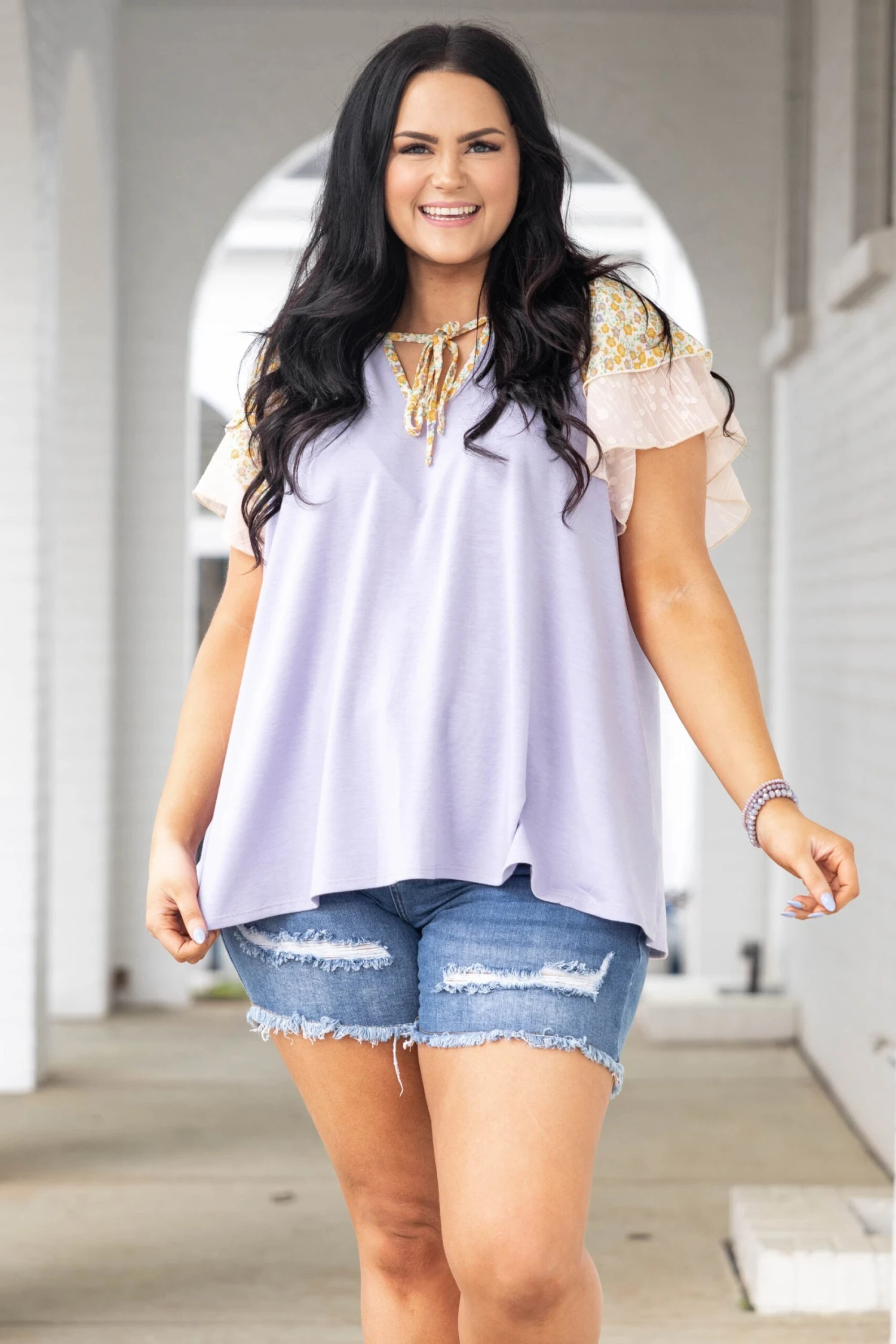 This top makes us so happy! The beautiful lavender color and floral pattern work well together for any occasion! The light-weight material is so comfy for all-day wear! Style this cutie with some shorts and your favorite sandals for an effortlessly chic look!