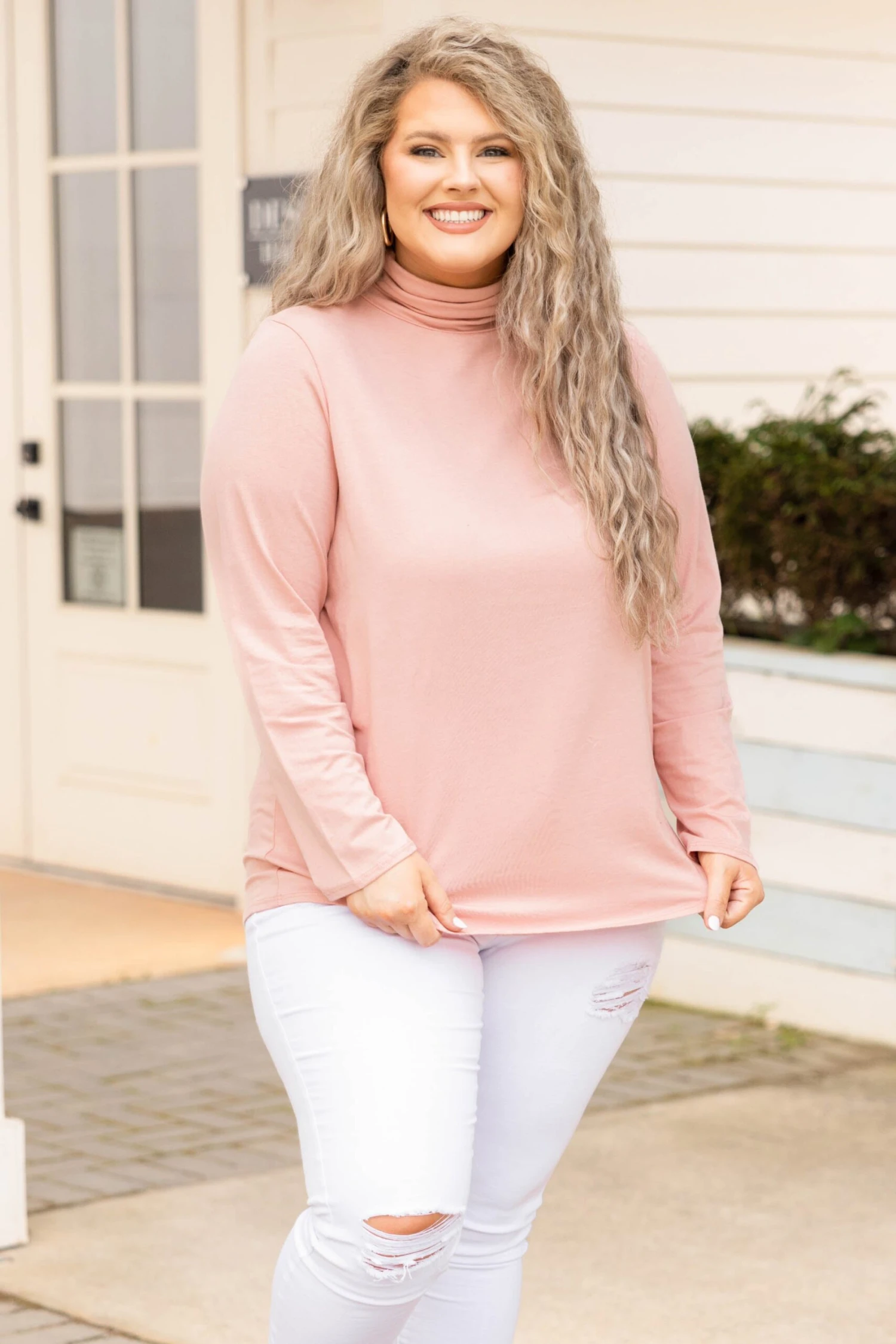 This is the top you should be chasing after! This classic little number has a dusty pink color, cozy turtleneck, and a flowy fit. It’s ultra-flattering and perfect for work, church, date night, or a fun weekend getaway! Wear it casual with distressed skinnies or dress it up with a bold necklace and flares!