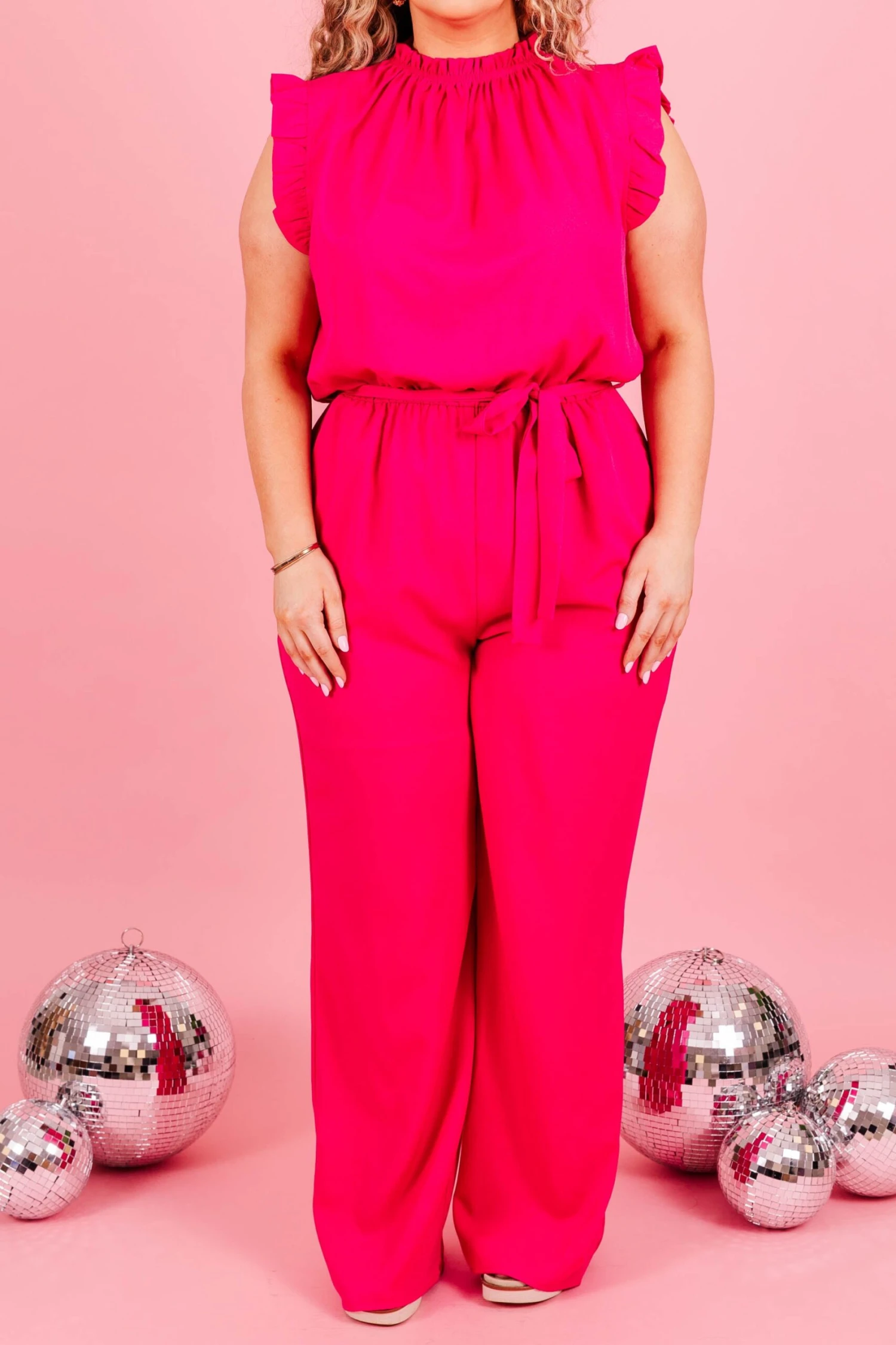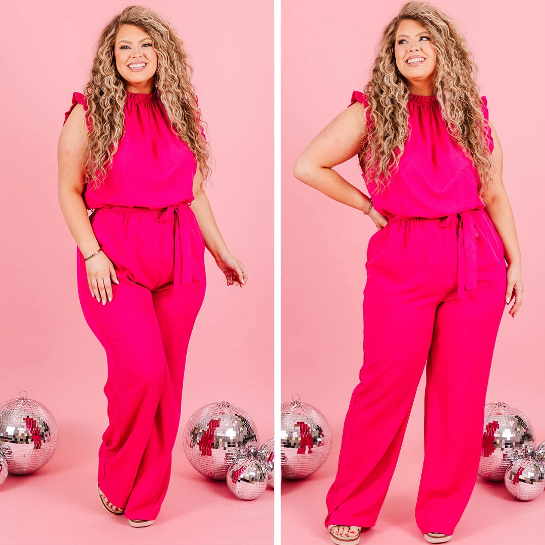You’ll look like a queen in this gorgeous jumpsuit! It features a bold fuchsia color, ruffled neckline and sleeve hemline, giving it a feminine touch! Plus, with the adorable waist tie, it combines practicality with style! Perfect for making a statement and keeping your essentials close at hand!