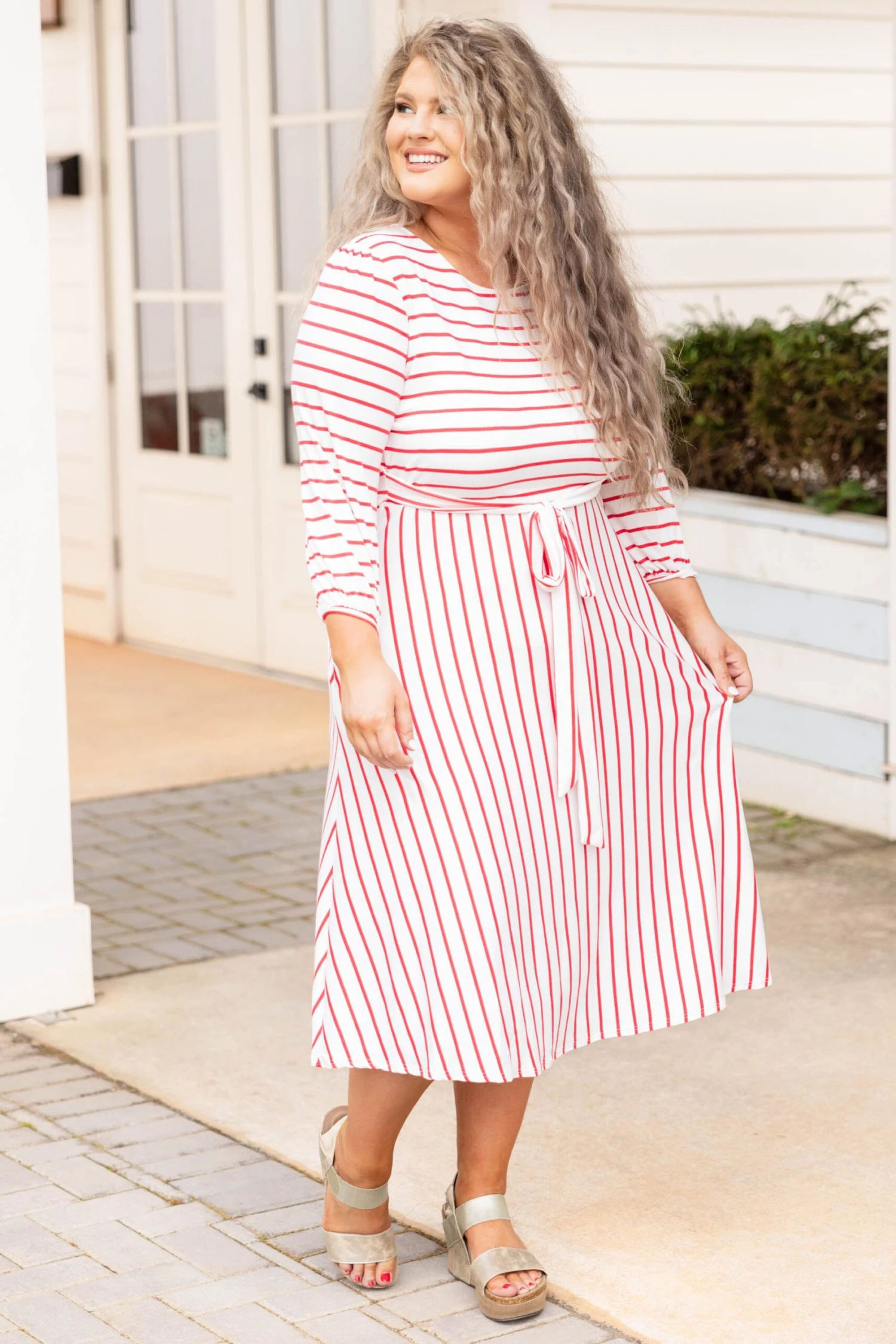 Hold hands with your love when you’re wearing this dress! This dress has the prettiest stripe pattern with a soft coral color you can style for every occasion! It’s comfortable for all day wear, has a tied waistline to flatter your figure, and even features pockets! Simply style this dress with heels or wedges for your next date night!
