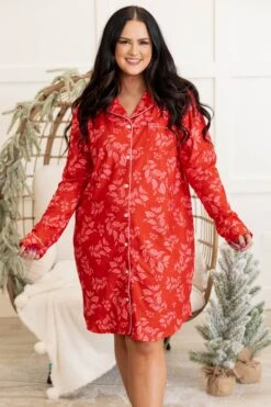 Tis’ the season to be jolly! This adorable pajama dress has a bold red color with a festive pattern that is just in time for the season! The comfy, figure flattering fit is perfect for lounging around! Throw on some slippers and sip some eggnog in this beauty!