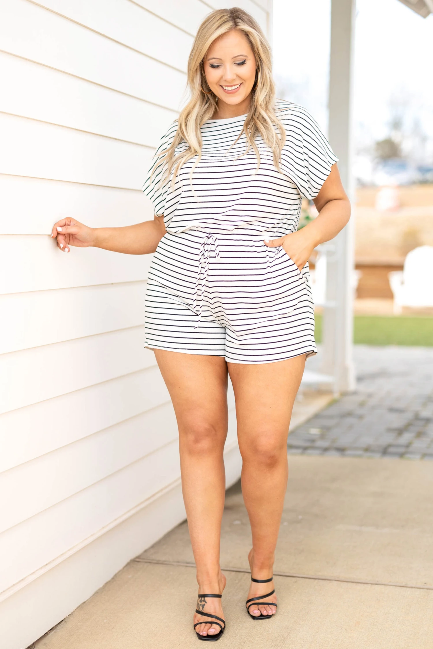 Live the Hollywood lifestyle in this amazing romper! This cutie has a pretty striped pattern, a ribbed material, and a fun tie at the waist! Style this with some black heels for a look that screams style!