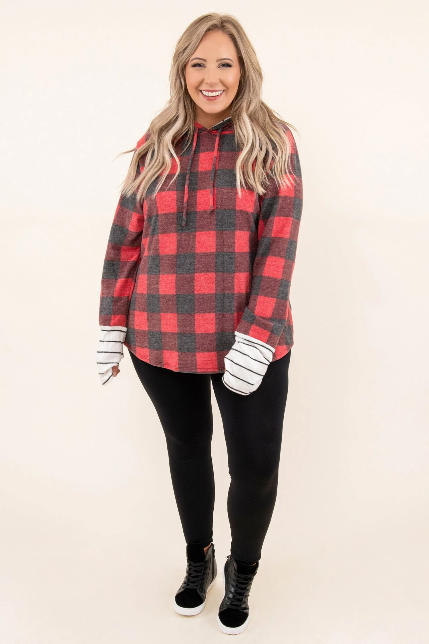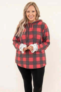 This is the hoodie you have been searching for! It has a classic red plaid print with a pop of stripes around the wrist and in the hood! Pair it with skinnies and booties for a trendy outfit!