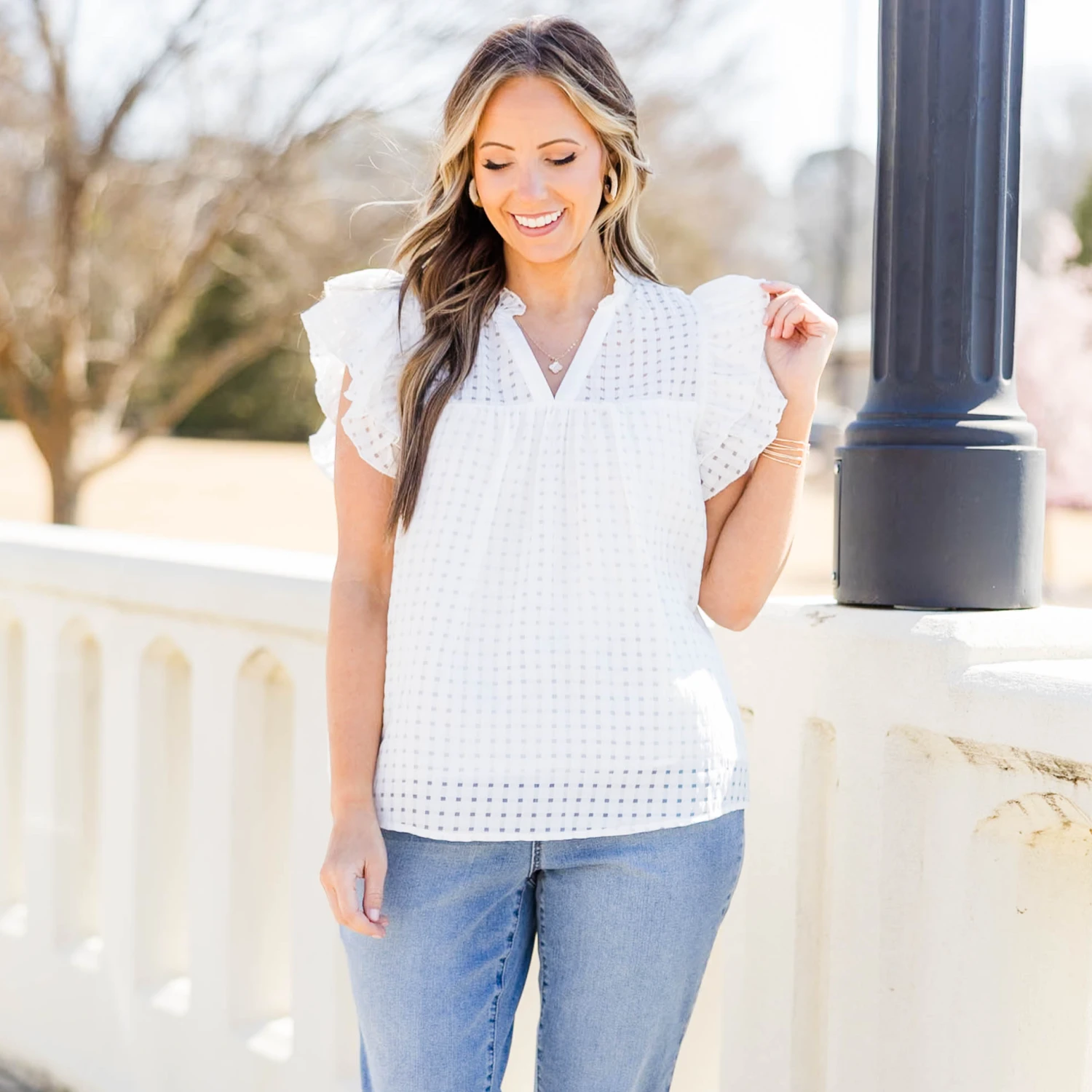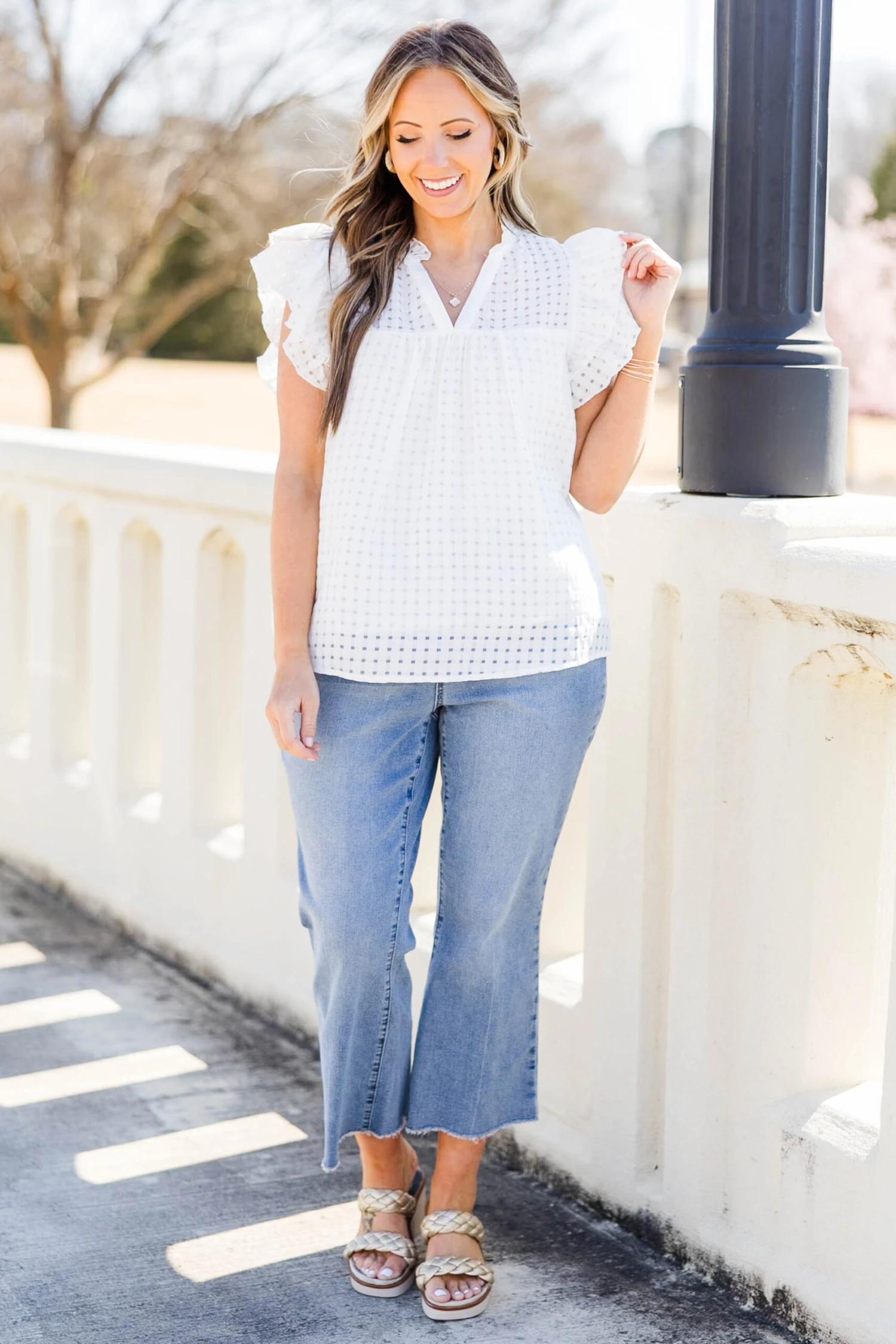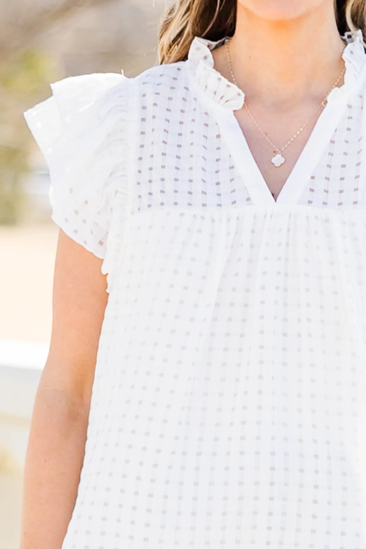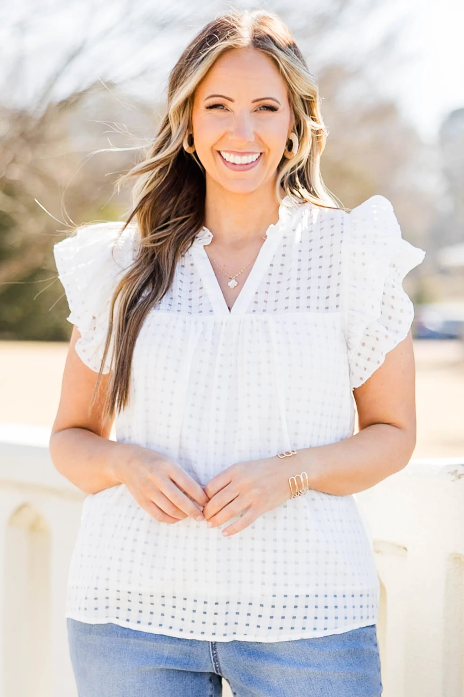 Home with you is where this top should be! It features a lightweight design and flutter sleeves for a chic and comfortable fit! Its classic white color and plaid pattern make it versatile to pair with any outfit, making it a must-have addition to any wardrobe! Elevate your style with cute denim or colored pants for a timeless and chic look!