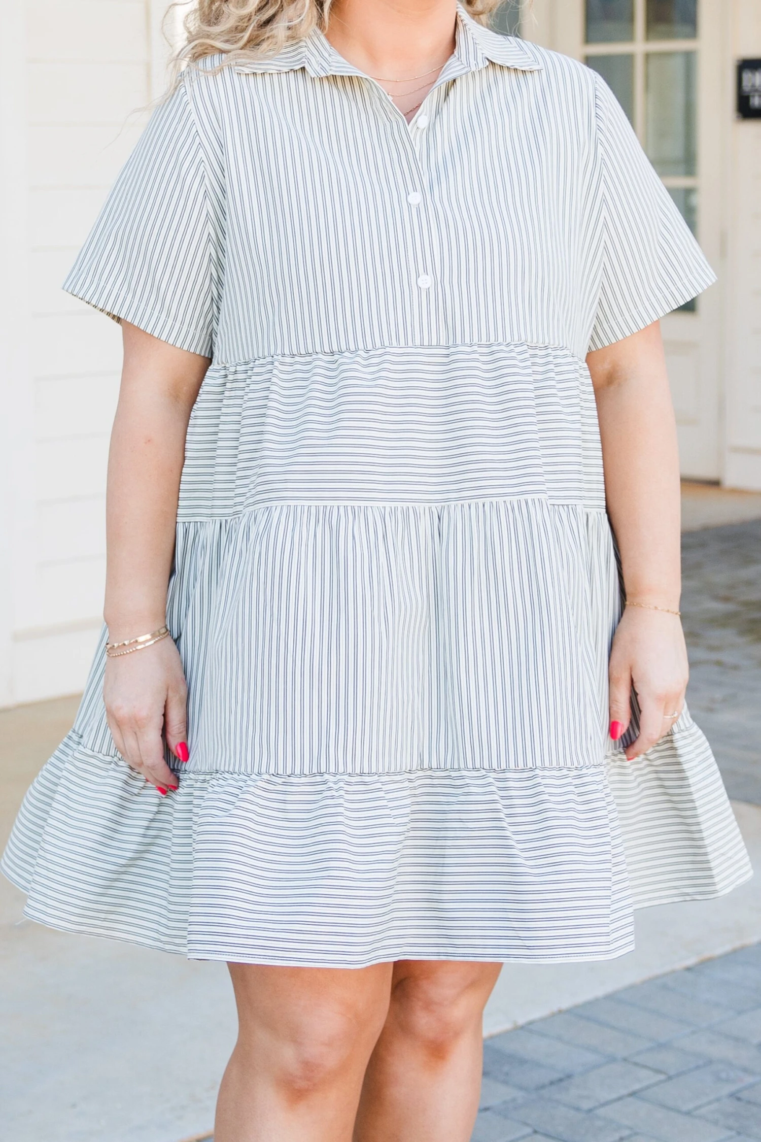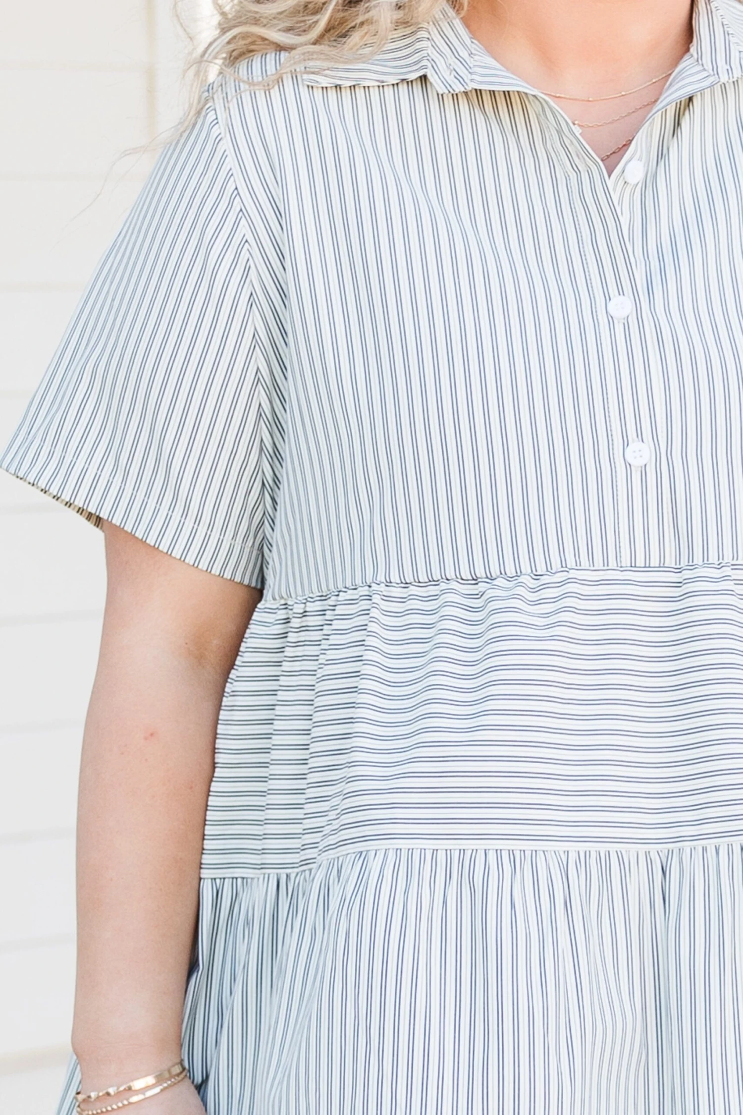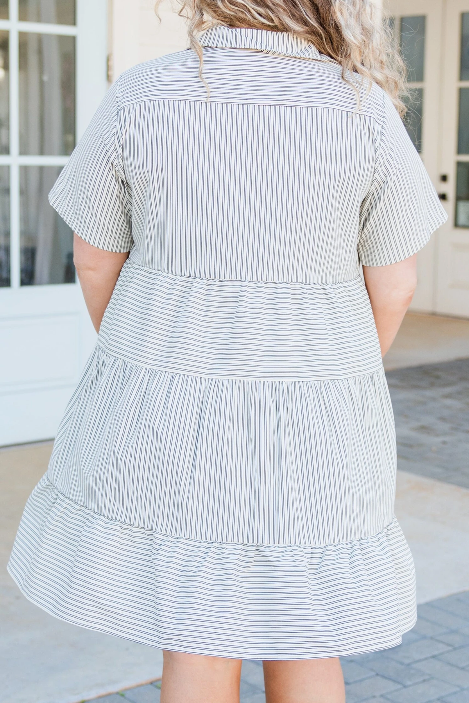 Hurry along to the checkout with this gorgeous dress! It is must-have addition to your wardrobe! The babydoll style and timeless stripe pattern are so classic, while the neutral color adds versatility! Stay stylishly comfortable with this essential piece!