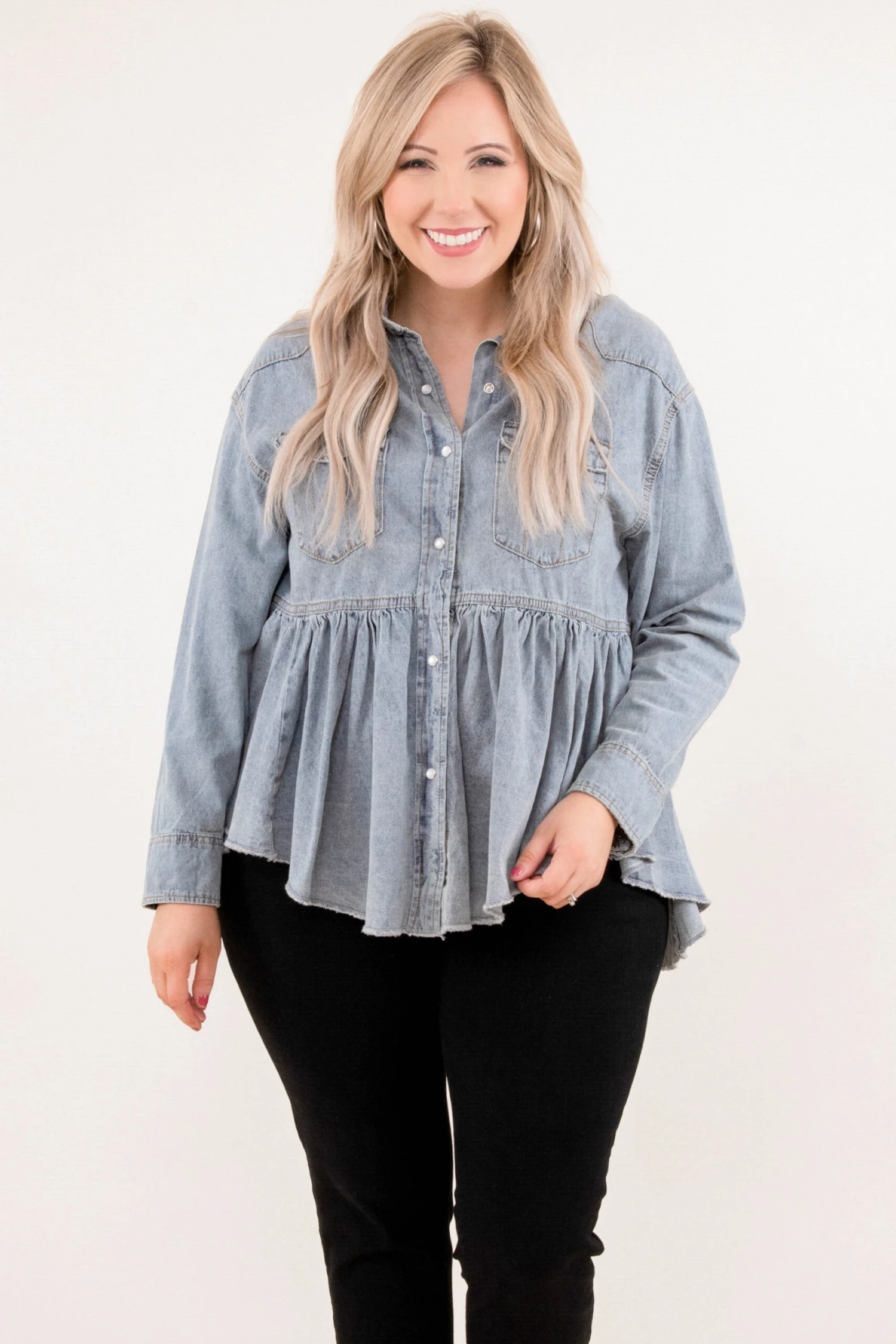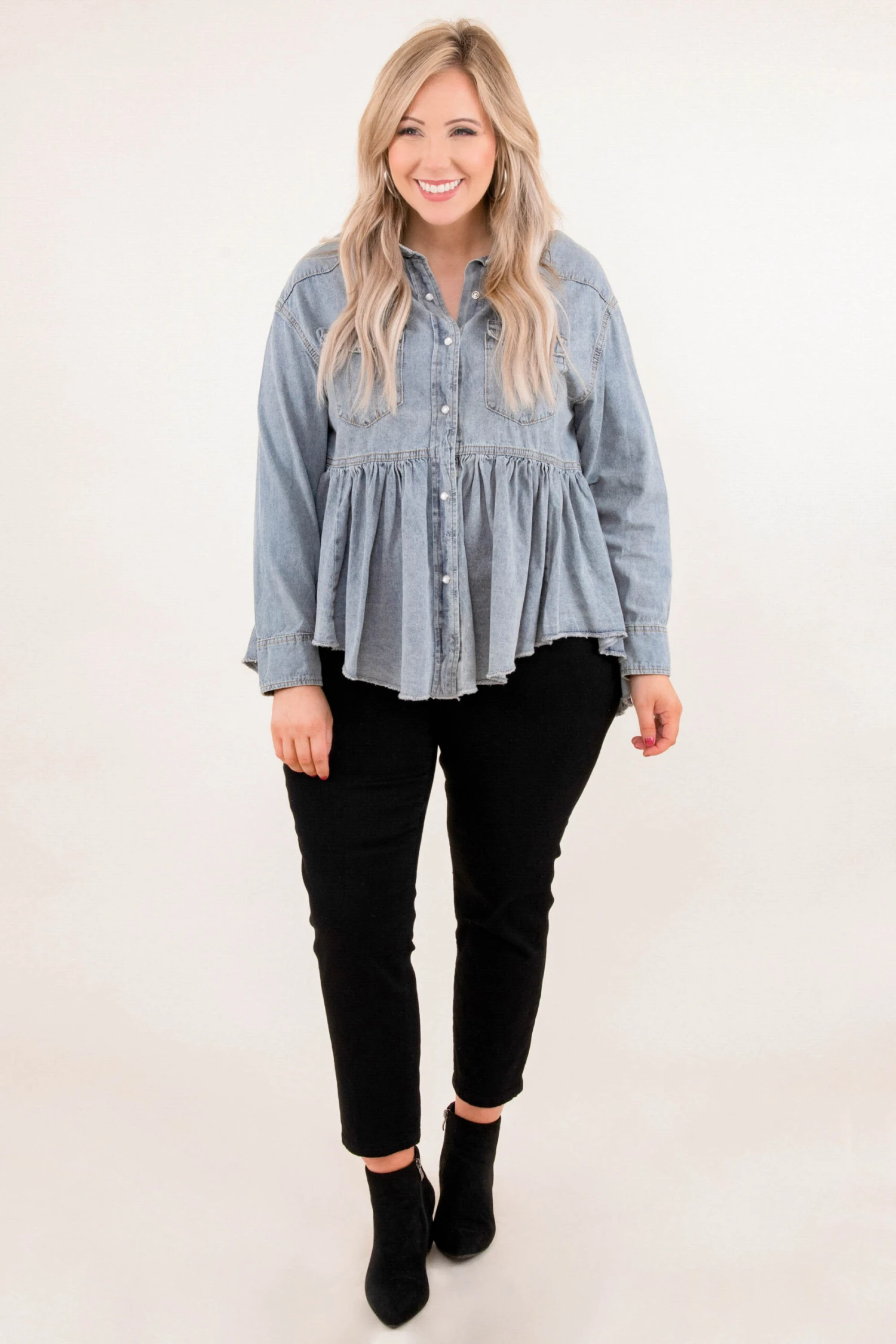 We don’t want to live any longer without this top! It features a classic denim fabric with a cool babydoll fit! It’s comfortable for all-day wear, has a flowy fit, and features the perfect length to pair with all of your jeans and jeggings!