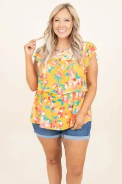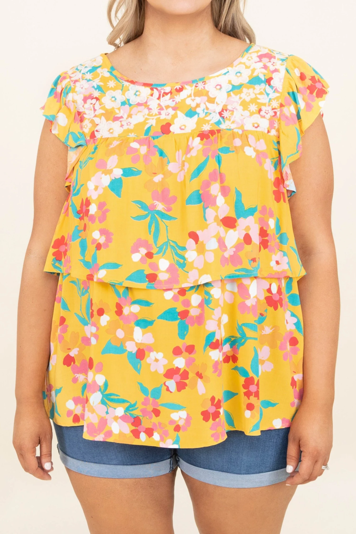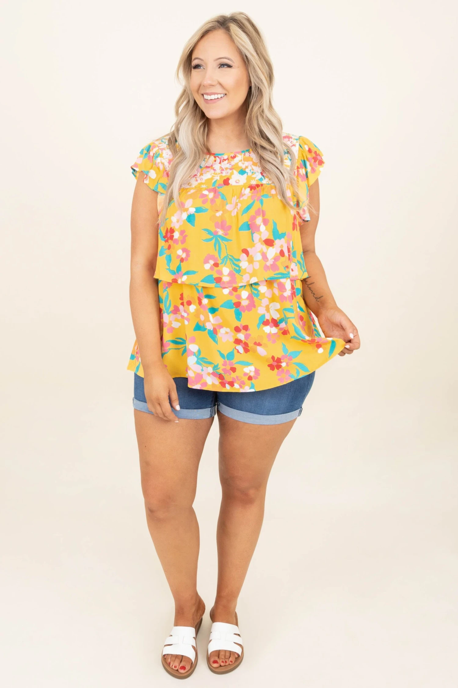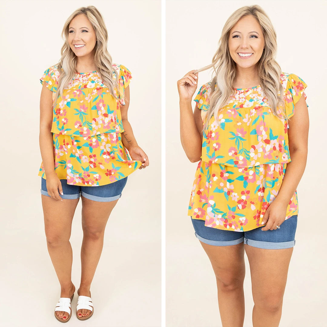 We gotta know how much you love this top! The marigold color complements the teal so well and the floral pattern is super cute! The embroidered flowers at the top have us obsessing and the tiered style is our favorite! Style this with jean shorts and some slides for a fresh off the runway look!