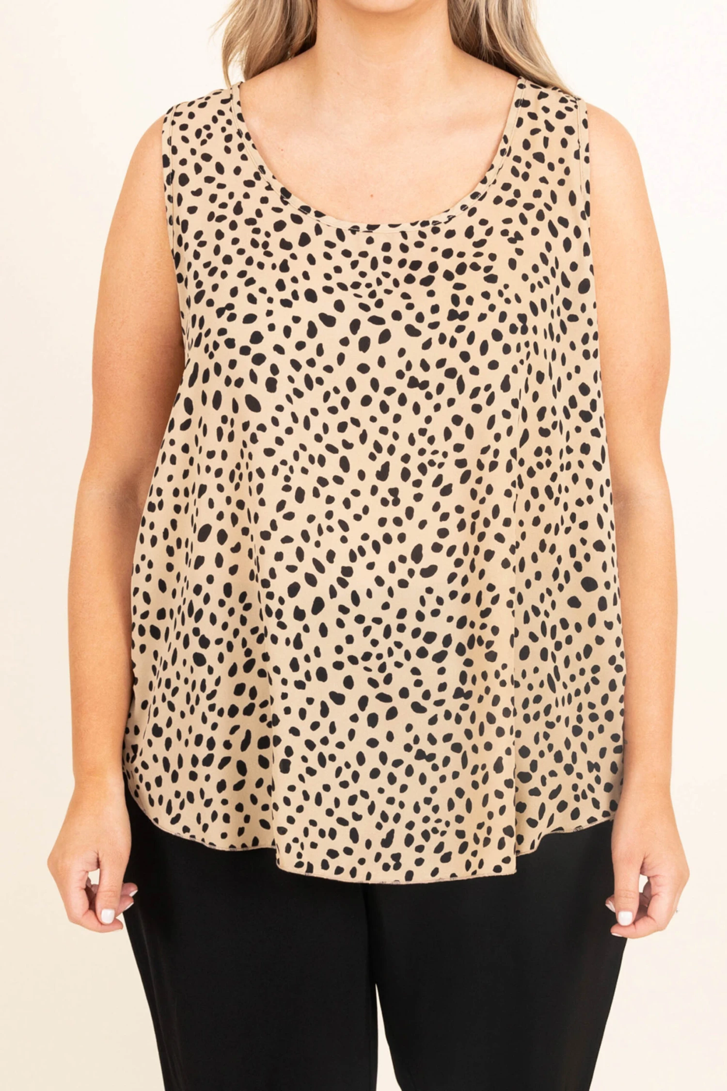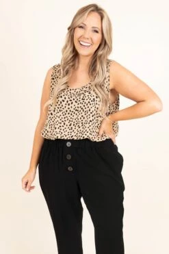 Join the club and grab this beauty! This top has a lovely taupe color with a super trendy leopard pattern that is a season fave! This tank has a flowy, flirty fit that is perfect for any occasion! Style it with some cute pants and a cute cardi for the office or skinnies and sandals for a classy casual look!