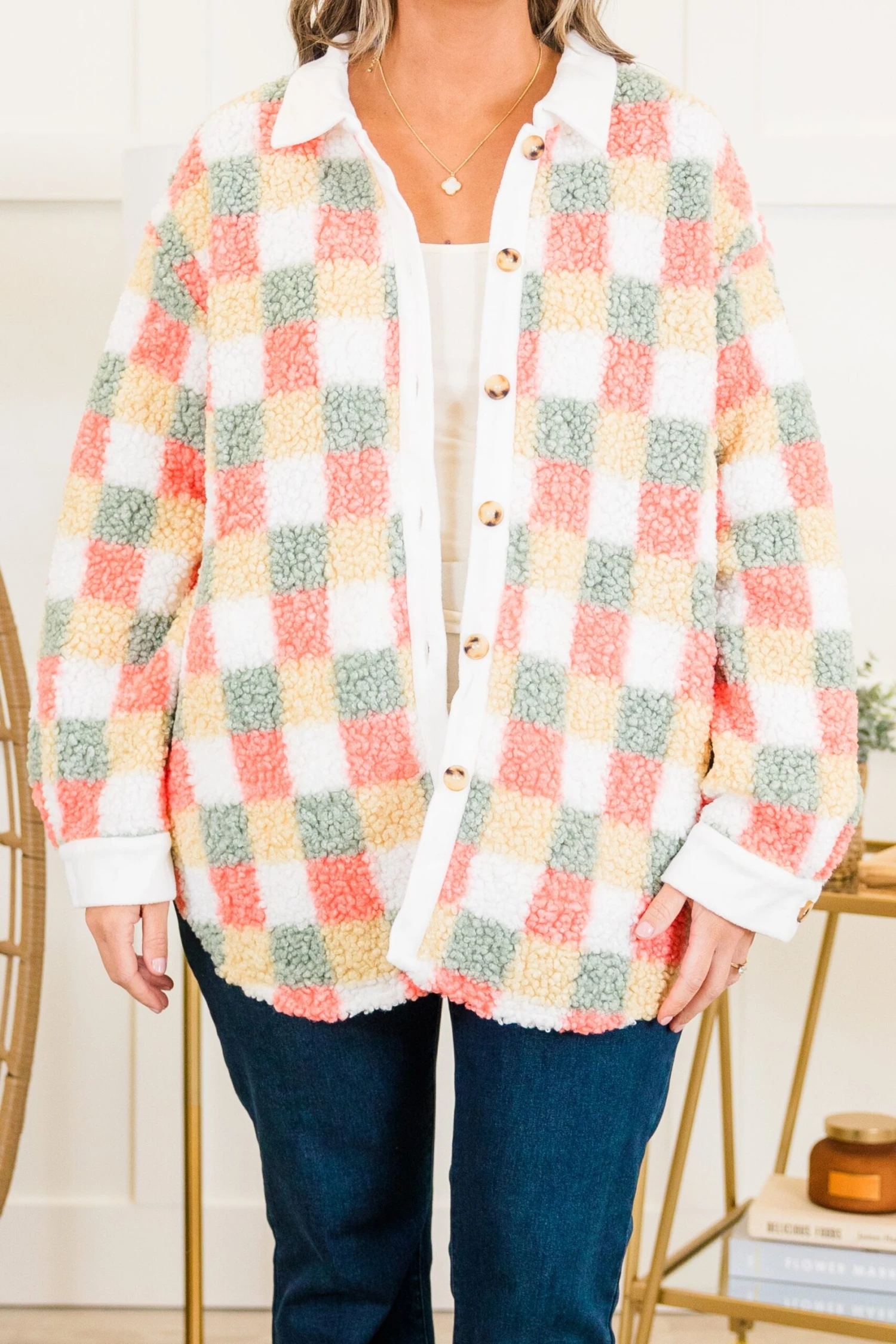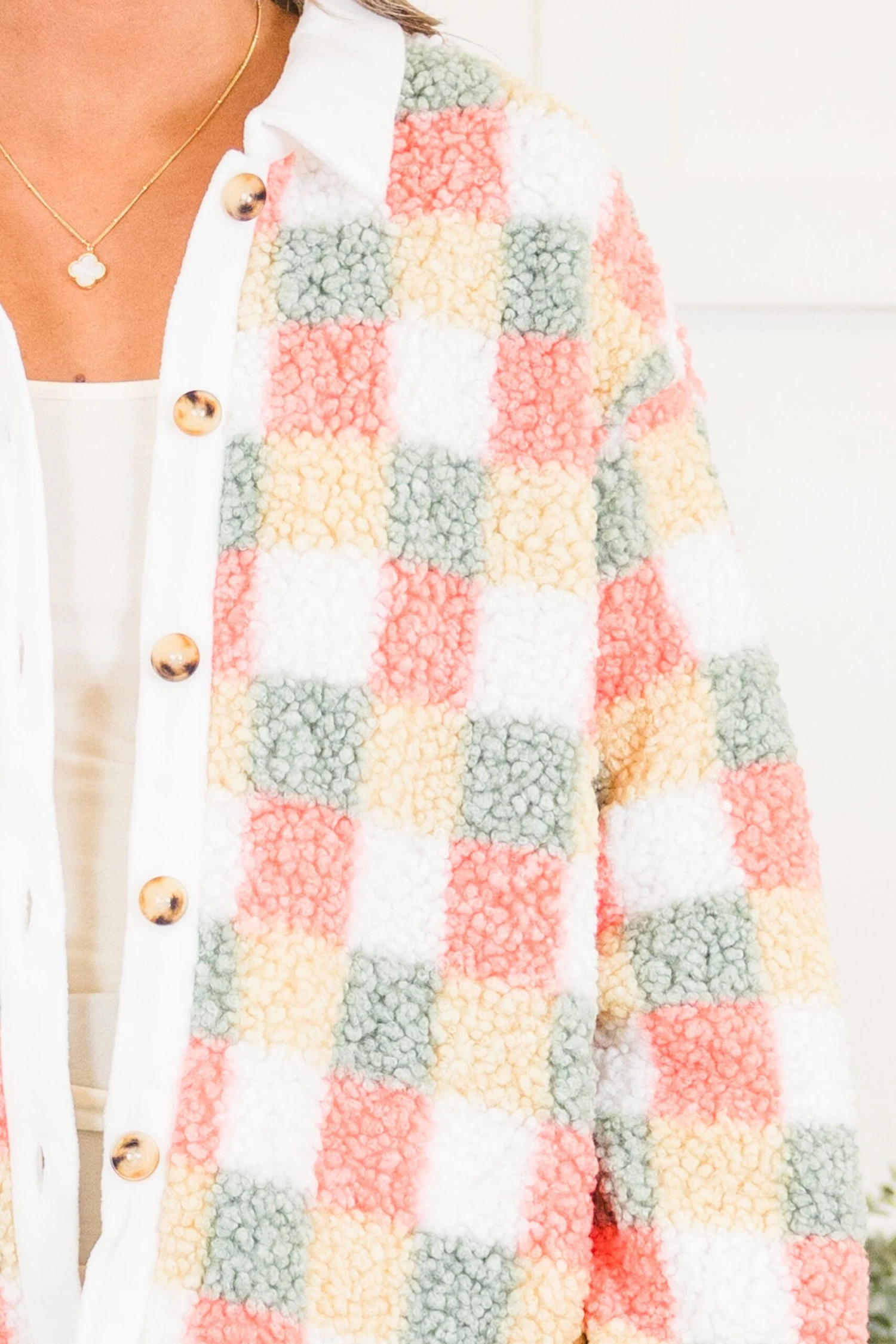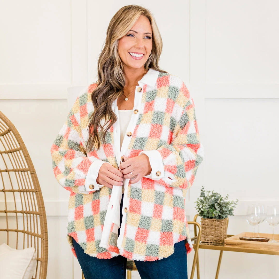 Transform your wardrobe with the I’ve Been Dreaming Shacket! This chic sage shacket features a cozy sherpa material and a trendy checkered pattern in sage, coral, and yellow! With a stylish collar detail and long sleeves, this jacket is the perfect addition to your fall and winter outfit!. Dreaming of a stylish and comfortable outfit? We’ve got you covered with this shacket!
