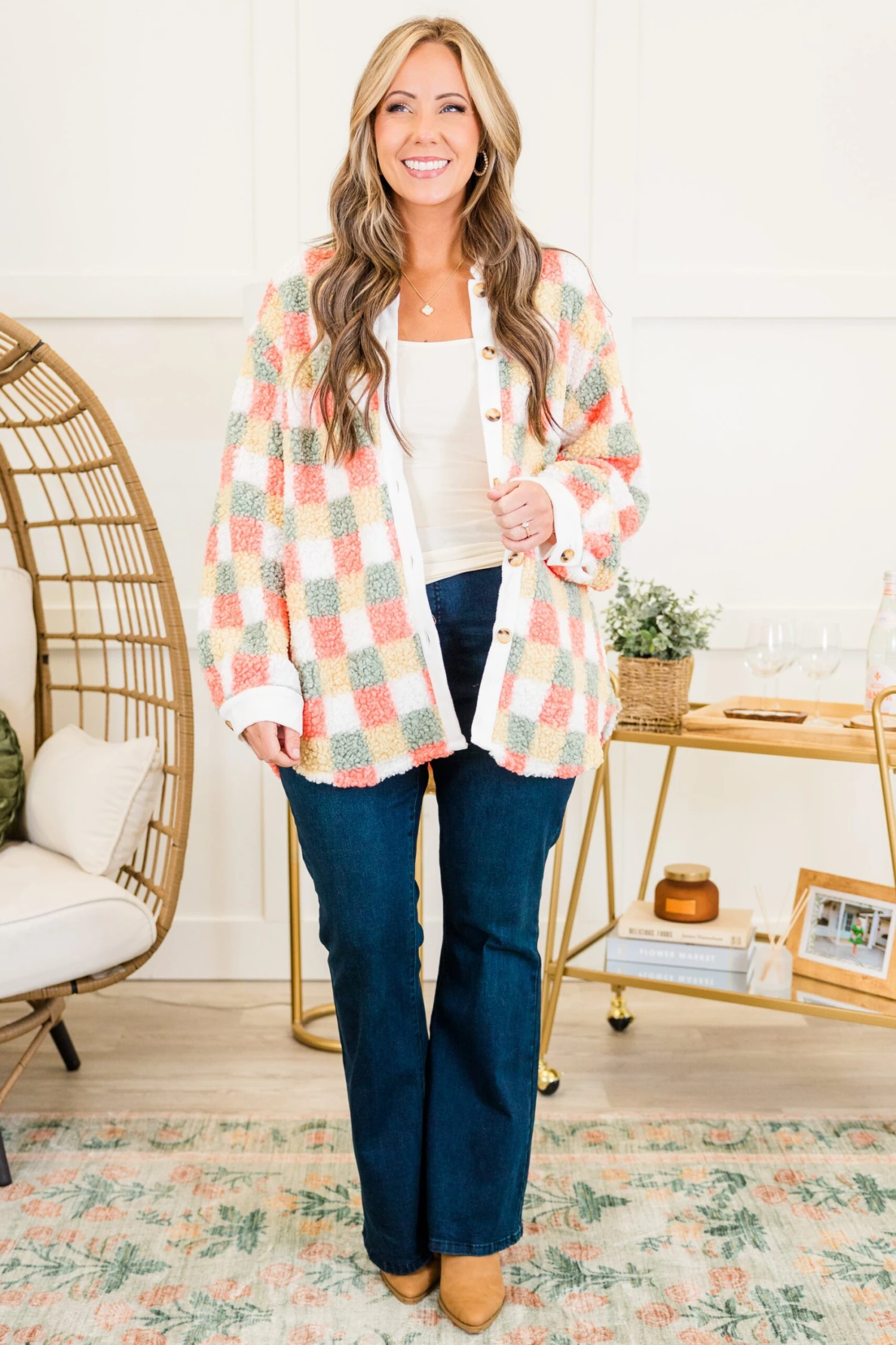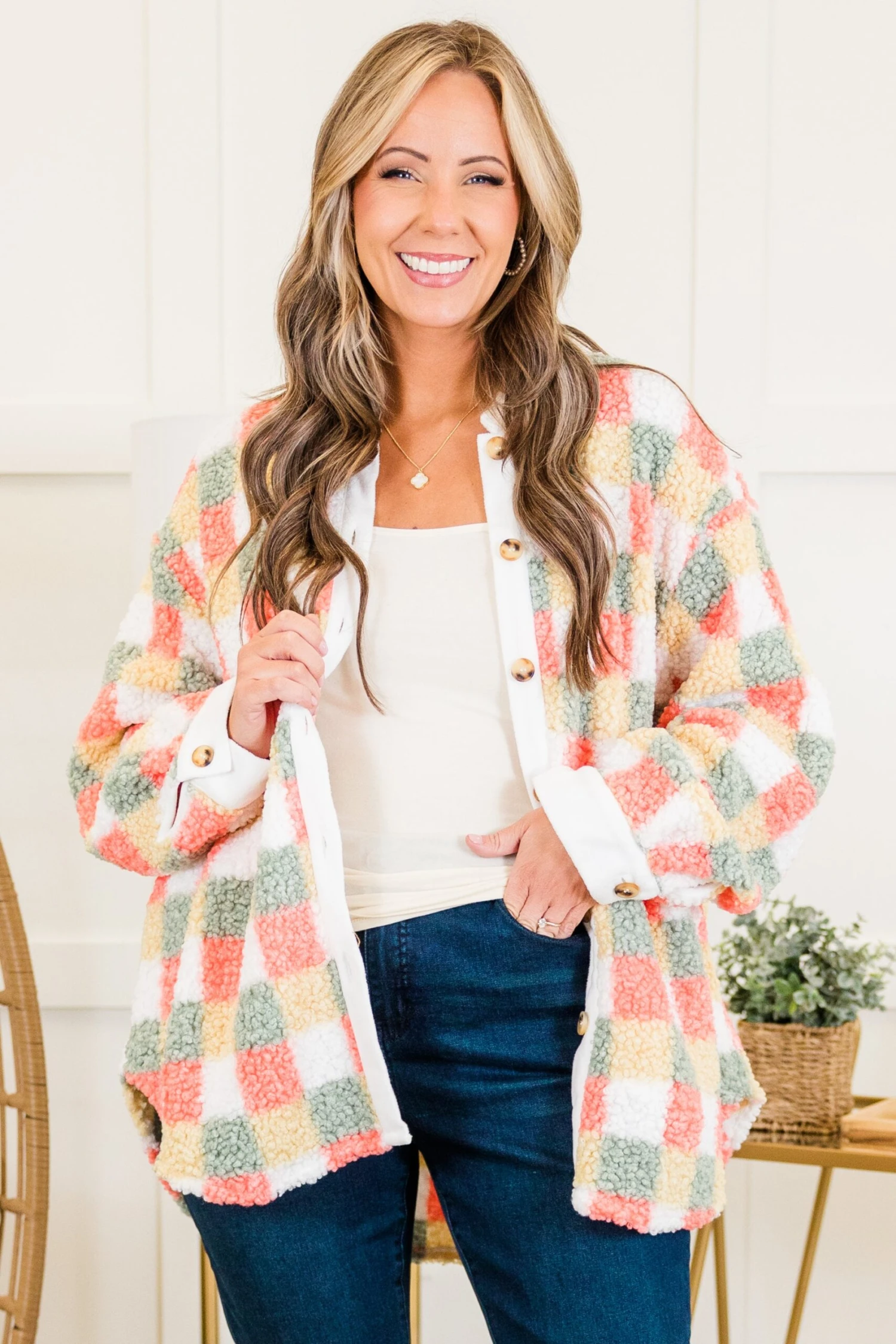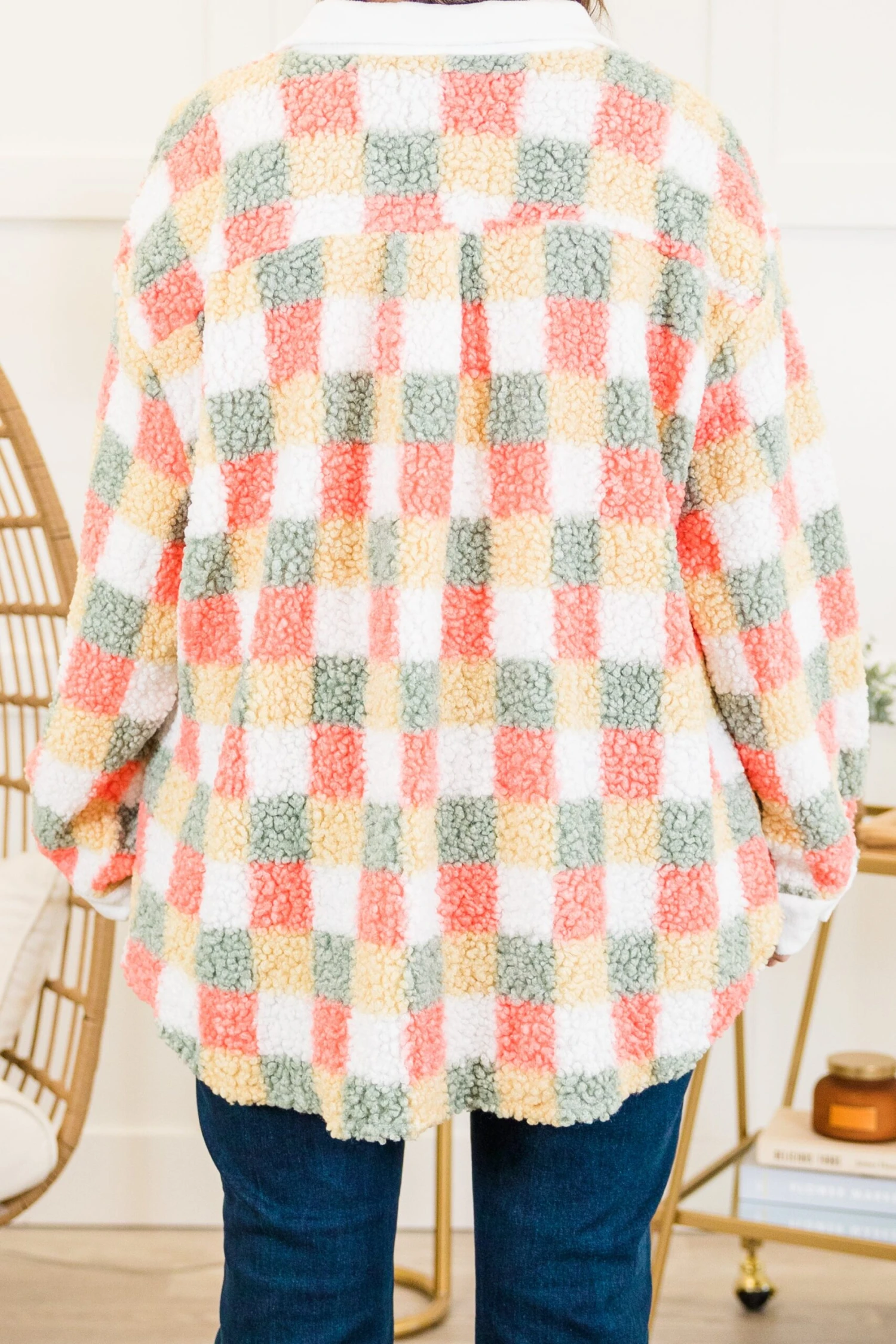 Transform your wardrobe with the I’ve Been Dreaming Shacket! This chic sage shacket features a cozy sherpa material and a trendy checkered pattern in sage, coral, and yellow! With a stylish collar detail and long sleeves, this jacket is the perfect addition to your fall and winter outfit!. Dreaming of a stylish and comfortable outfit? We’ve got you covered with this shacket!