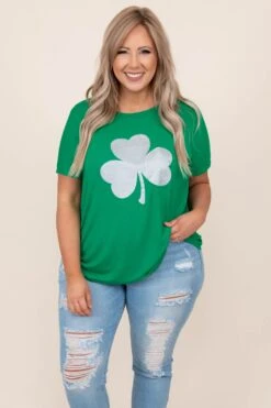 We’ve all seen greener days but this top is sure to make your days great! This tee has a simple graphic print with a bold green color that’s perfect for the season! It’s comfortable for all-day wear, has a figure-flattering fit, and can be styled with your favorite shoes and accessories! Pair this tee with shorts and sneakers for an easy everyday look!