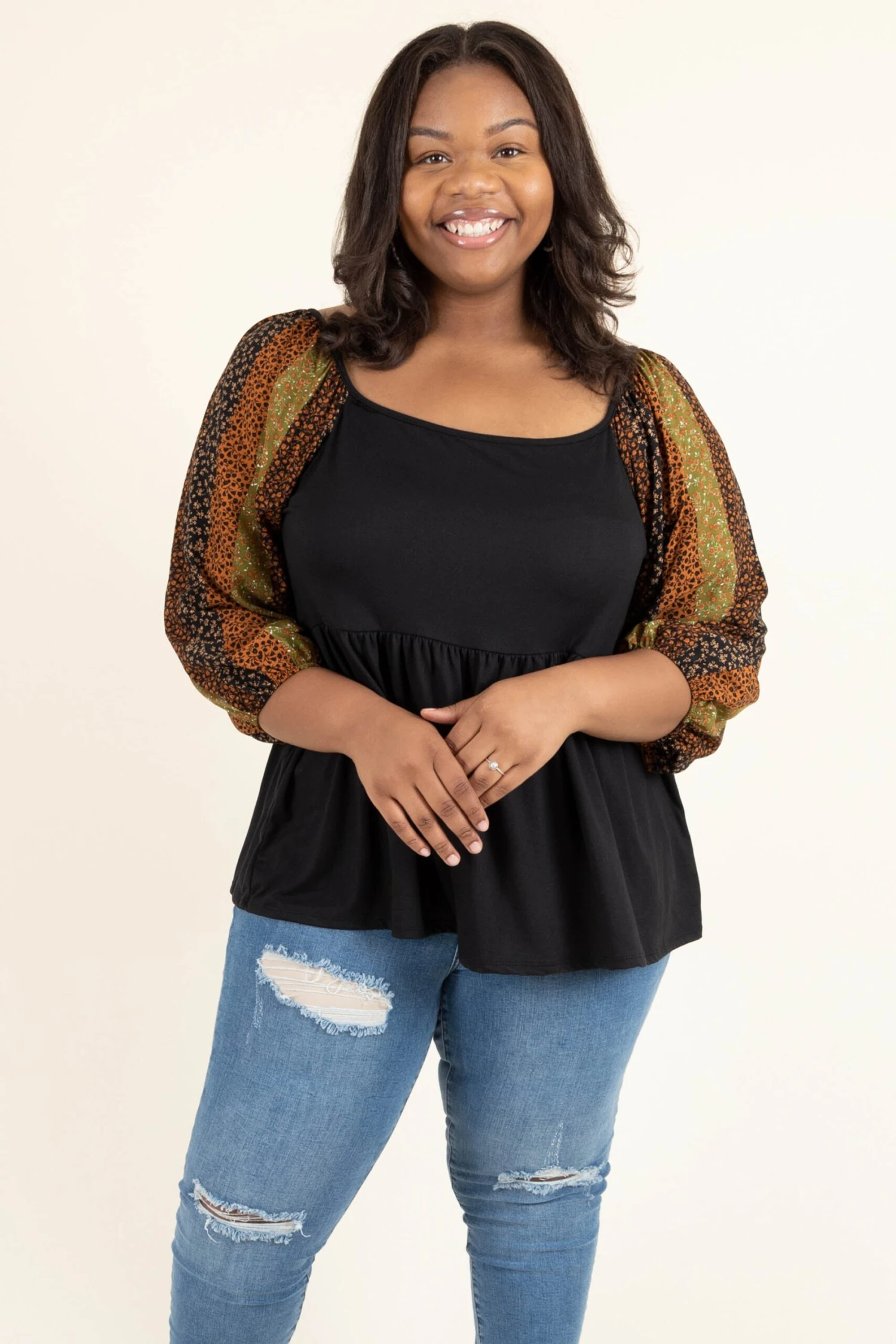 Imagine the possibilities this top would create in your wardrobe! The lovely baby doll style accentuates your waistline and the floral striped pattern on the sleeves is SO chic! Simply style this top with some skinnies and booties for a classic, trendy look!Â