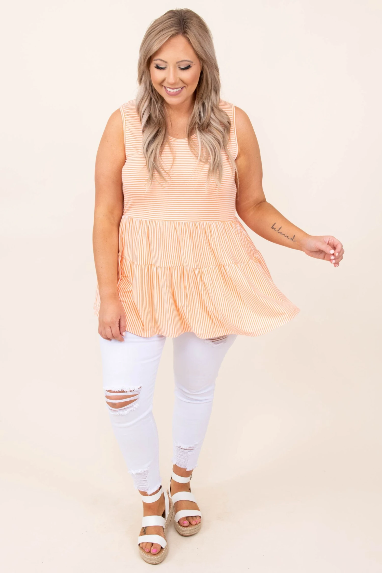 This top is so cute! This tank has a solid neutral color you can style for every occasion! It’s comfortable for all-day wear, has a figure-flattering fit, and features a classic babydoll style we adore! Pair this tank with shorts or skinnies for an effortlessly chic look!Â