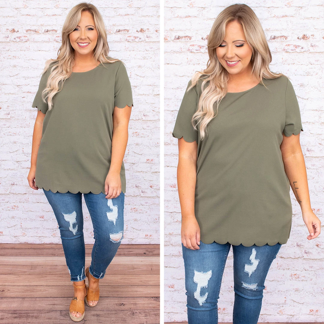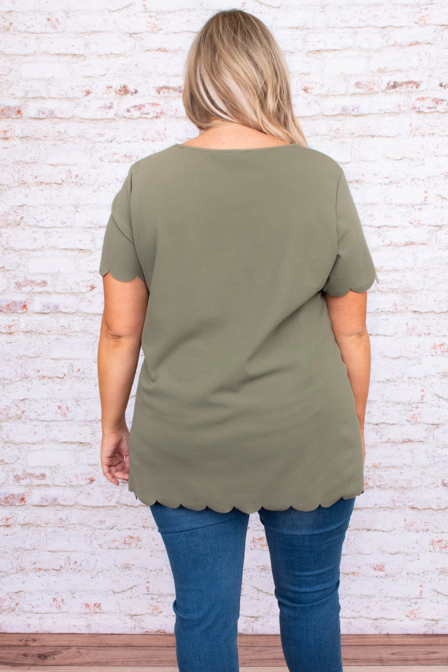 This top is incredibly beautiful! It has a beautiful green color and sweet scallop hem! It’s great for work and play!! Style it with a bold necklace and white skinnies for a super chic outfit!