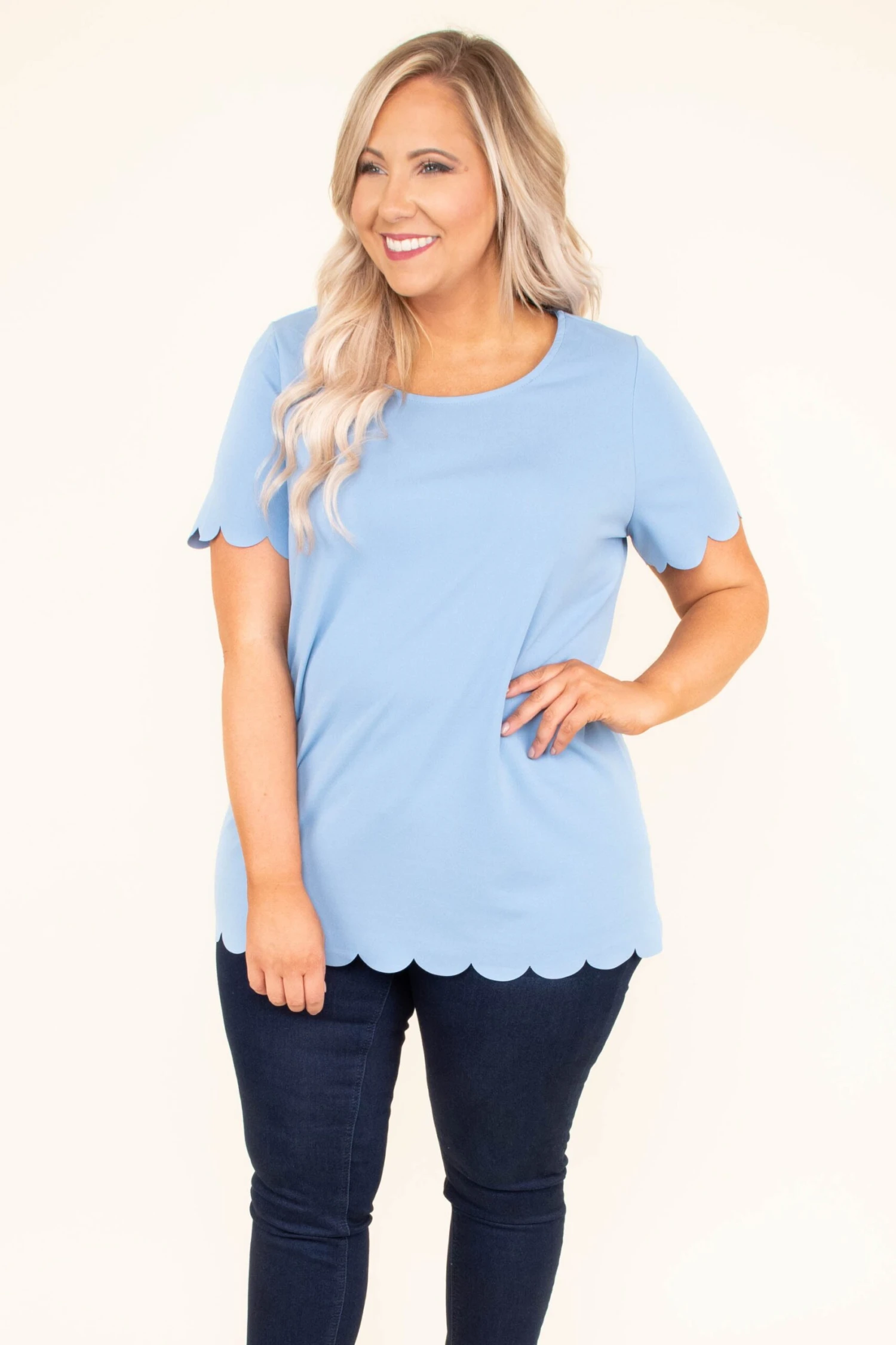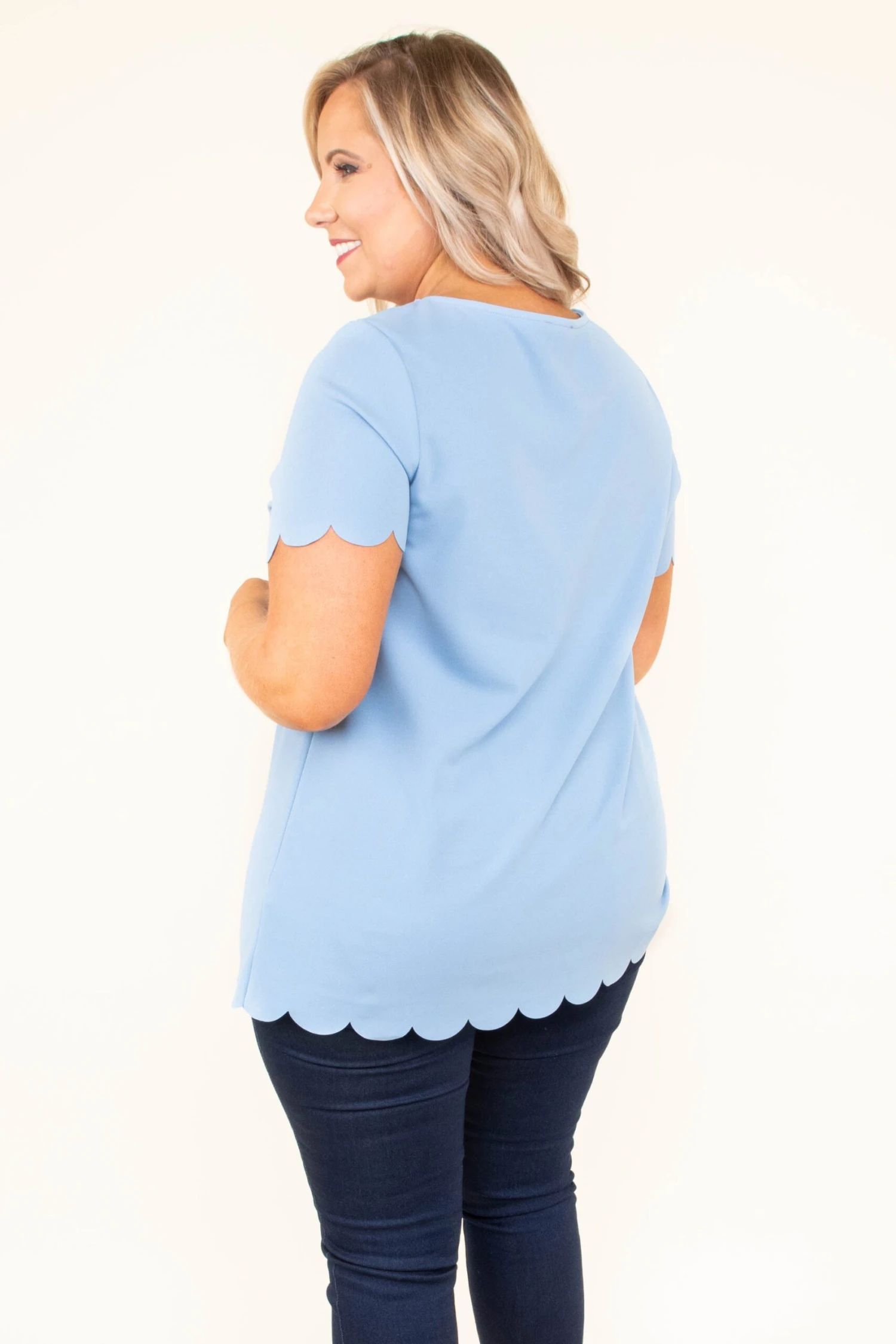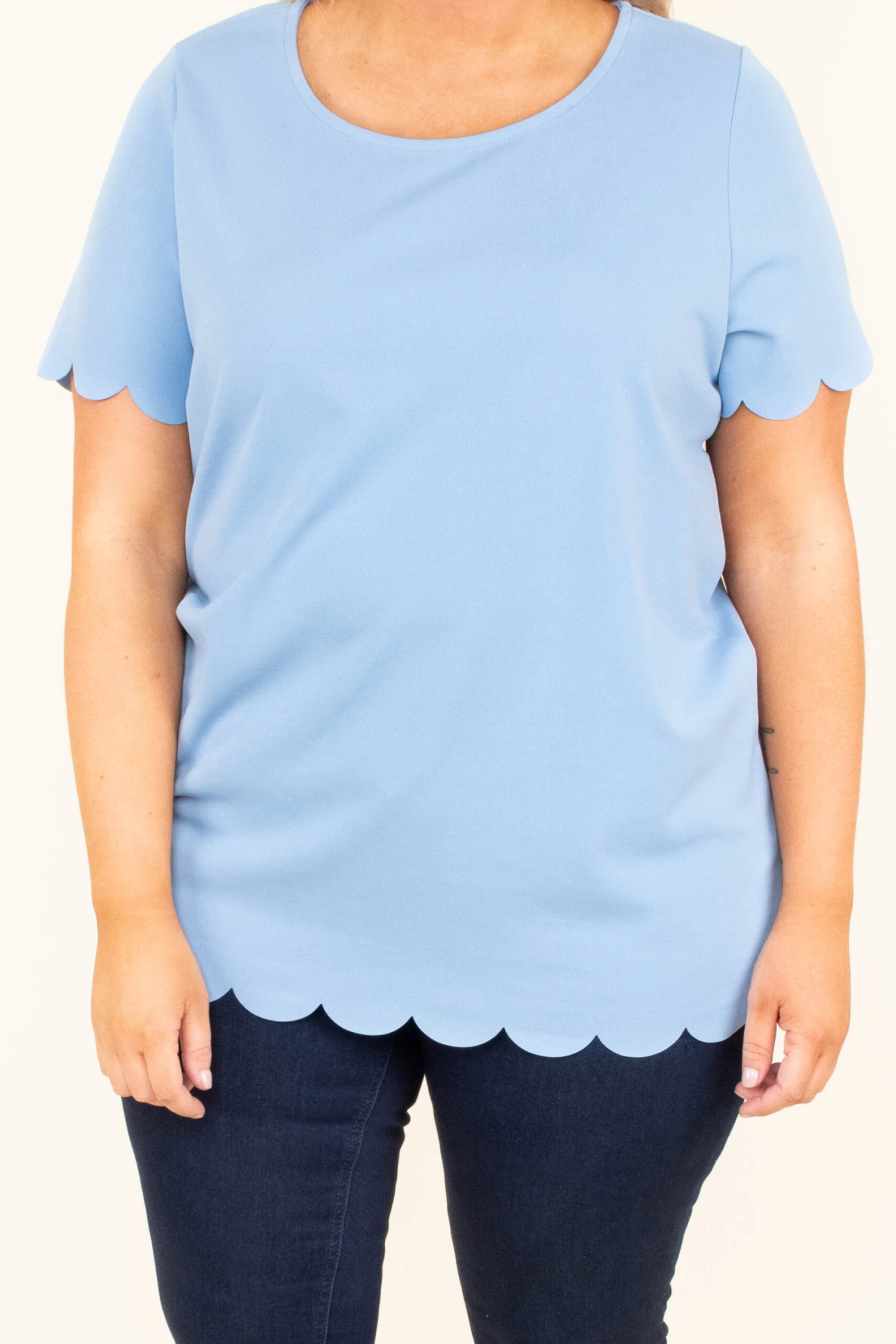This top is incredibly beautiful! It has a beautiful powder blue color and sweet scallop hem! It’s great for work and play!! Style it with a bold necklace and white skinnies for a super chic outfit!