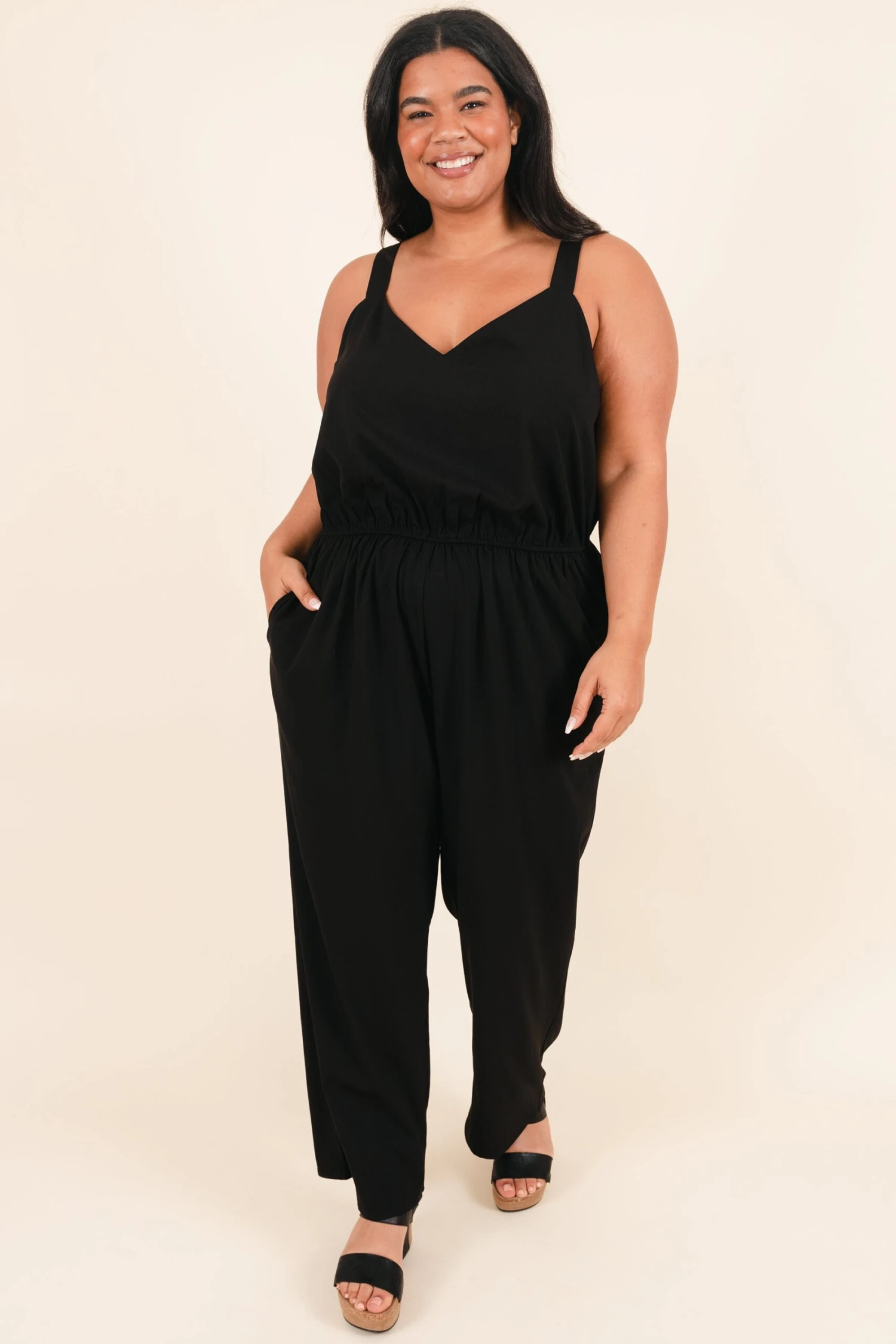 This fabulous jumpsuit is calling your name! It will be your go-to outfit for any style occasion! Featuring a neutral black color and functional pockets, this jumpsuit is simultaneously classy and functional! Perfect for date nights, the piece offers effortless sophistication and style!