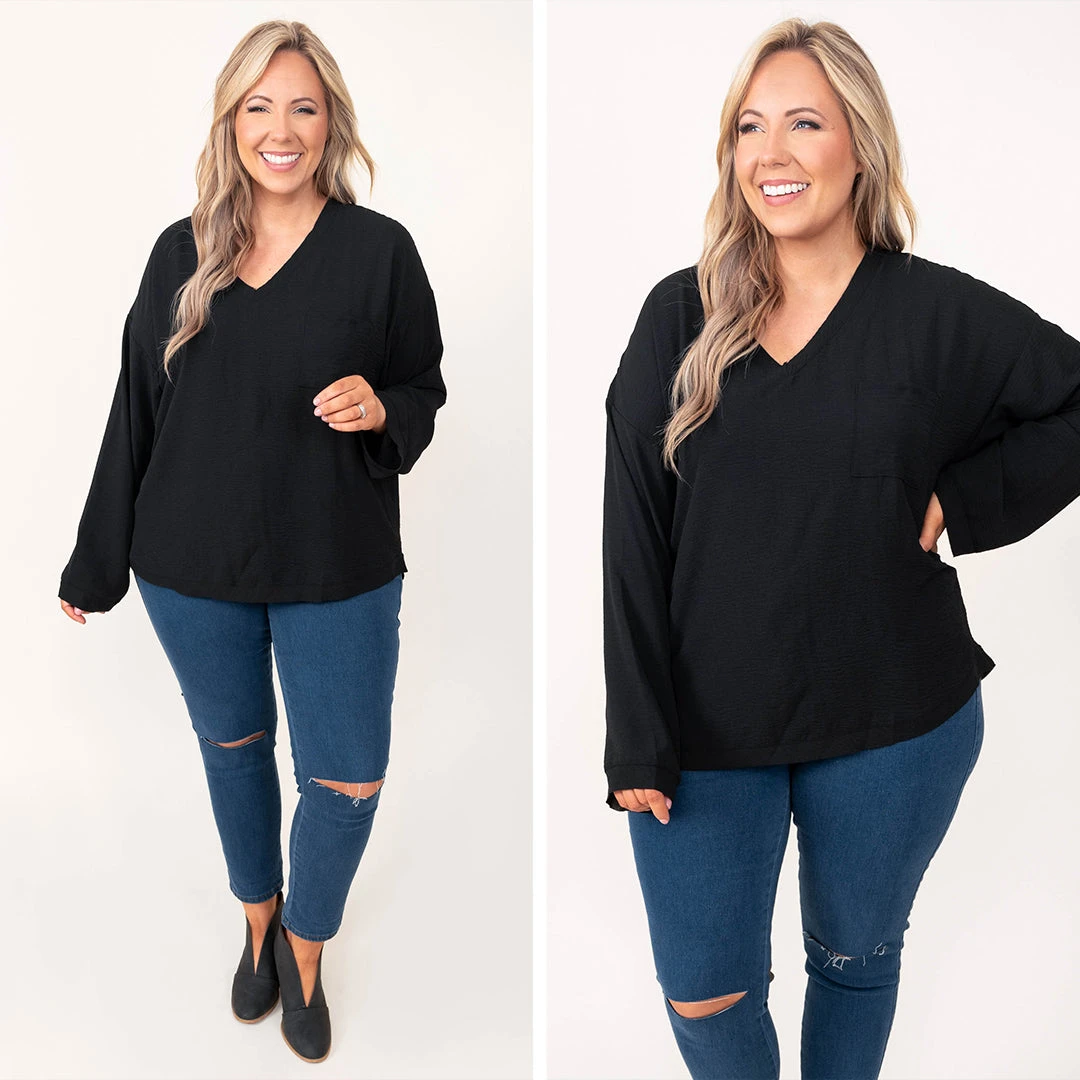 We cannot wait to see you in this top! It has a solid color you can dress up or down and style for every occasion! This top is so cute and is comfortable for all-day wear, plus it features a chic front pocket! Pair this top with skinnies and booties for an easy everyday look!Â